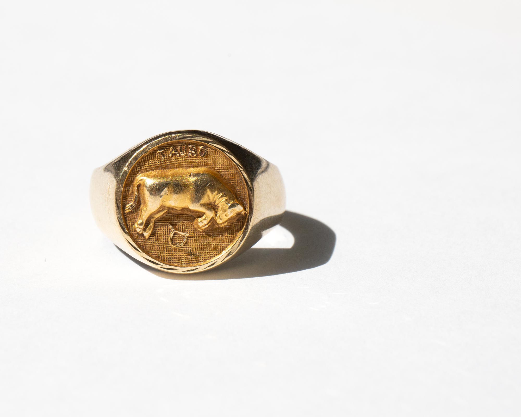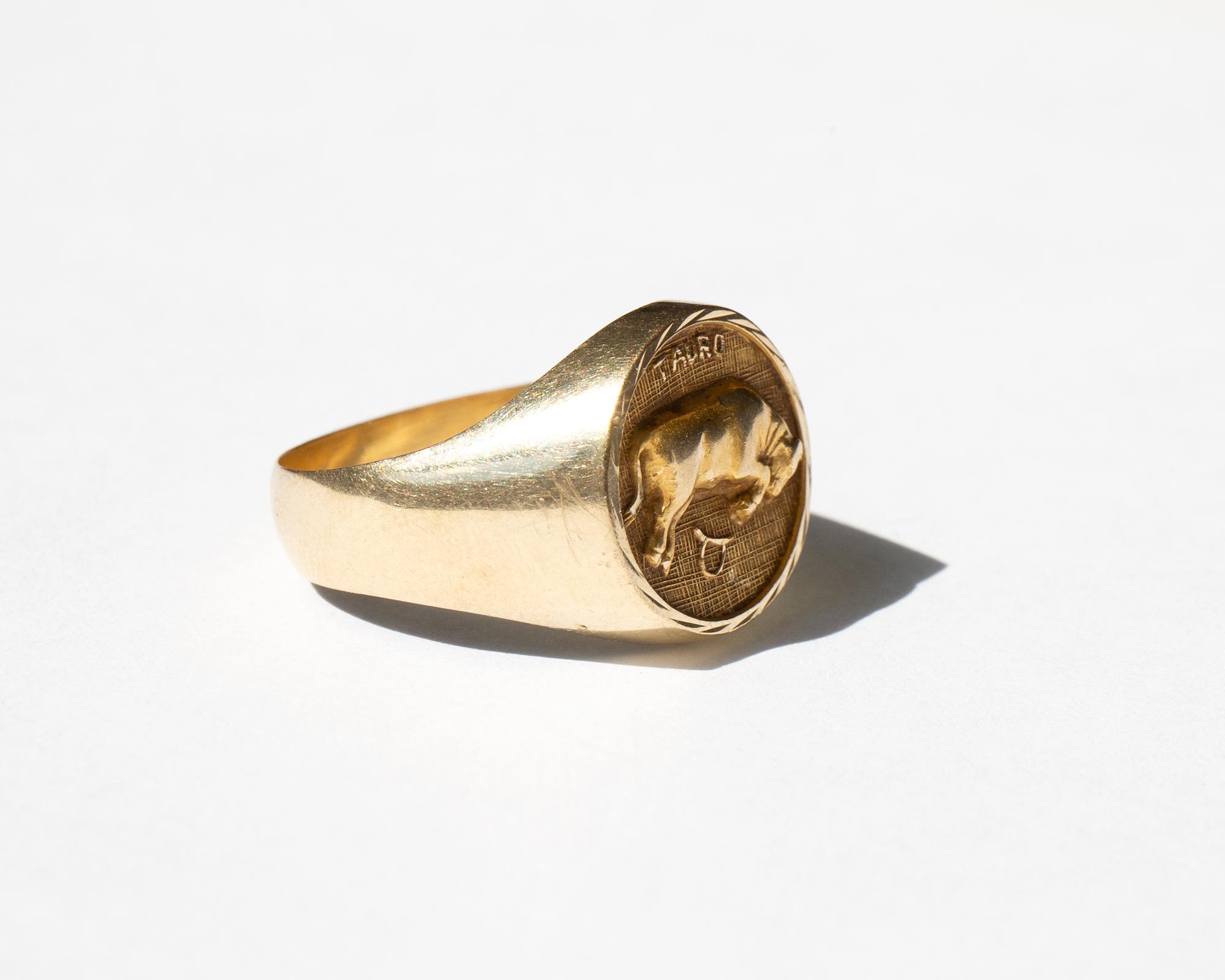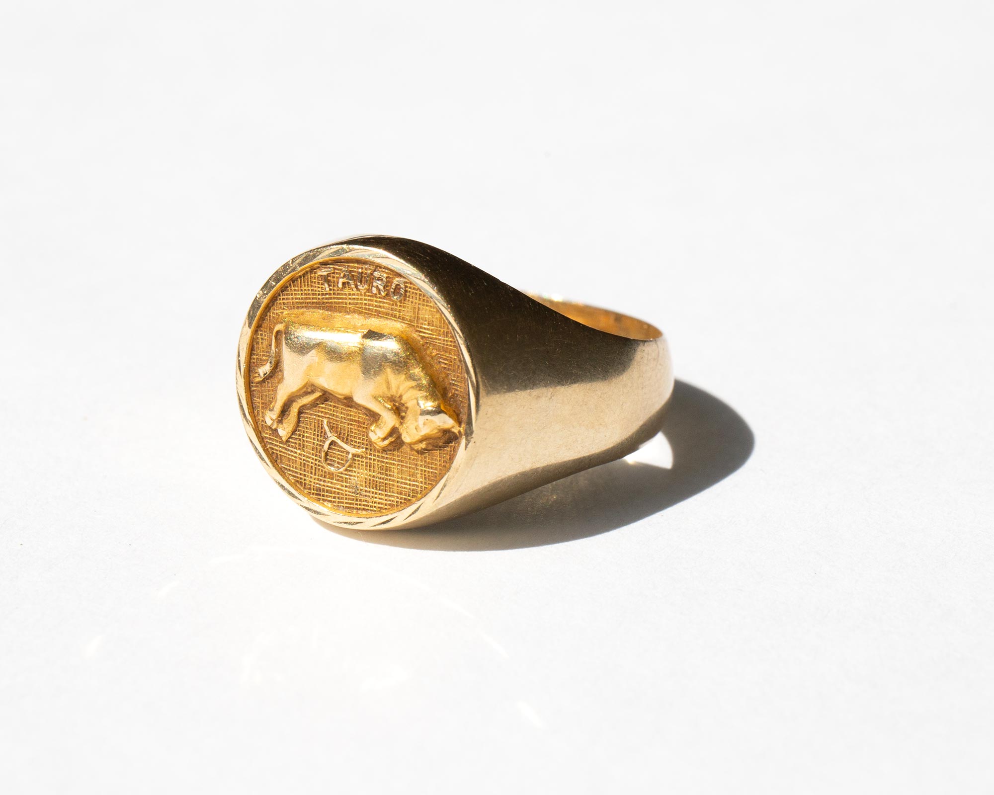 Signet-style 14k gold Taurus zodiac ring from the 1960s.