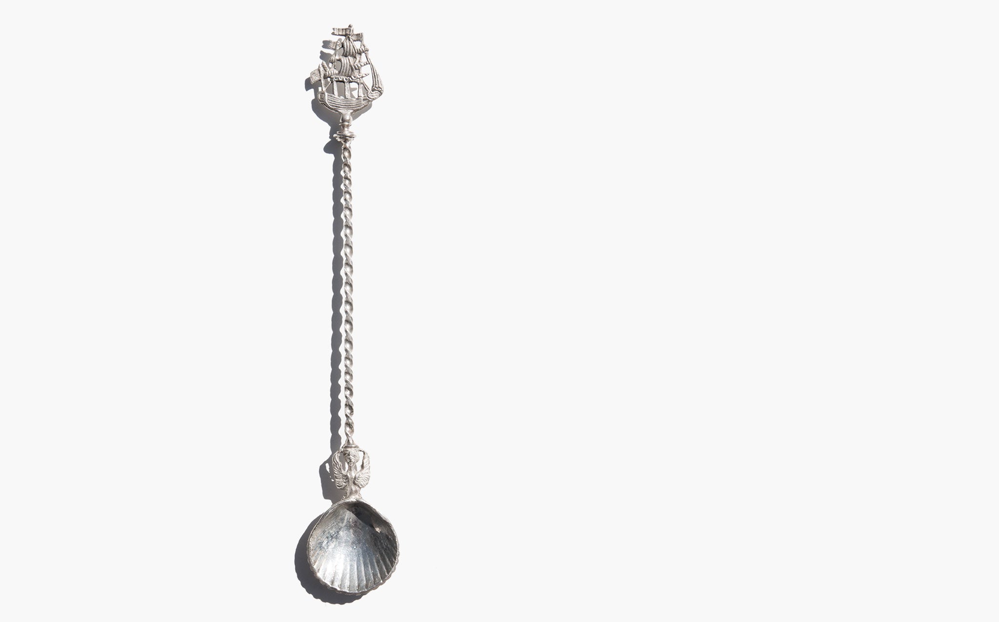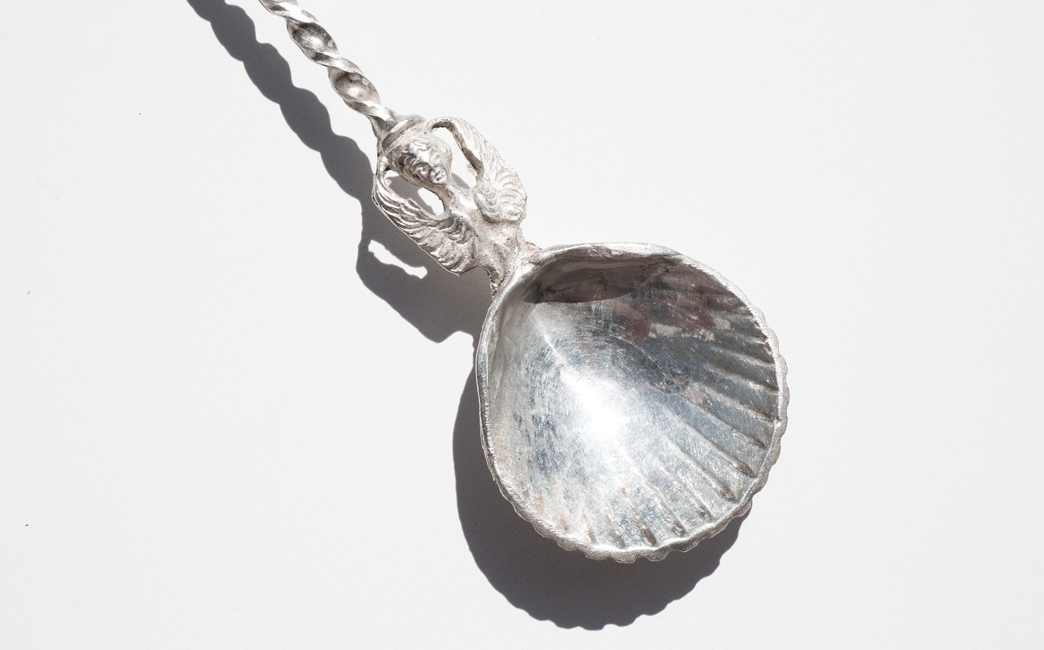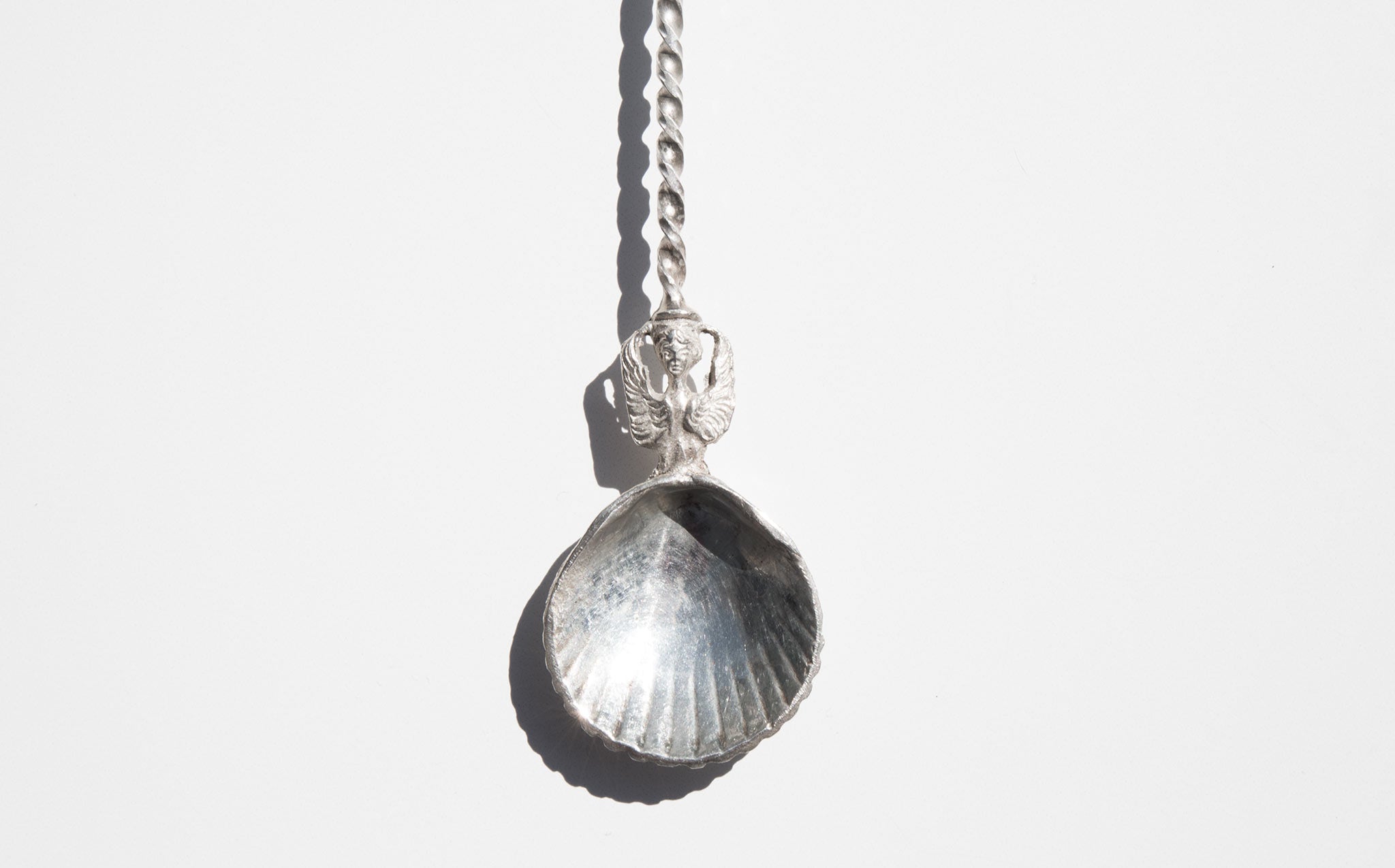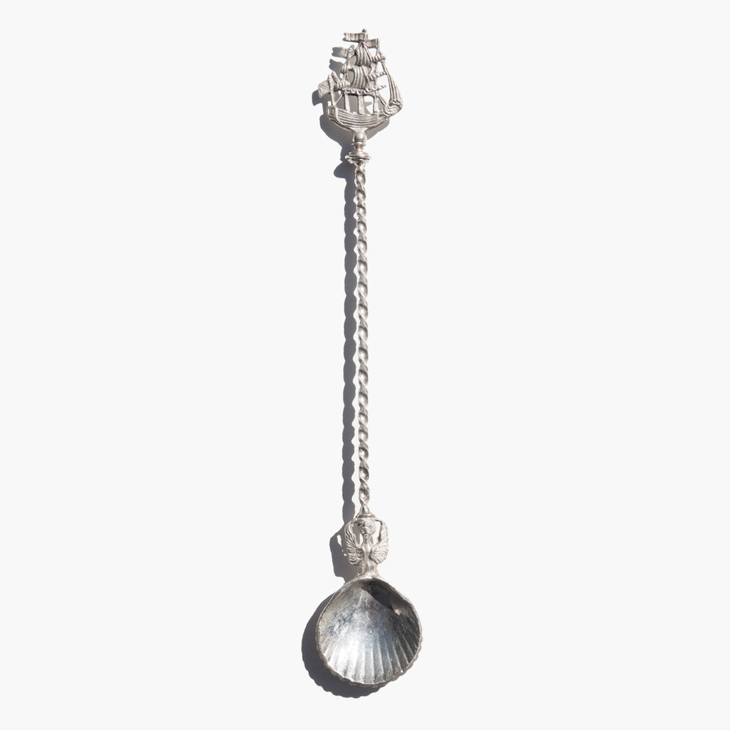 Sterling silver shell spoon with a ship and winged female, reminiscent of the figurehead on the bow of a ship that was thought to calm stormy seas.
