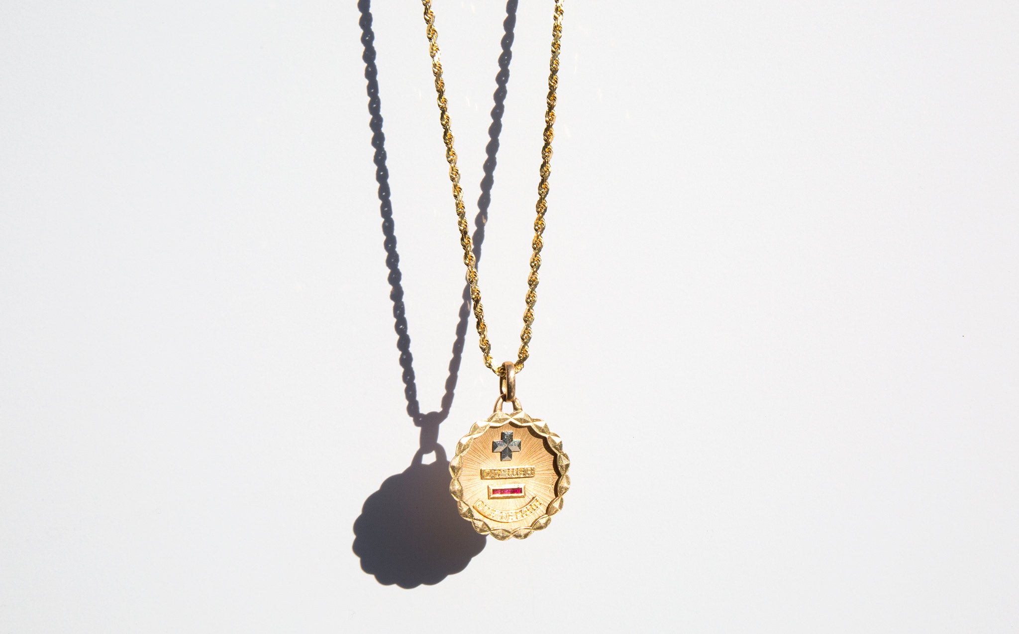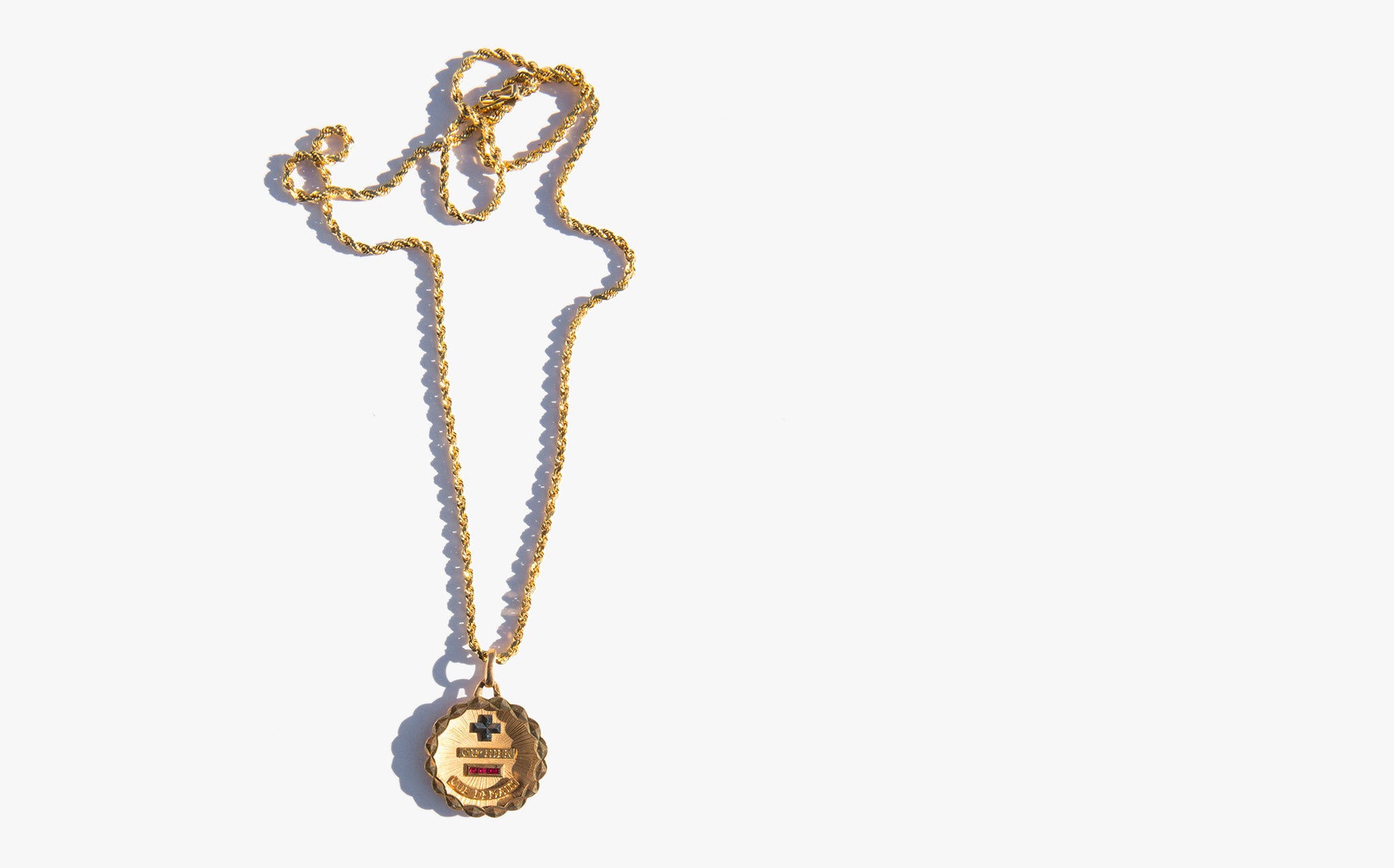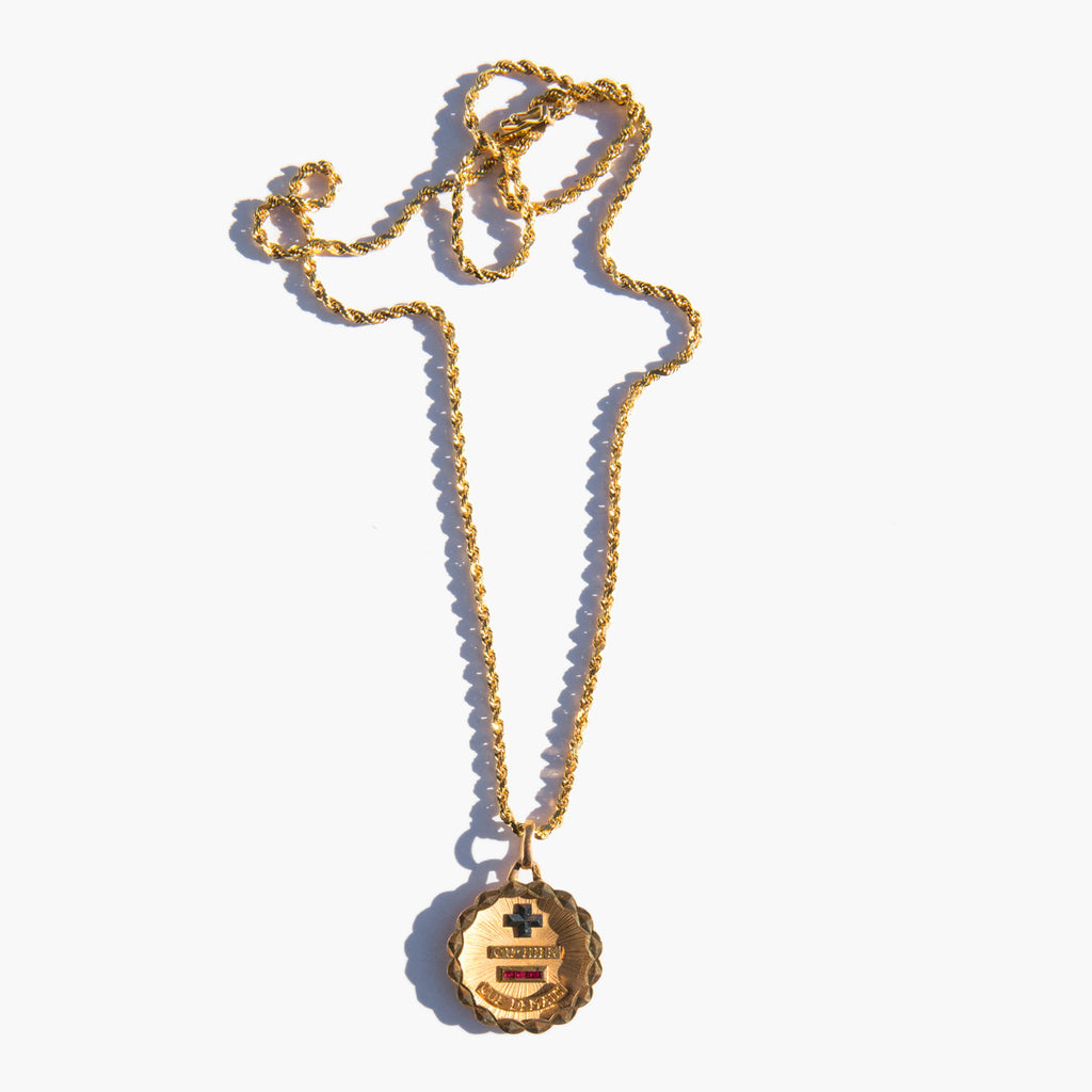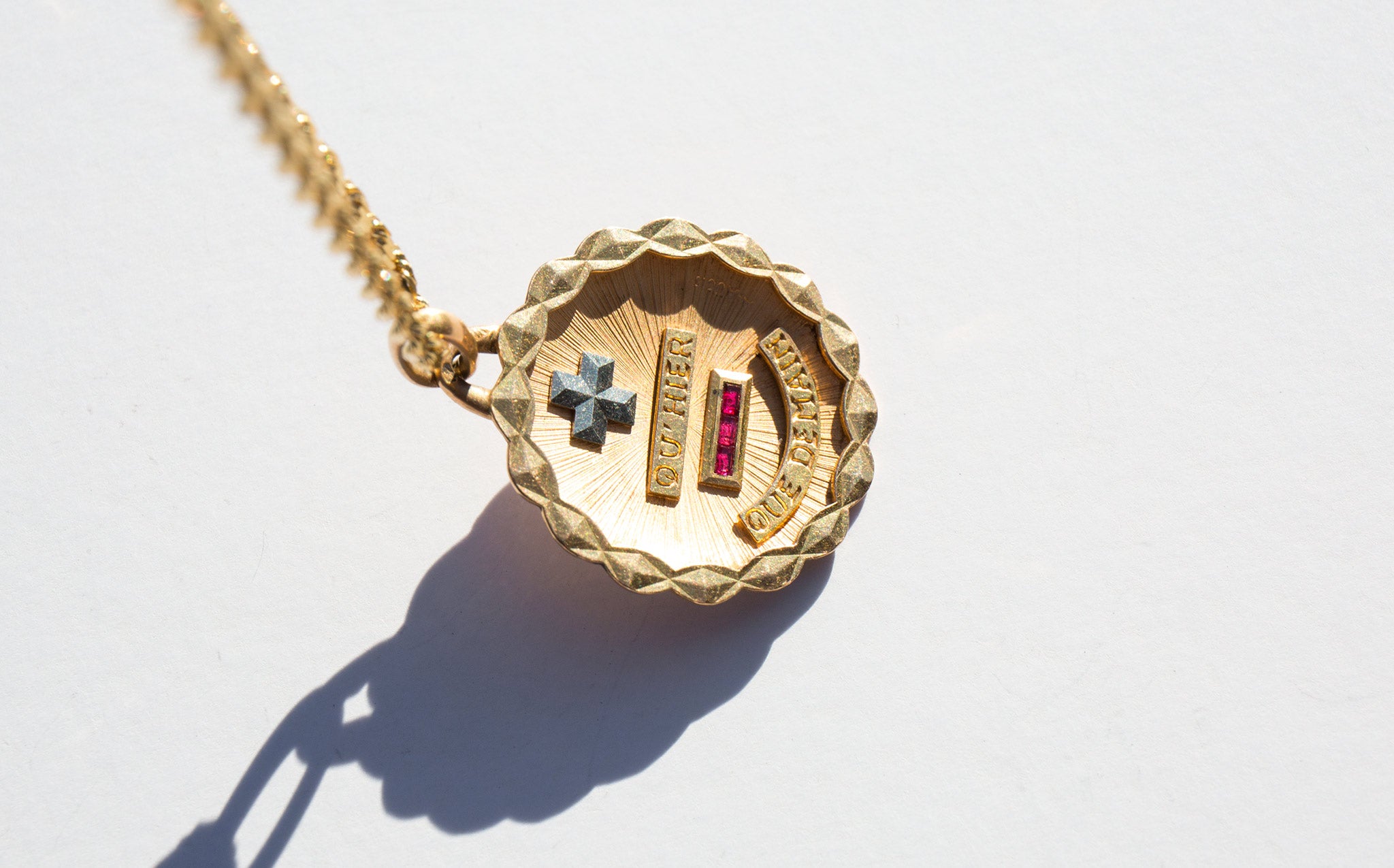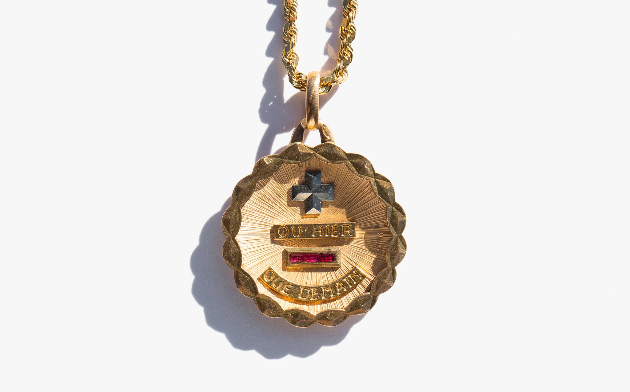 Solid 18k gold medallion with small rubies that reads "plus qu’hier, moins que demain" the French for “more than yesterday, less than tomorrow.” The phrase is attributed to the French poet and playwright Rosemonde Gérard, from a letter written to her husband Edmond Rostand (the French poet and dramatist that created Cyrano de Bergerac) that reads "Car, vois-tu, chaque jour je t’aime davantage, Aujourd’hui plus qu’hier et bien moins que demain" translated For, you see, each day I love you more, Today more than yesterday and less than tomorrow.)”