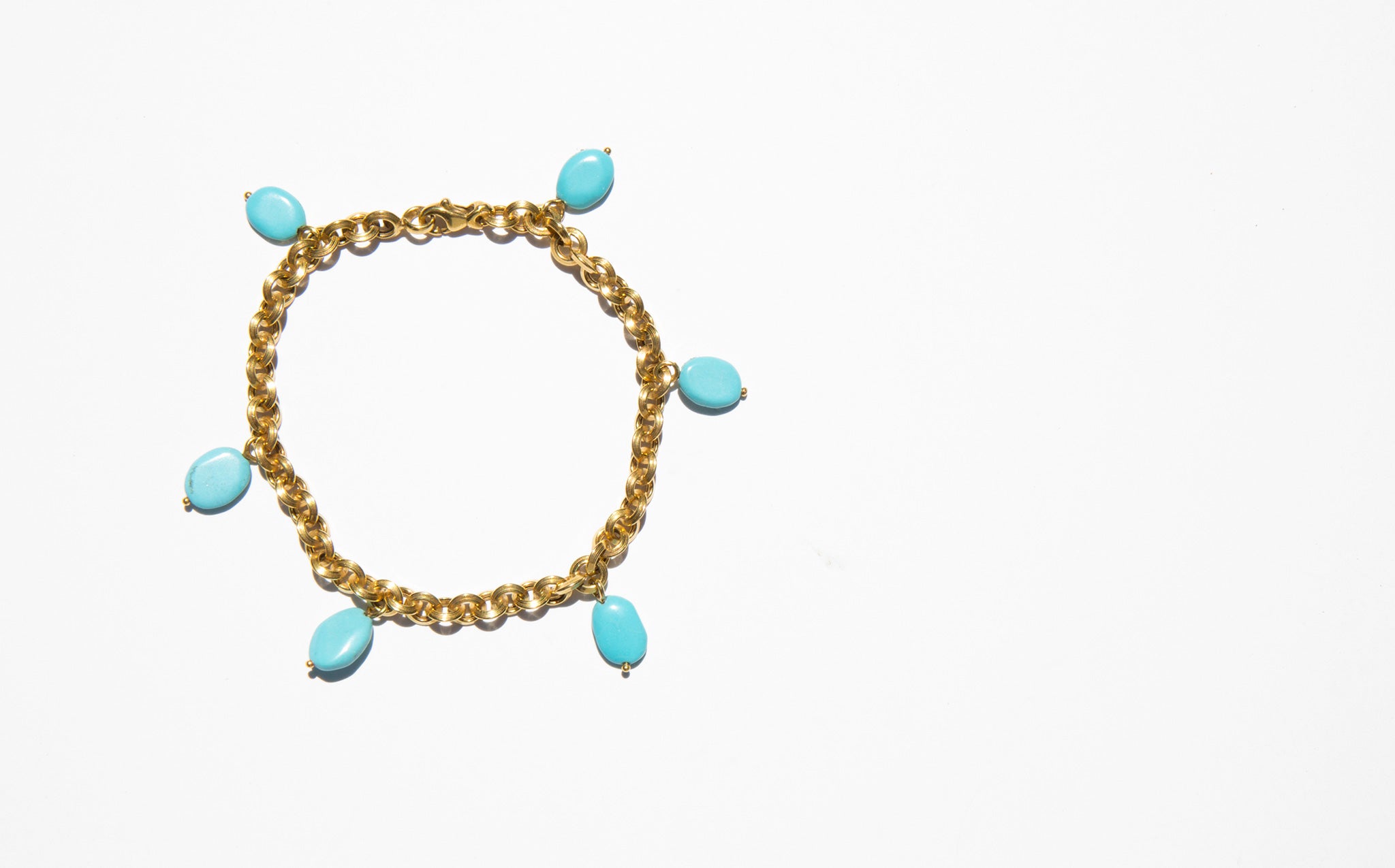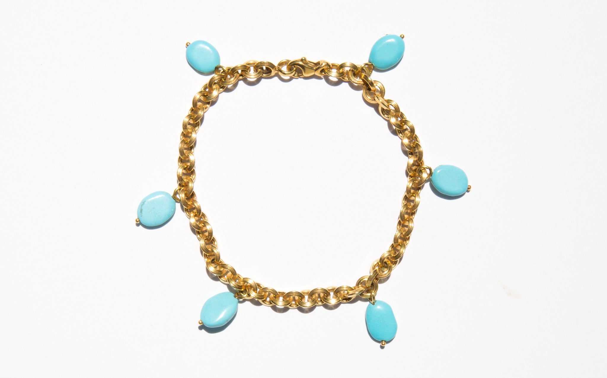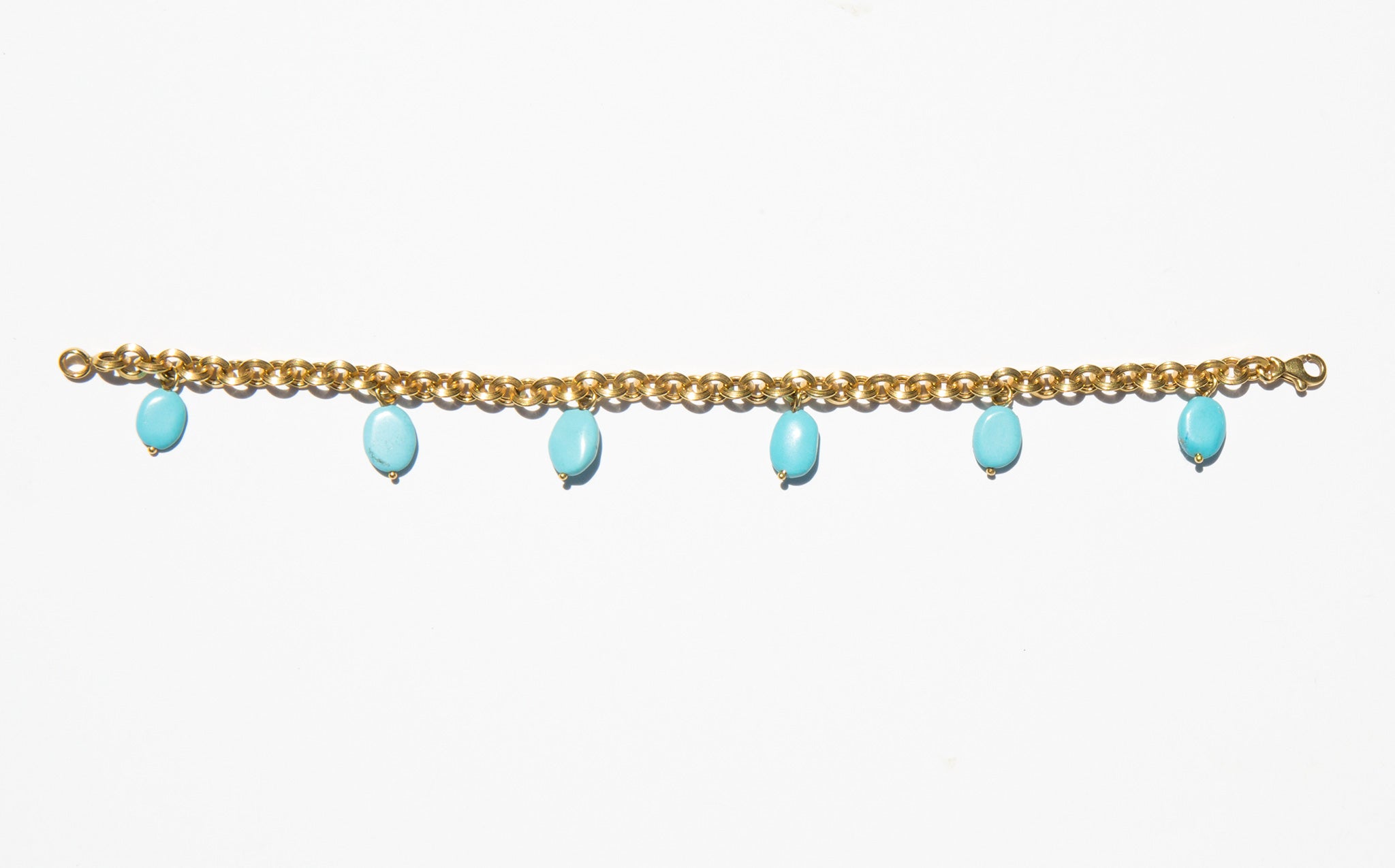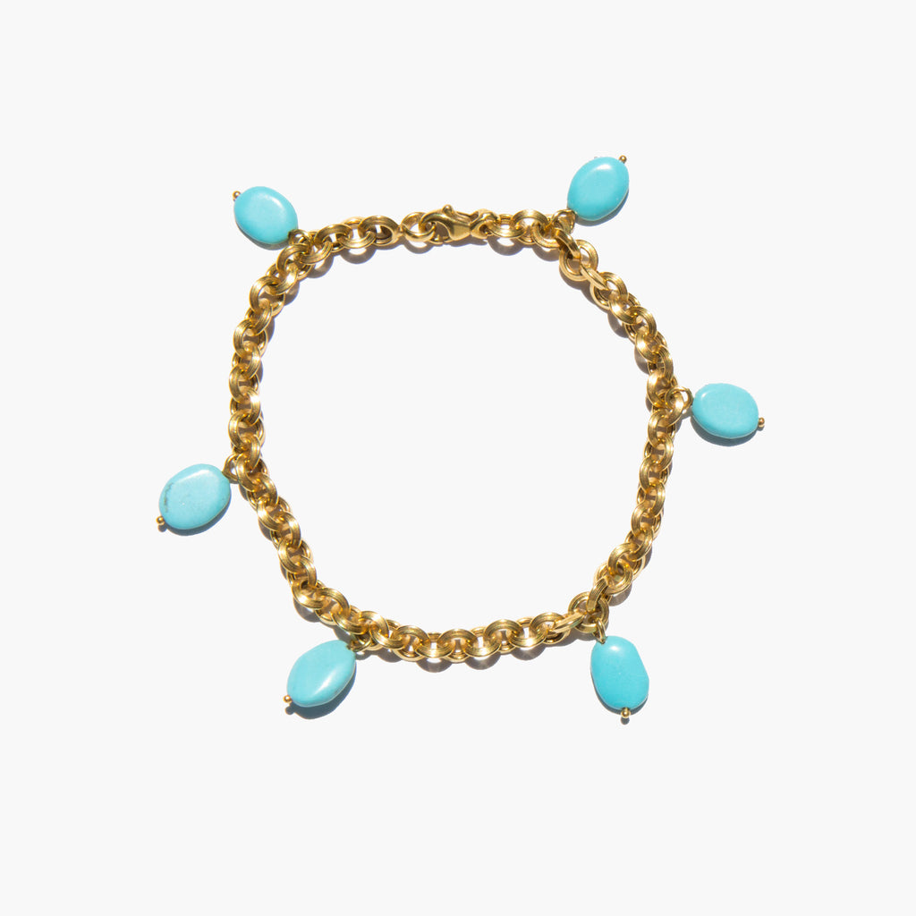14k gold round link chain bracelet with natural turquoise charms.