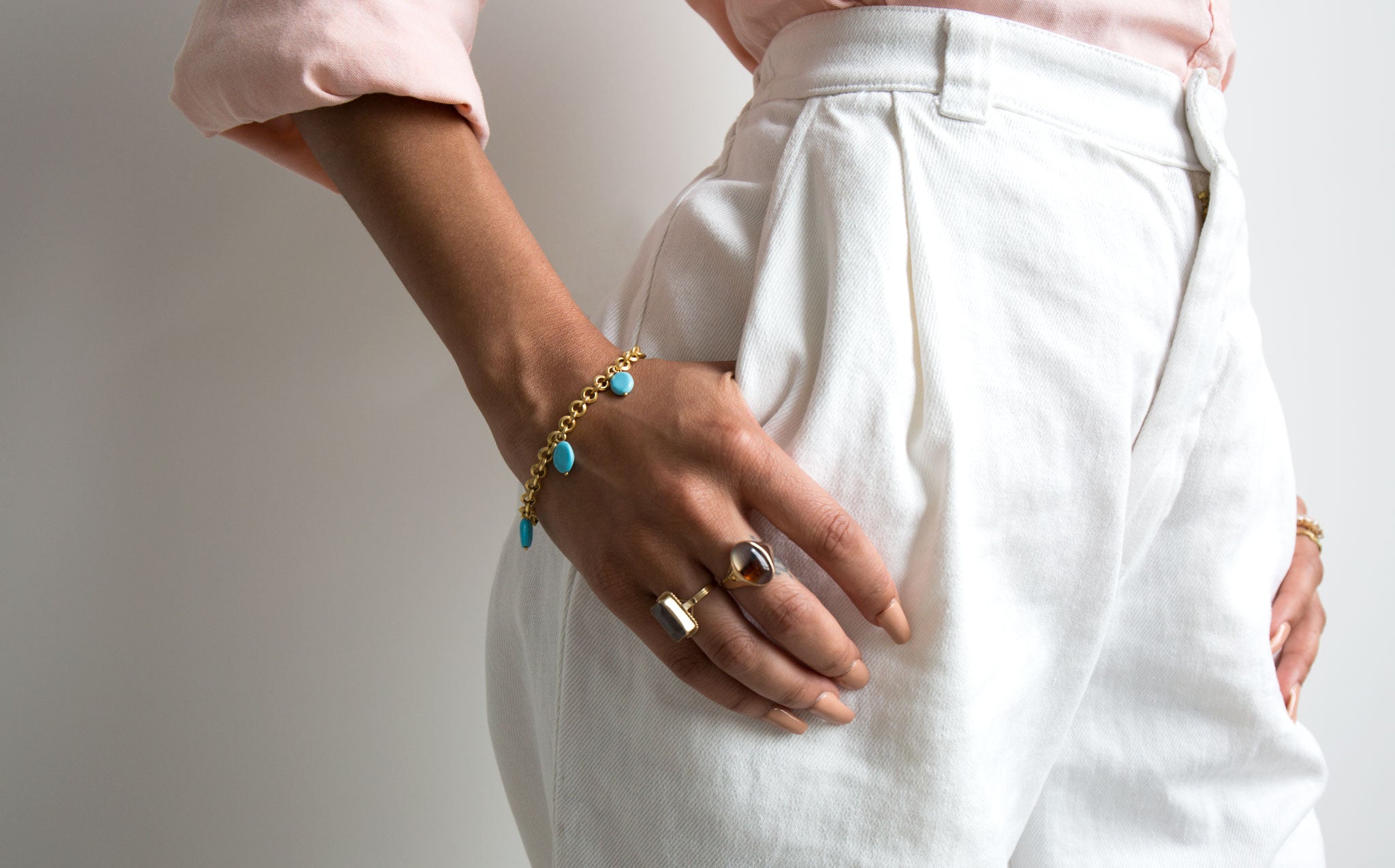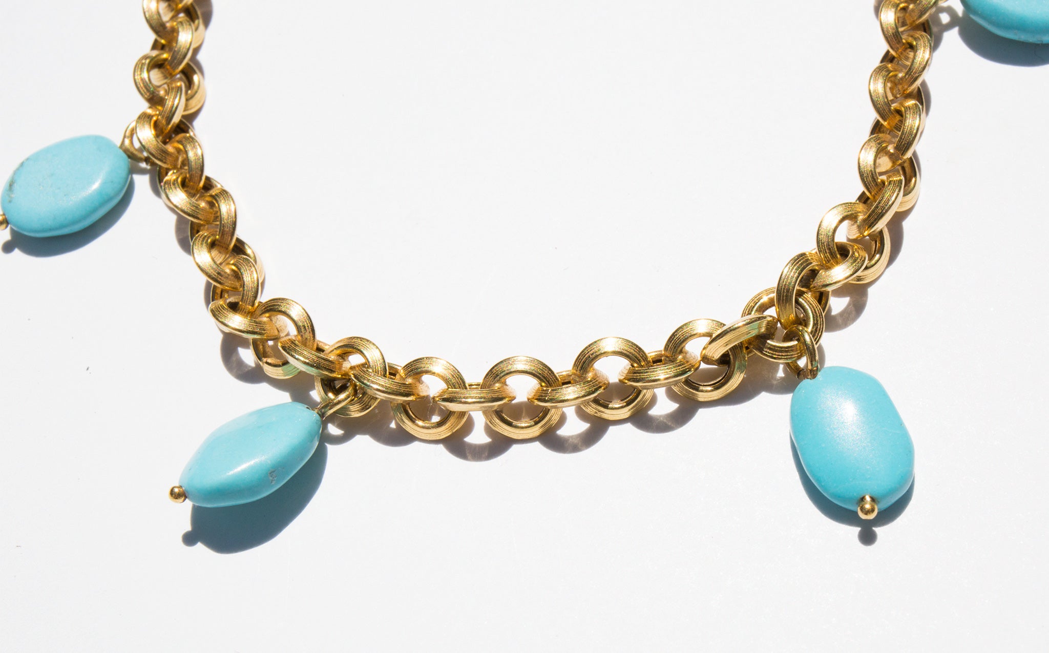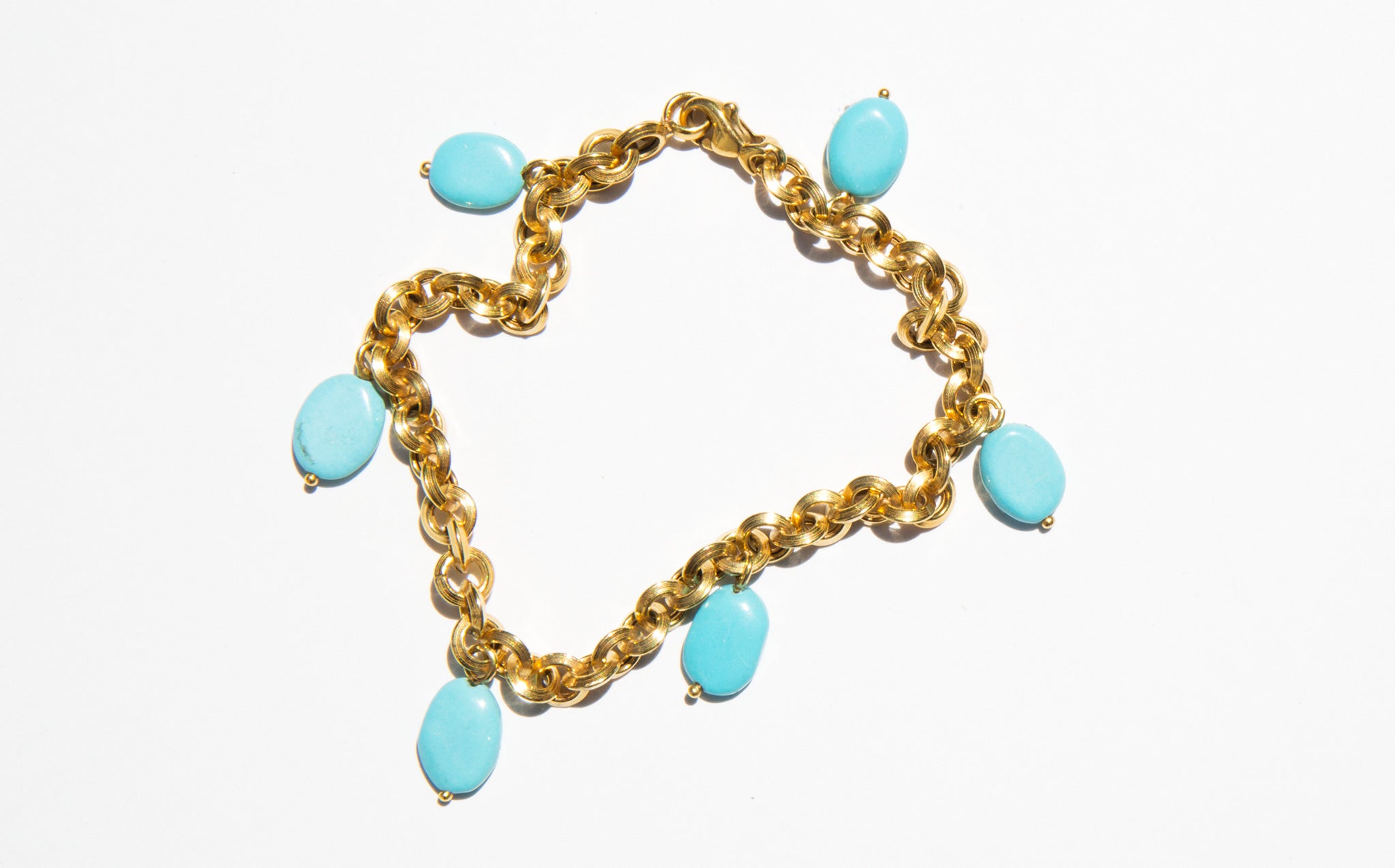 14k gold round link chain bracelet with natural turquoise charms.