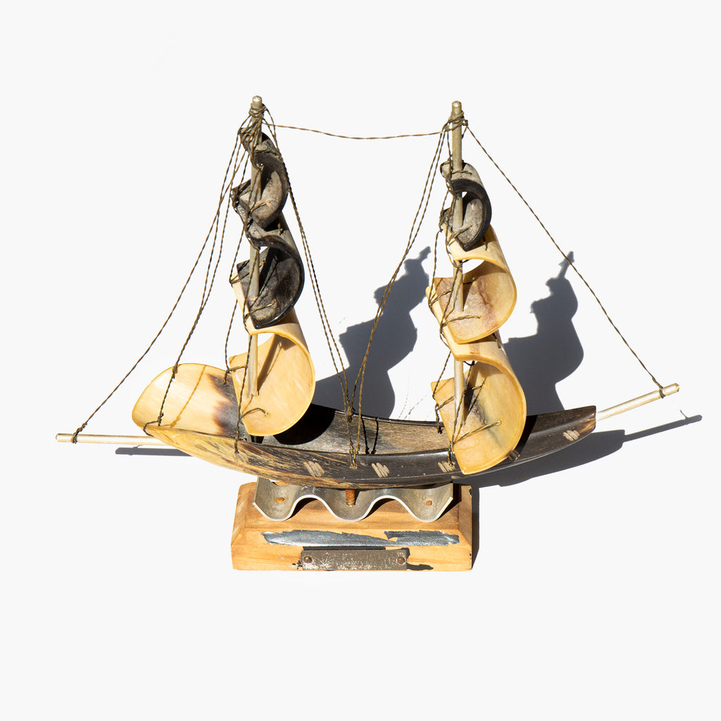 Hand made sailing ship of natural horn, with all sheets to the wind across sculpted metal waves. The piece is mounted on a wooden base with a metal badge plate, the inscription on which has been lost to time.