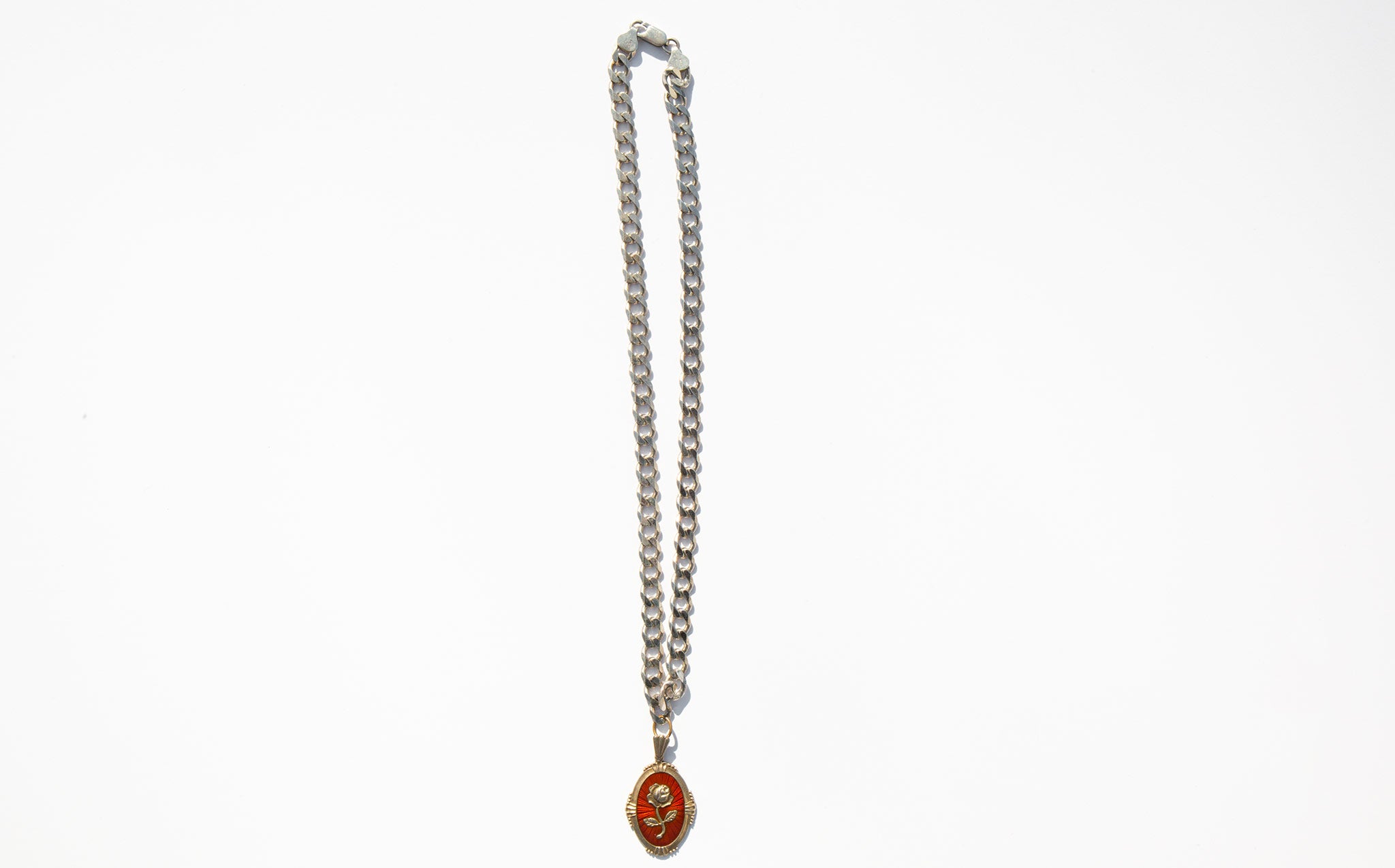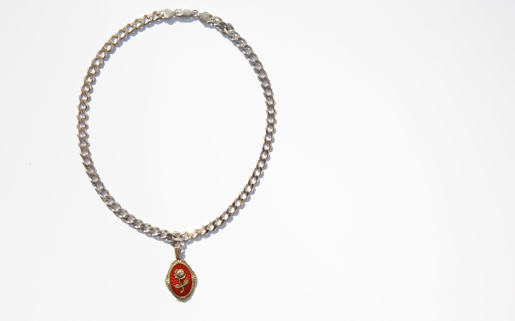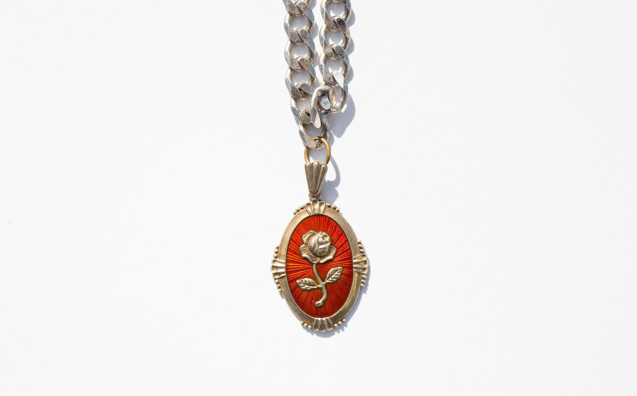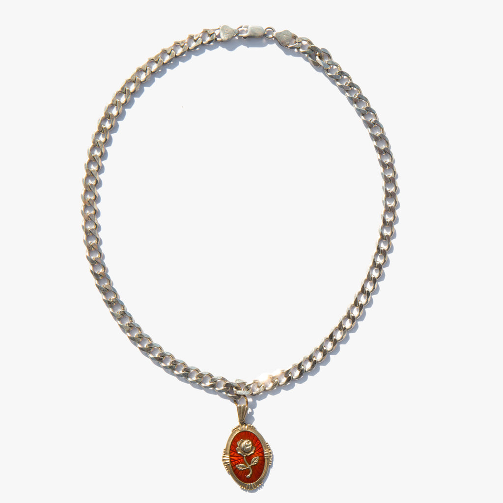 Sterling silver rose charm with pop red enamel on a thick, heavy sterling silver link chain.