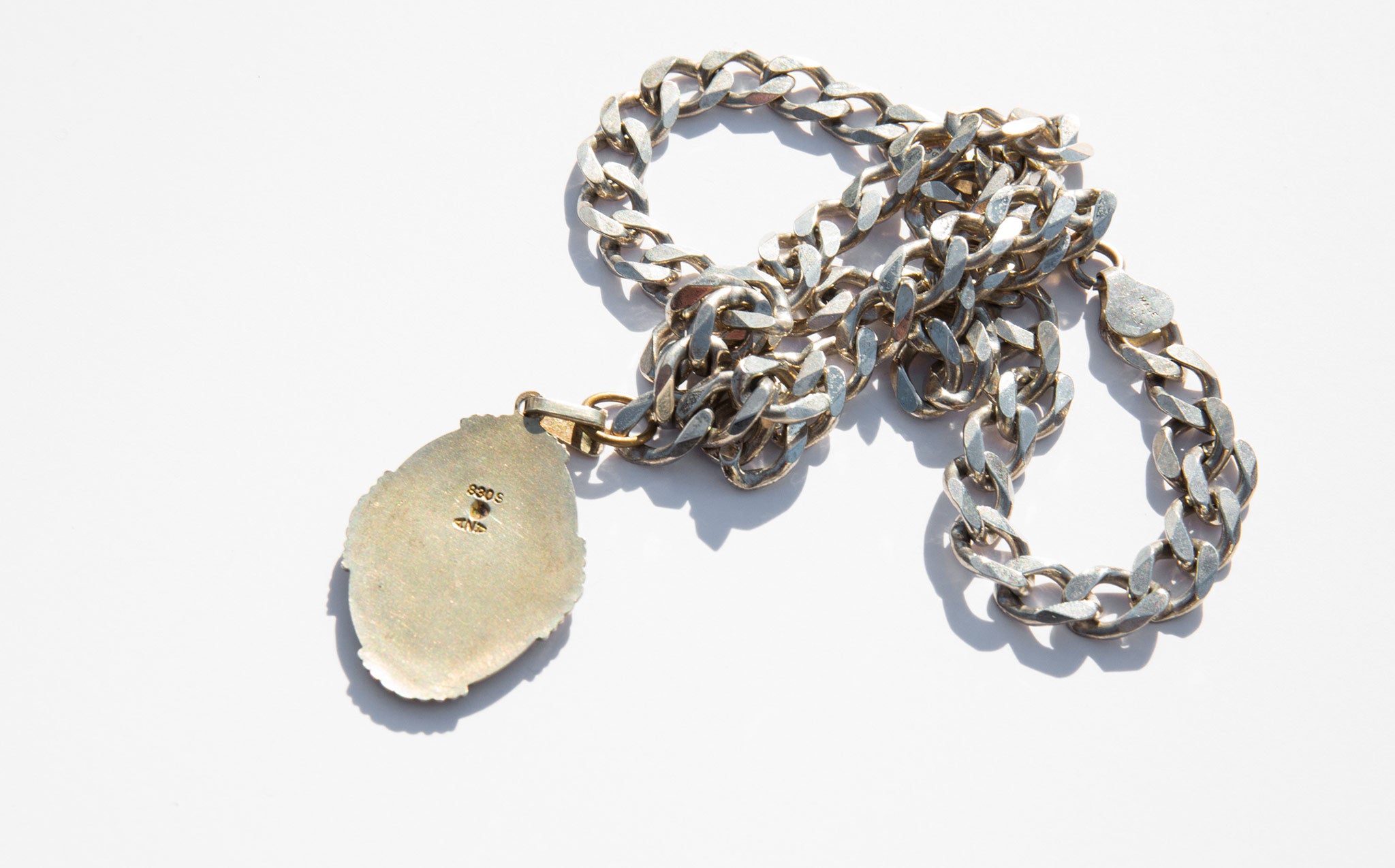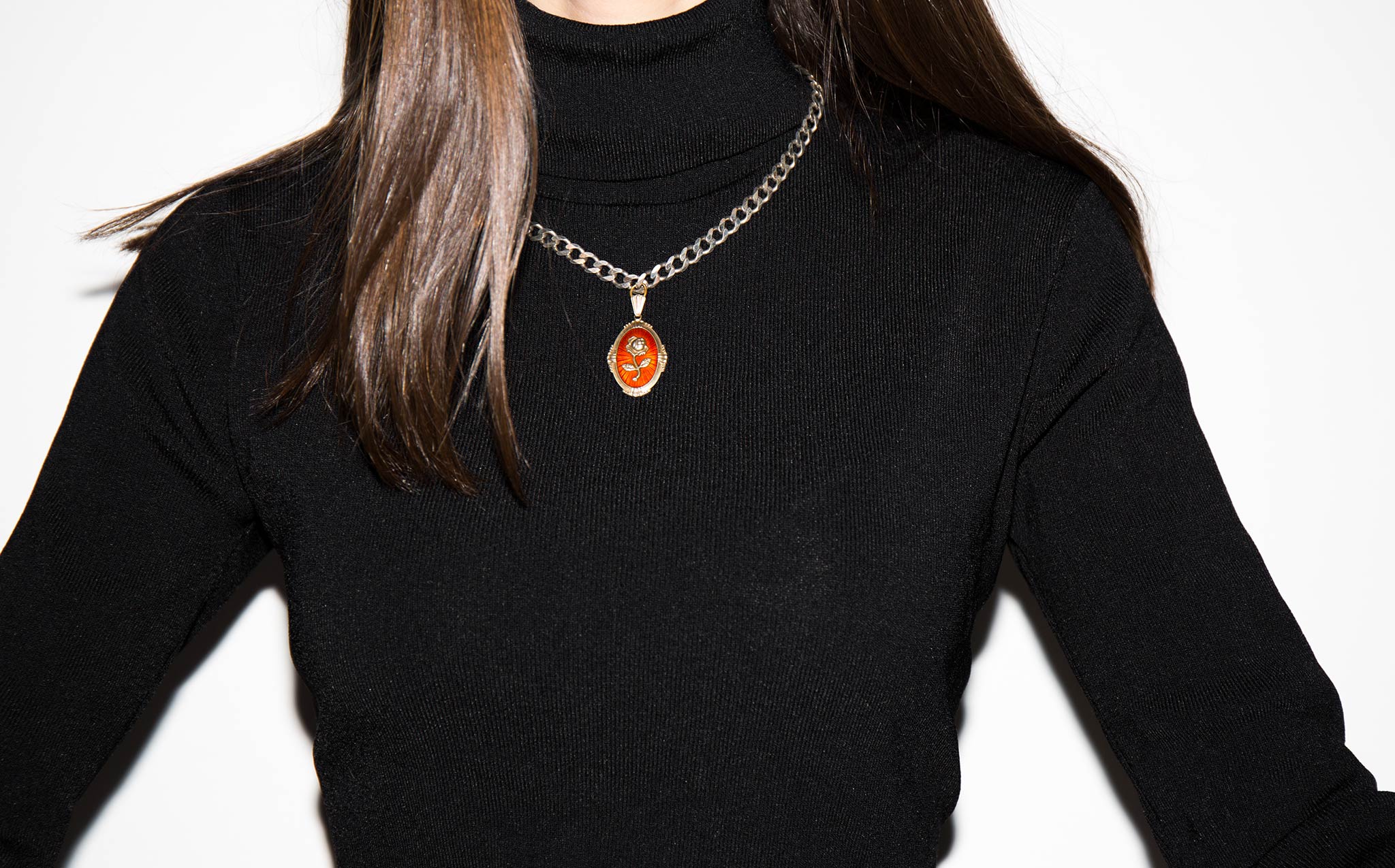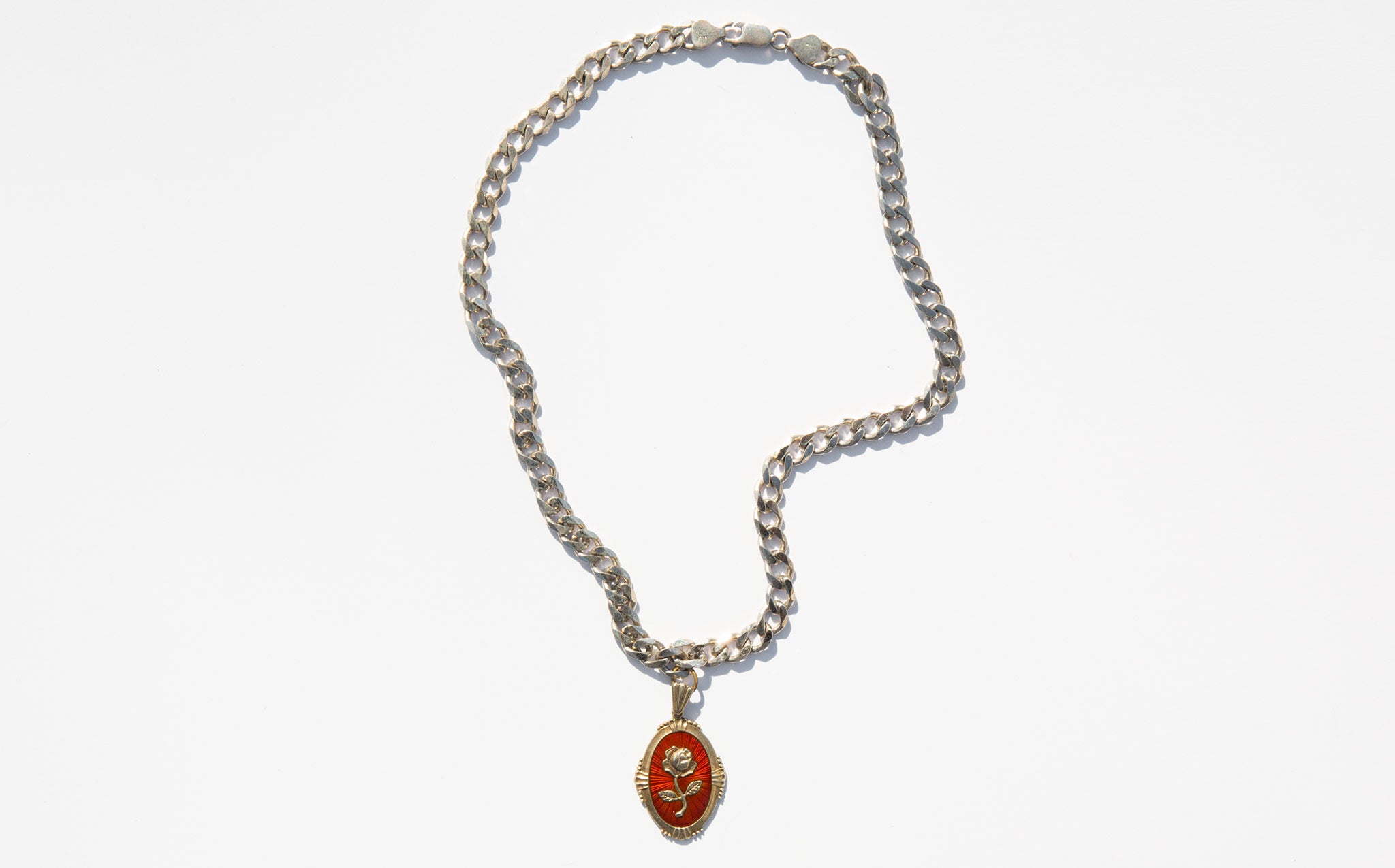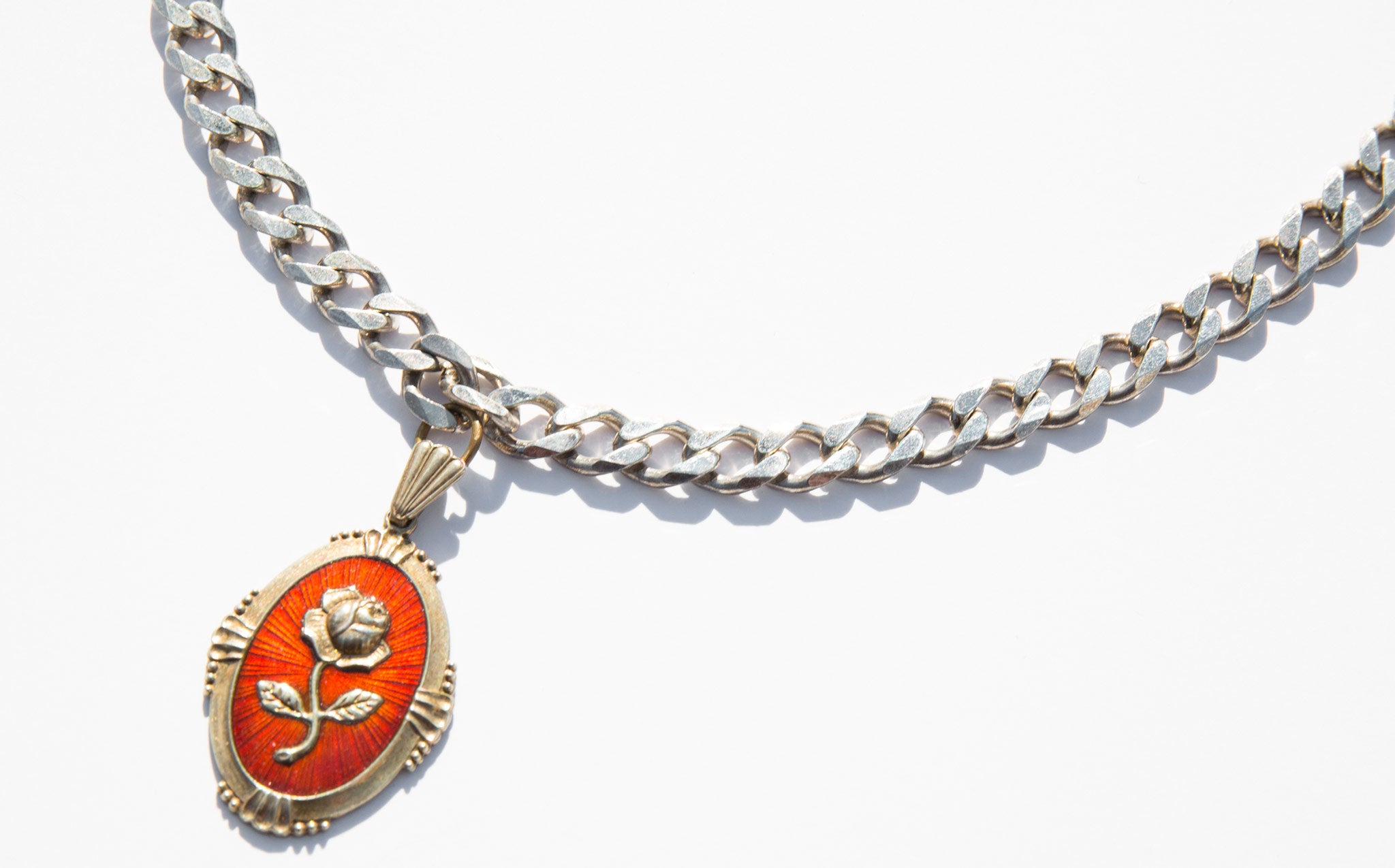 Sterling silver rose charm with pop red enamel on a thick, heavy sterling silver link chain.