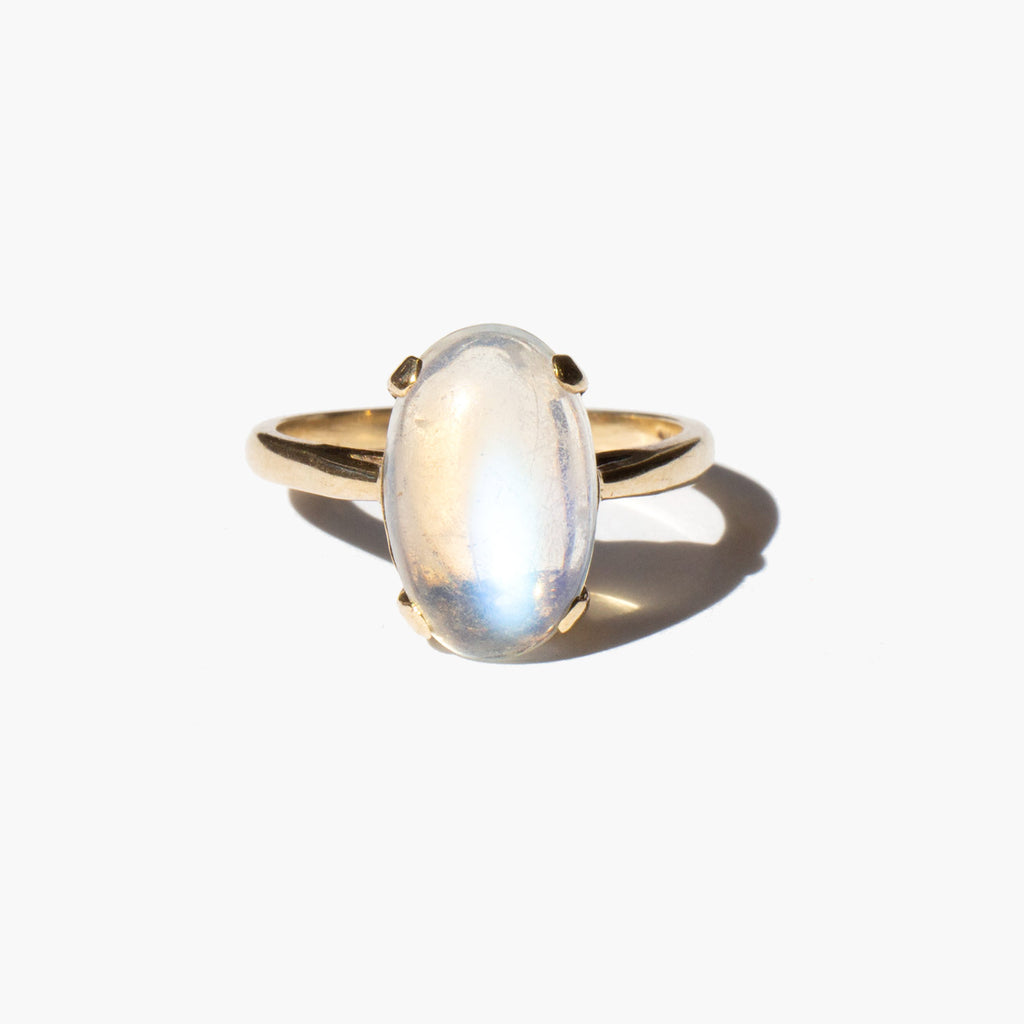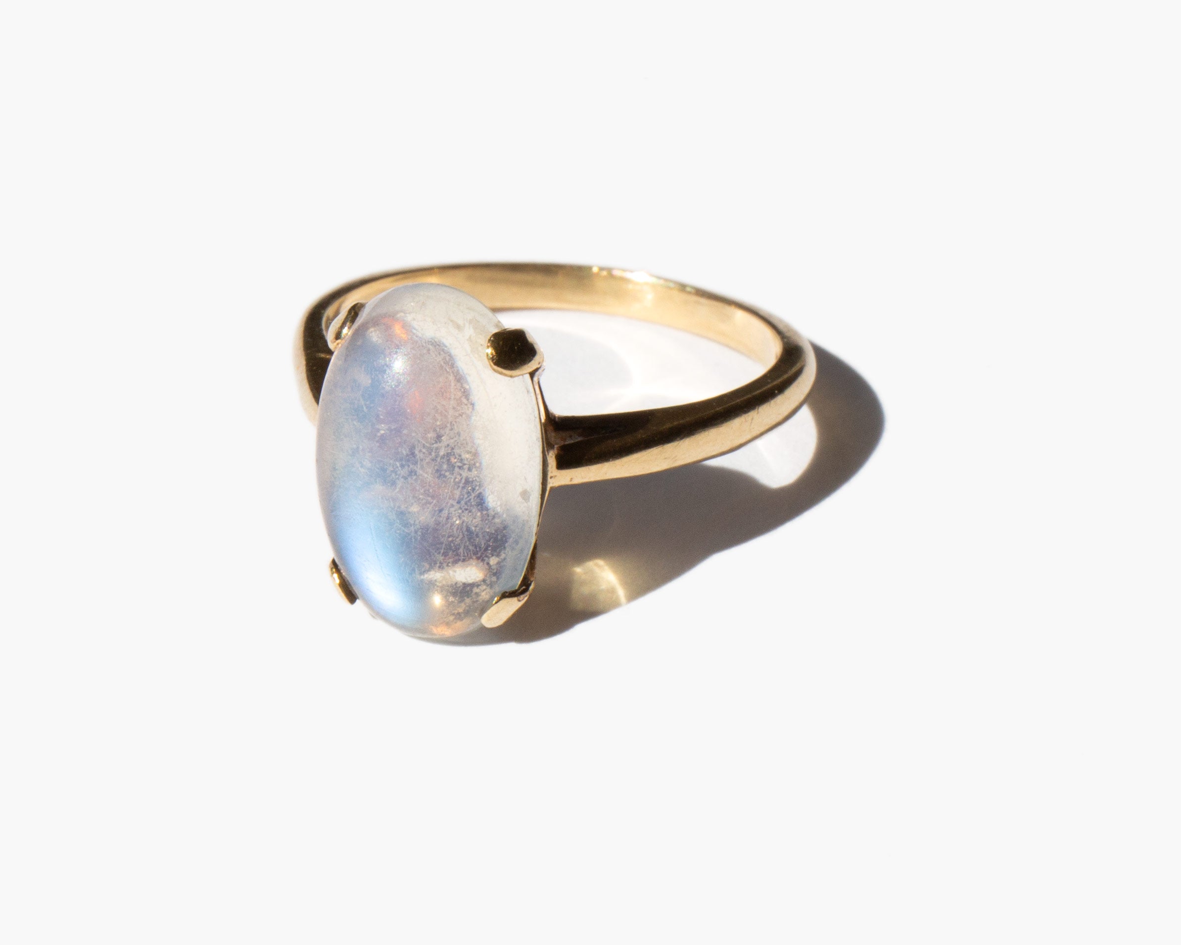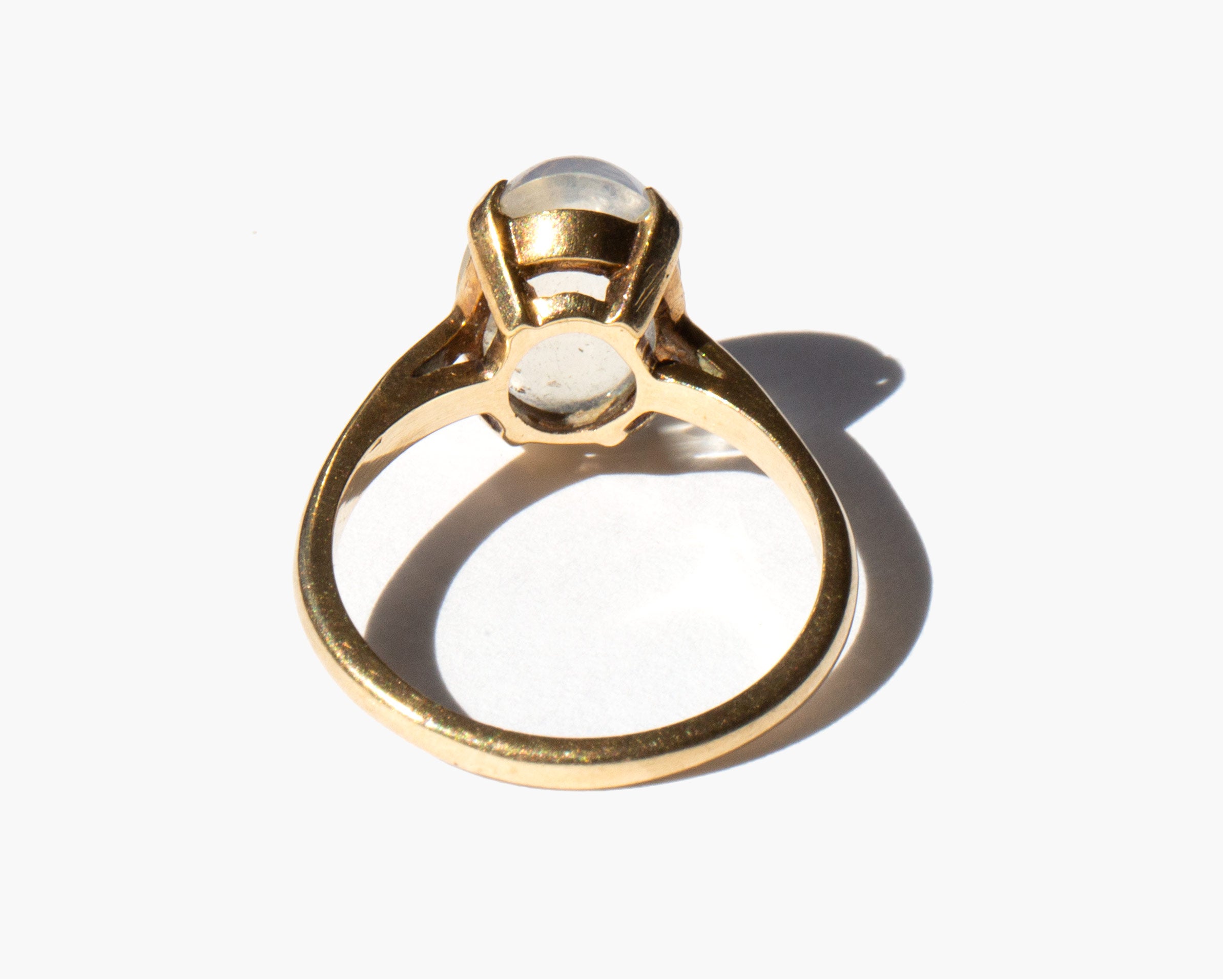 Elegant and simple 14k gold setting with an ethereal moonstone cabochon. Named for its moon-like glow and luminous sheen, moonstone has been thought for thousands of years to offer protection for travelers, especially at night, and some cultures purport that the stone is especially beneficial for lovers and can even help to unite them if estranged.
