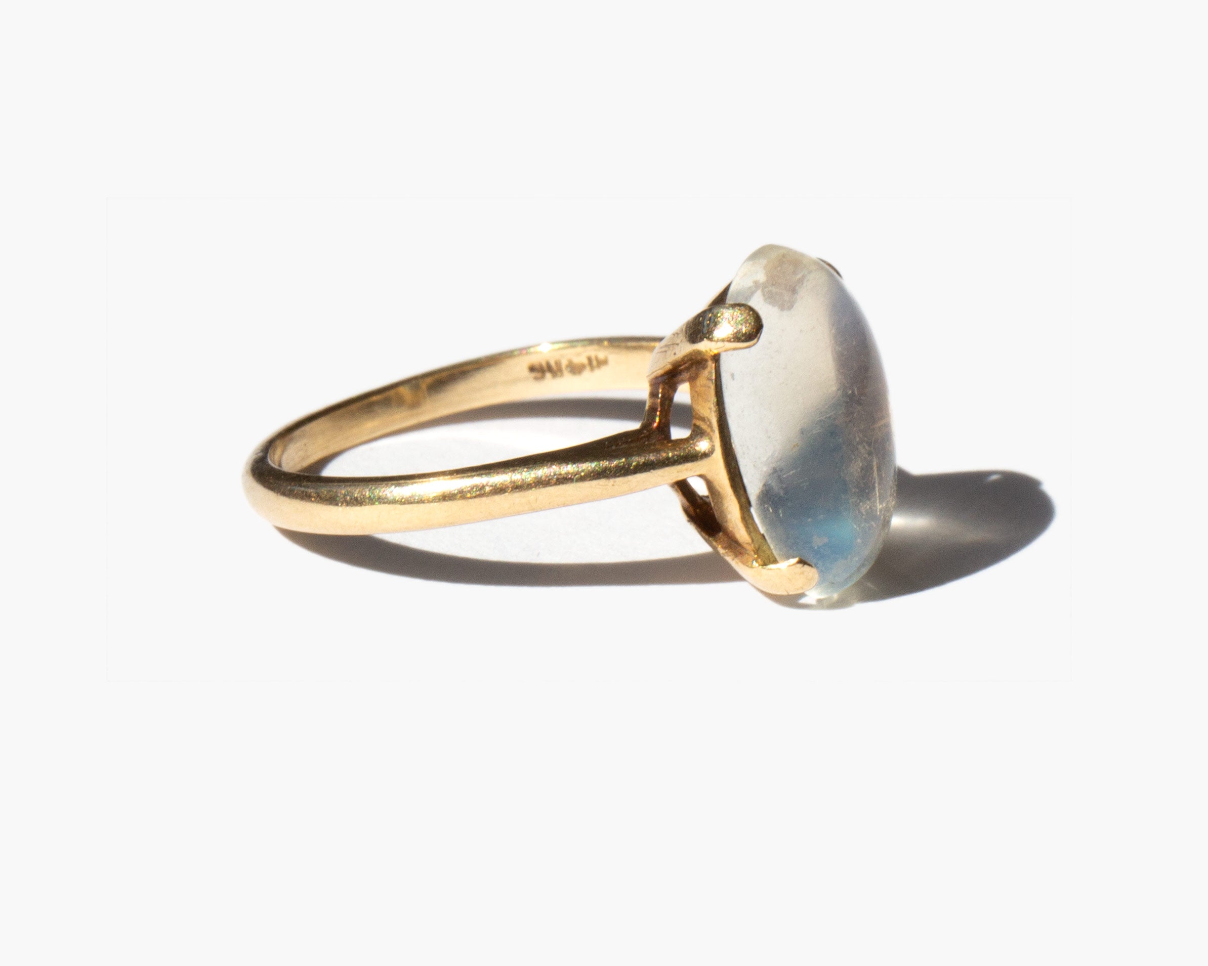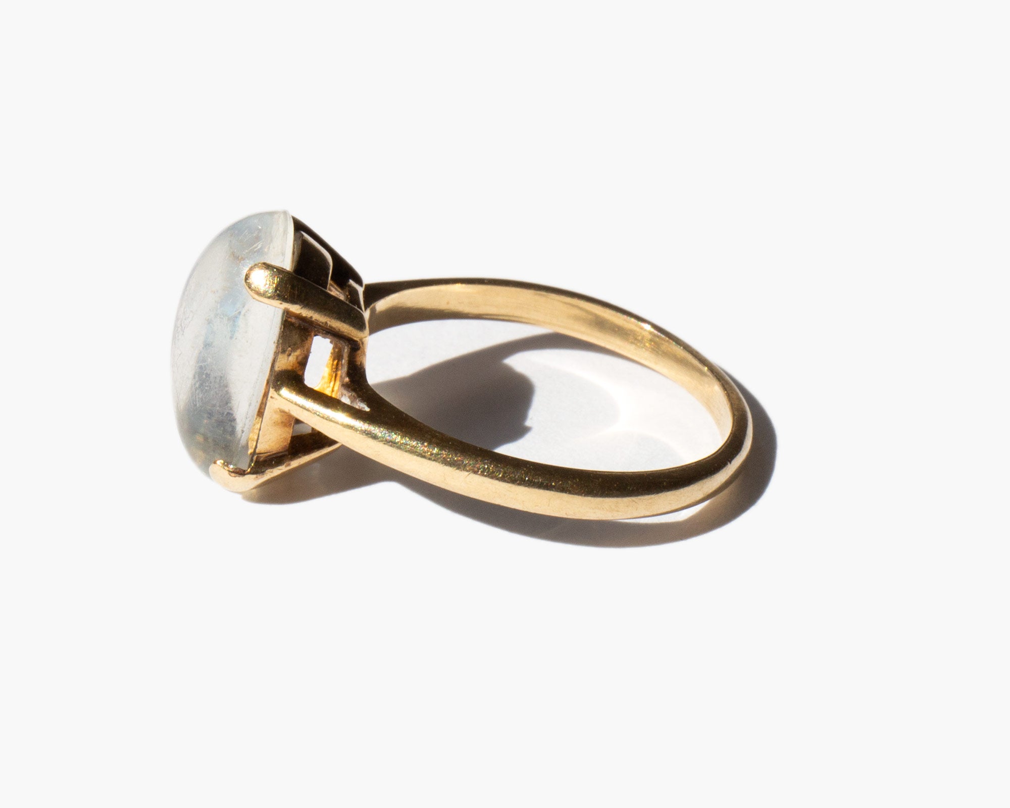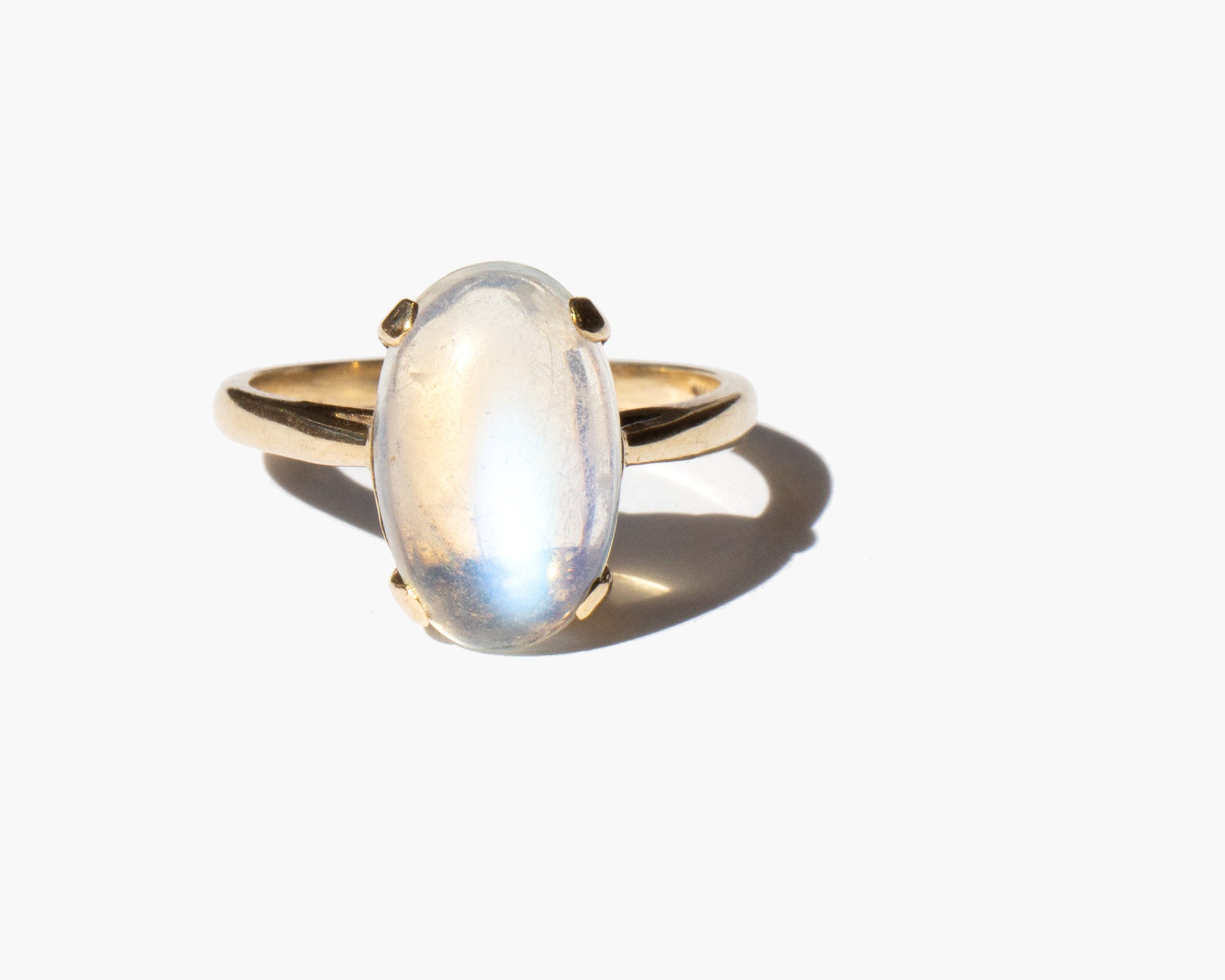 Elegant and simple 14k gold setting with an ethereal moonstone cabochon. Named for its moon-like glow and luminous sheen, moonstone has been thought for thousands of years to offer protection for travelers, especially at night, and some cultures purport that the stone is especially beneficial for lovers and can even help to unite them if estranged.