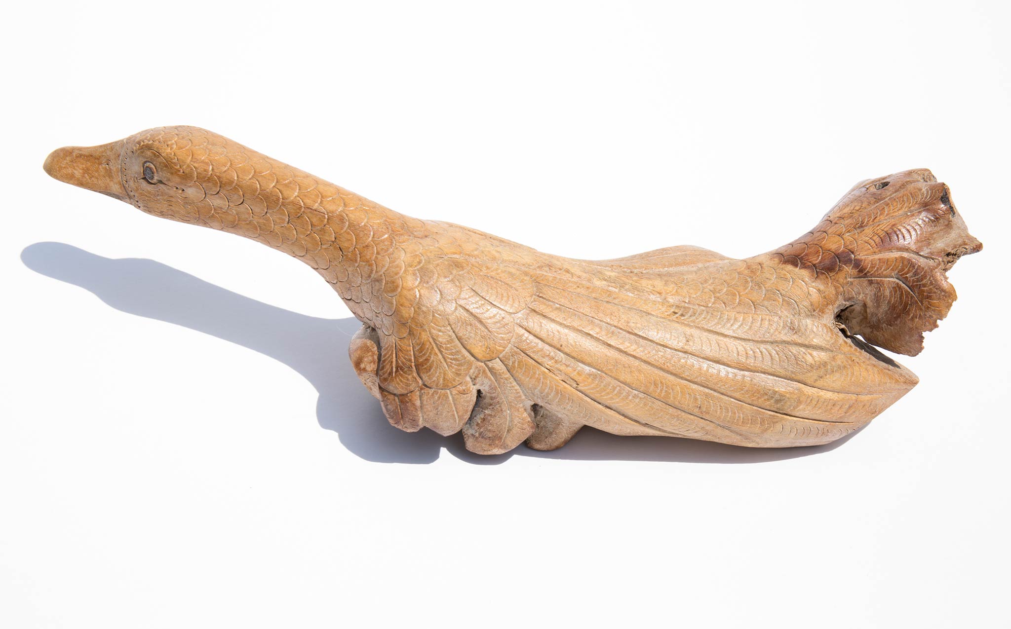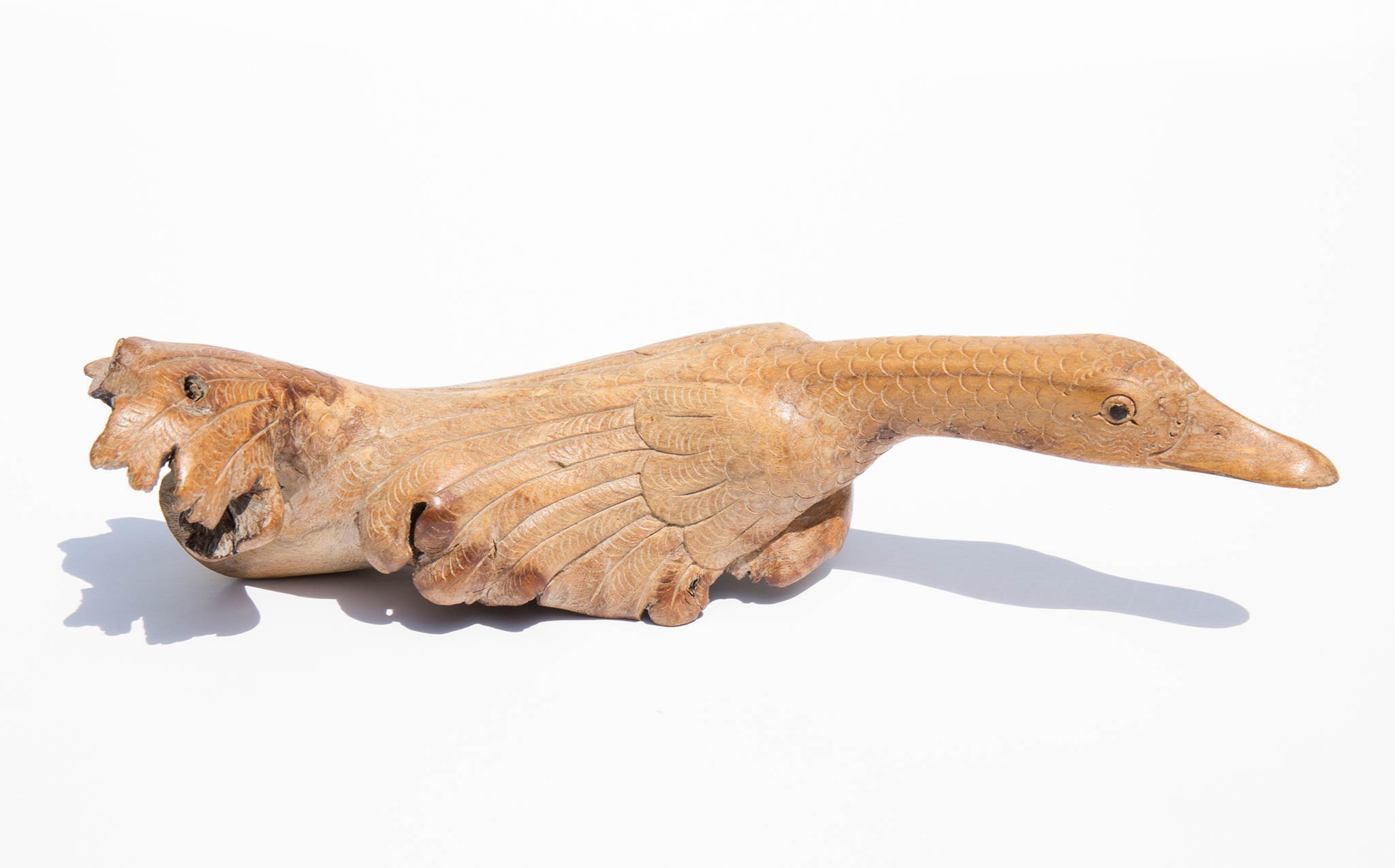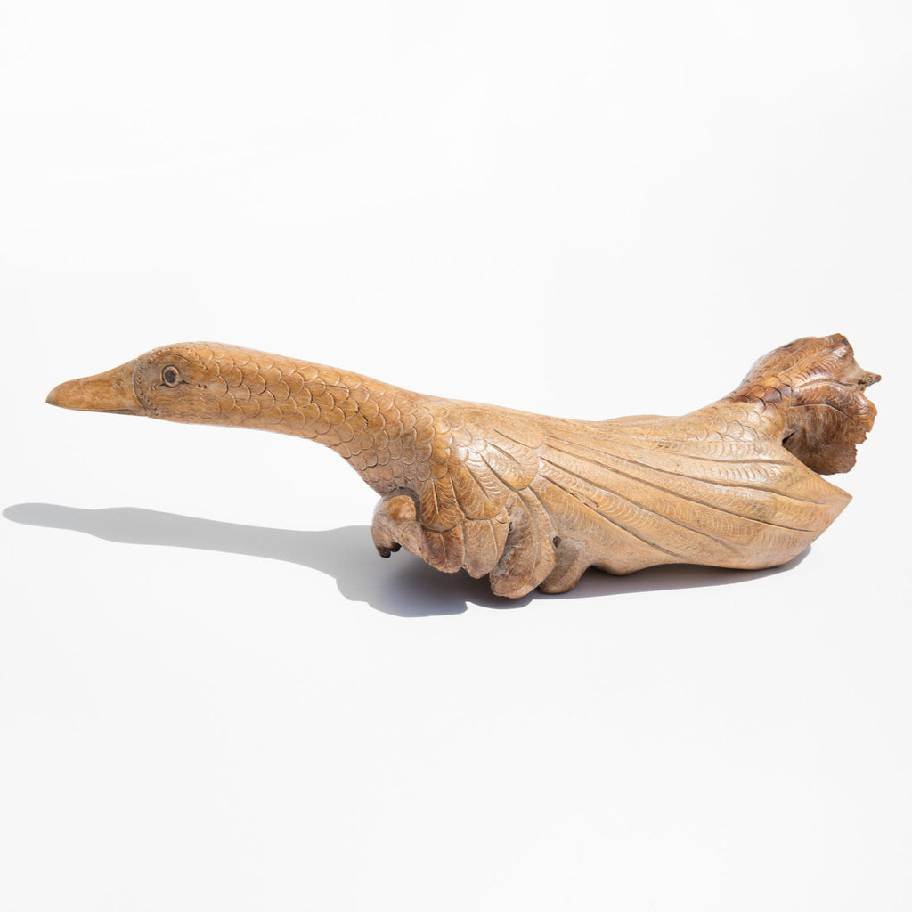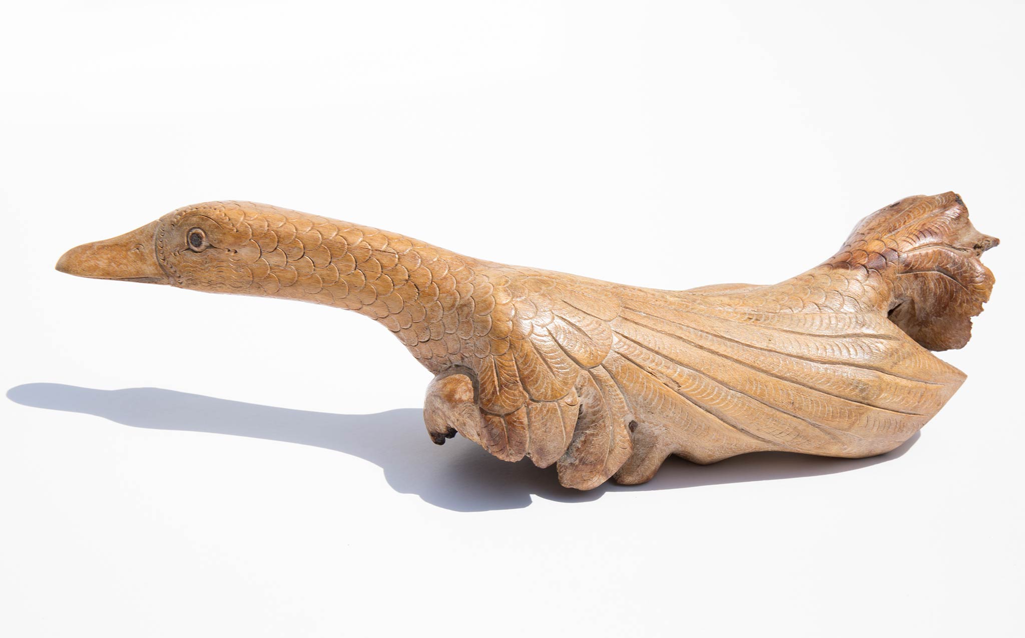 Natural piece of wood carved into a finely detailed goose. Geese were the original centerpiece of the feast at Michaelmas, a pagan holiday that fell on the winter solstice celebrating the end of the harvest season. When the holiday was eventually replaced by Christmas, the goose again became the meat of the meal. It wasn't until American settlers found themselves with an abundance of turkeys at hand that the tradition changed, and that unlucky fowl took to the table as the main attraction of the holiday meal.