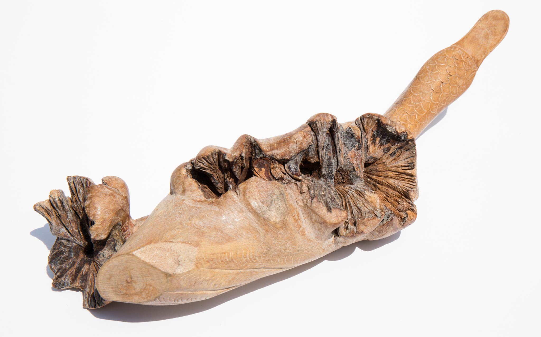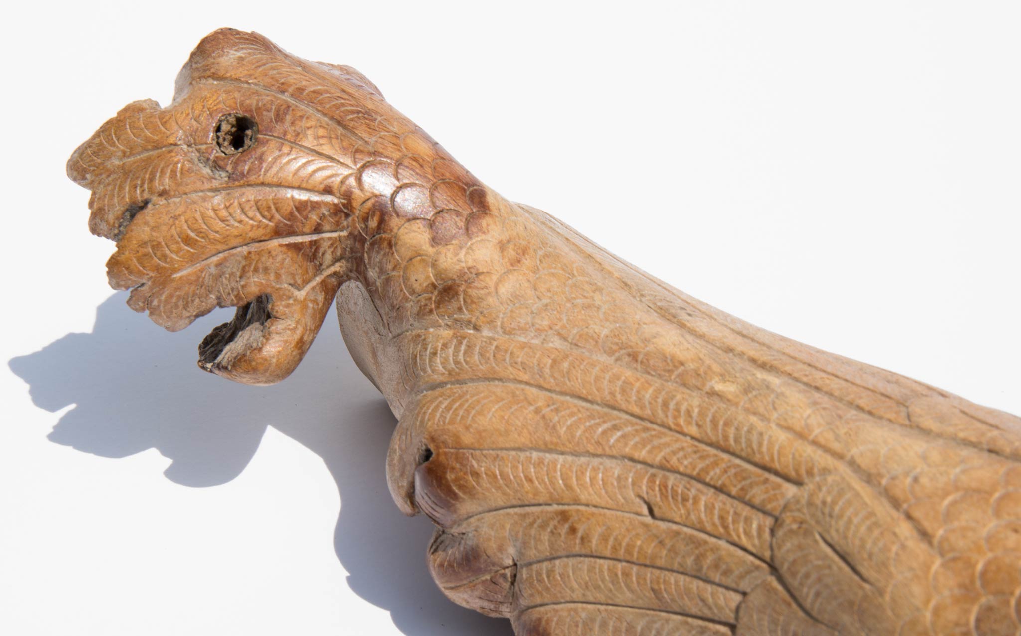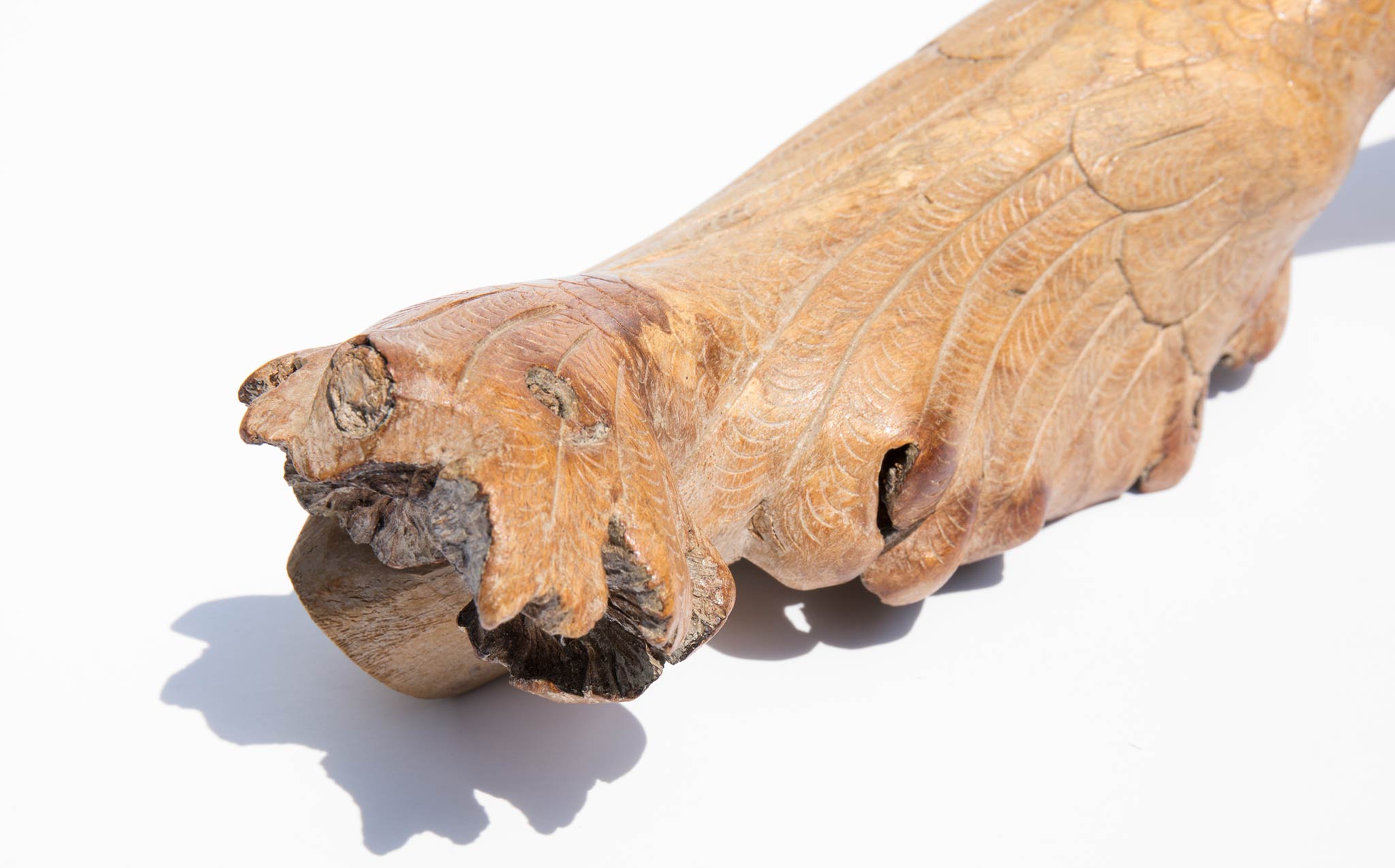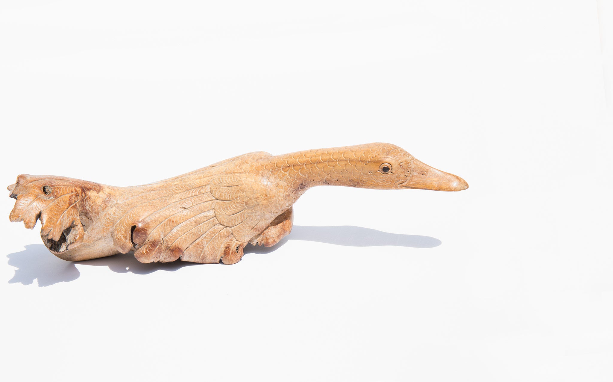 Natural piece of wood carved into a finely detailed goose. Geese were the original centerpiece of the feast at Michaelmas, a pagan holiday that fell on the winter solstice celebrating the end of the harvest season. When the holiday was eventually replaced by Christmas, the goose again became the meat of the meal. It wasn't until American settlers found themselves with an abundance of turkeys at hand that the tradition changed, and that unlucky fowl took to the table as the main attraction of the holiday meal.
