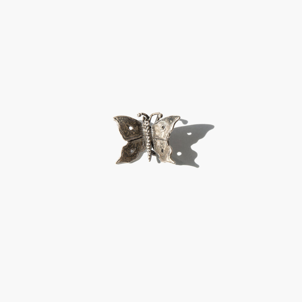 Small sterling silver butterfly. Exceptionally beautiful and graceful, butterflies can also represent rebirth, transformation and change. Tohono O'odham legend holds that butterflies were made by the world's creator when it gathered colors from all around the land into a sack and shook them up – orange and yellow sunlight, green leaves, blue sky, white cornmeal, and the blackness of a beautiful girl's hair were released into the air as thousands of brilliantly colored butterflies.