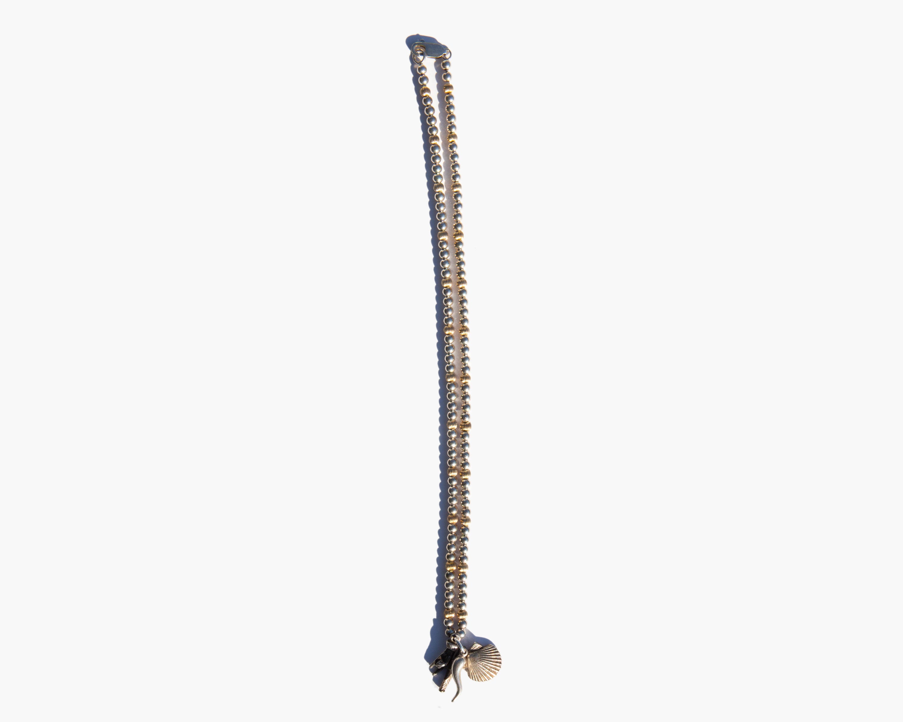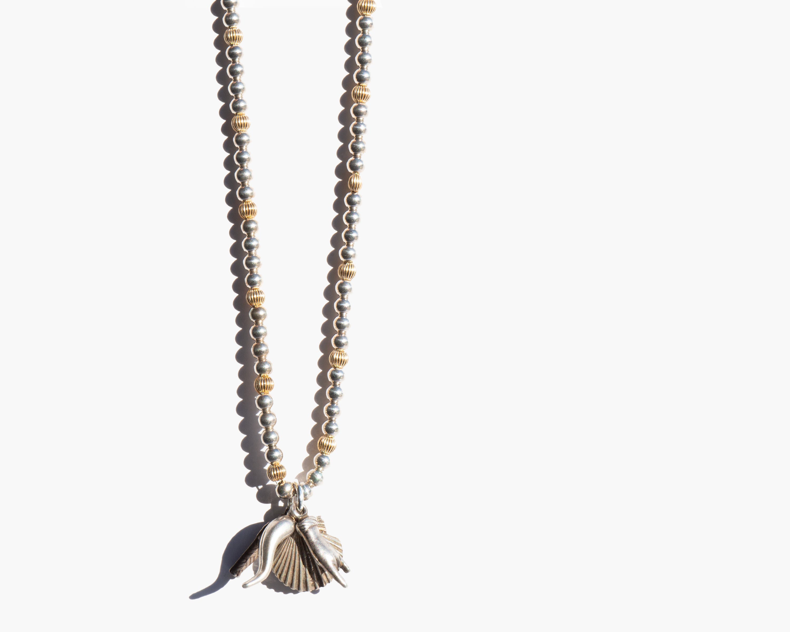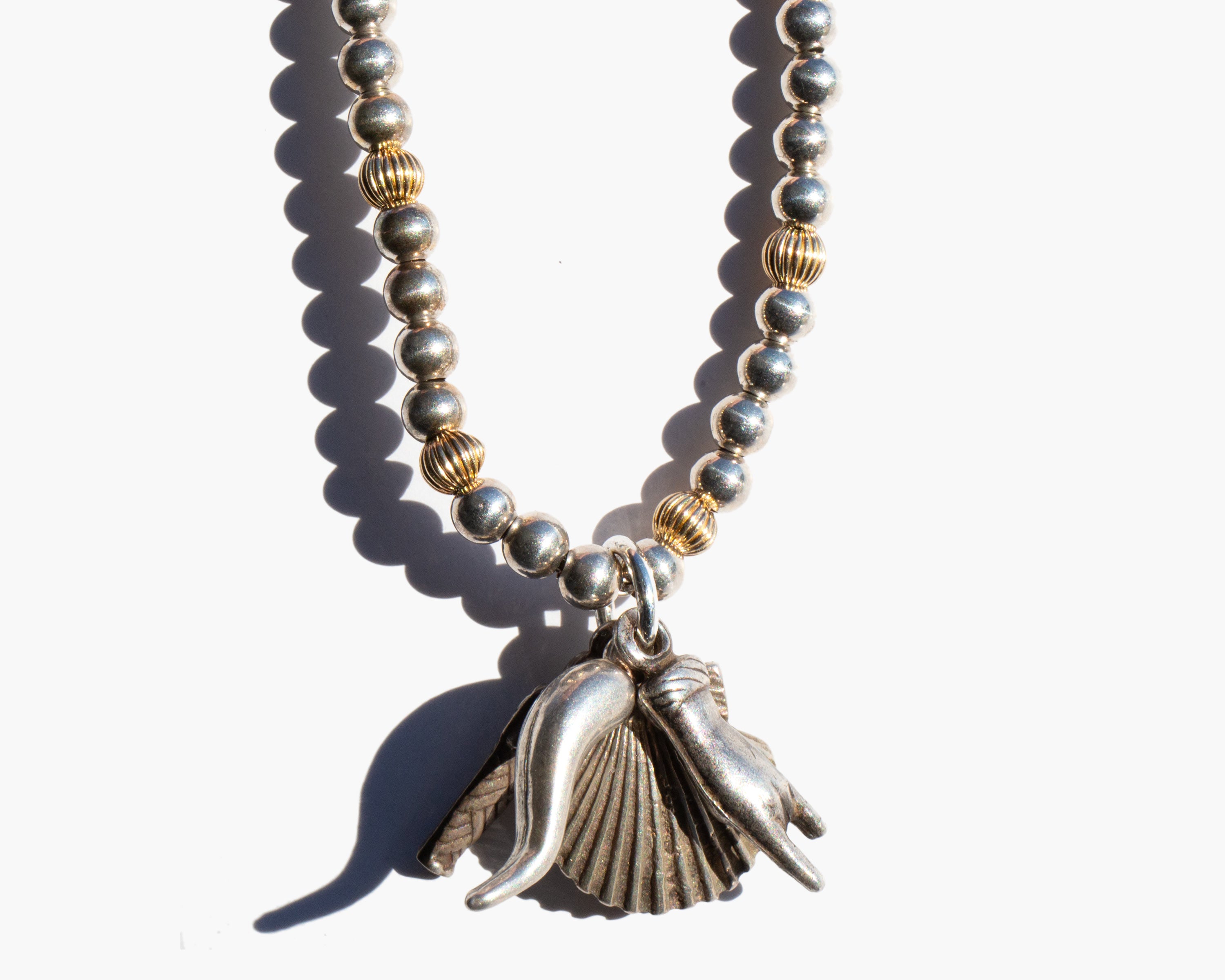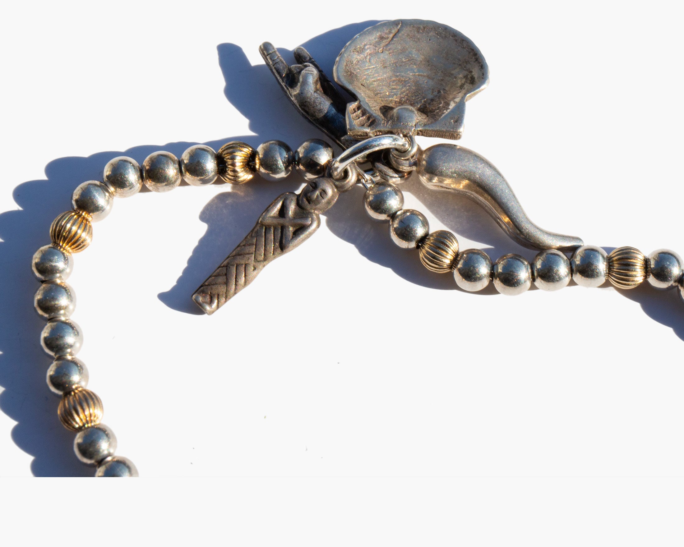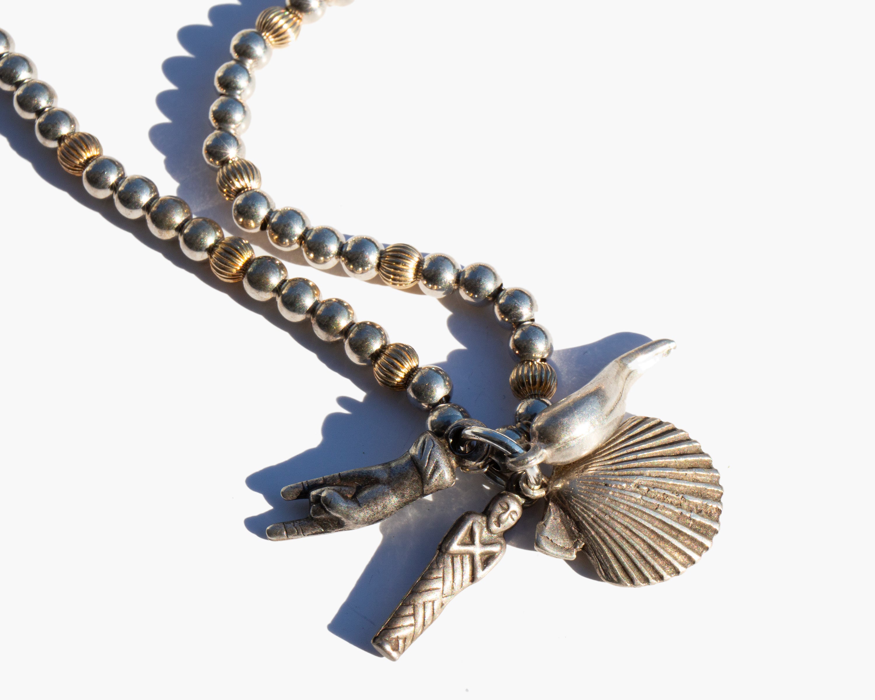 Sterling silver and 14k gold bead chain with an array of protective sterling silver talisman charms symbolizing personal transformation.
