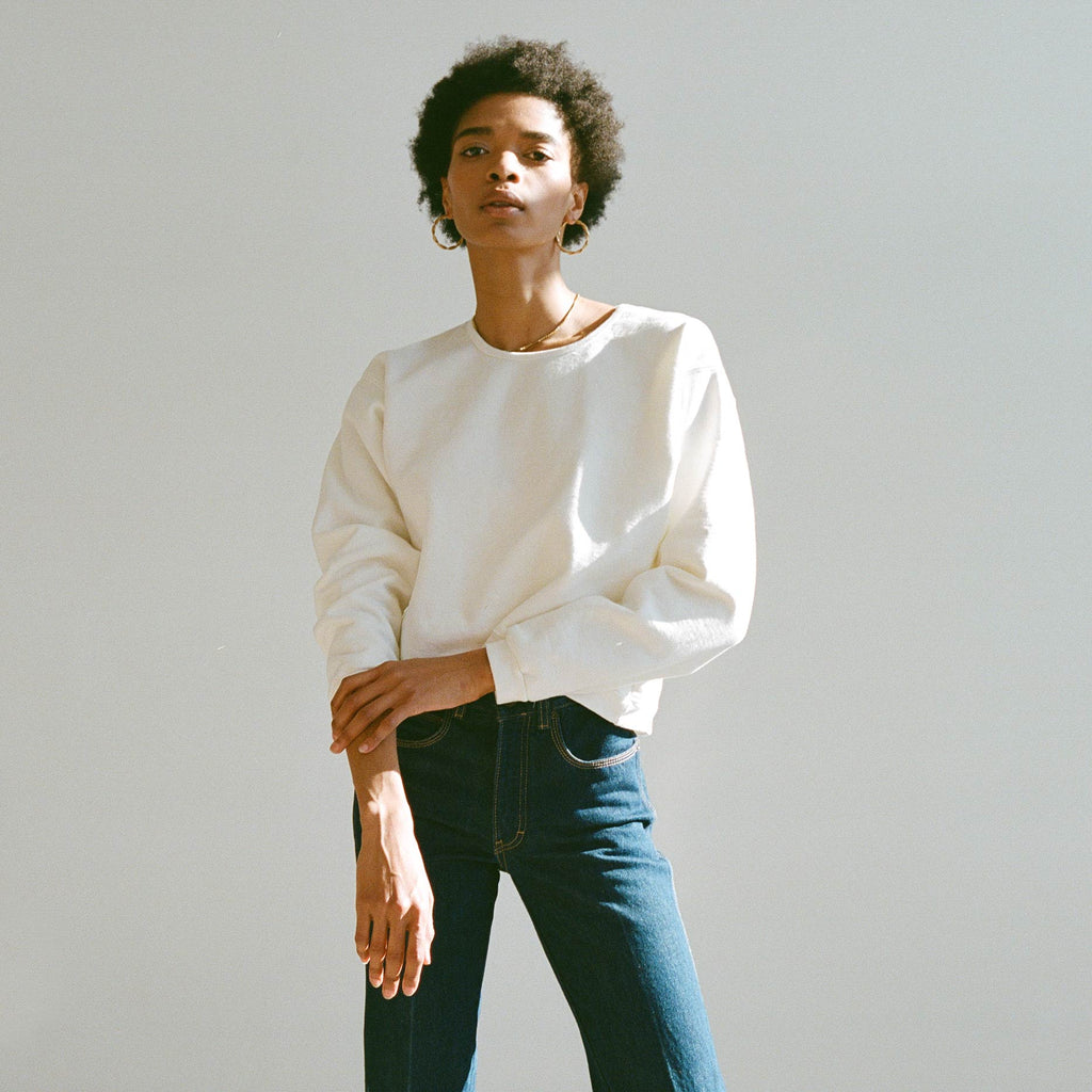 Originally invented by a football player fed up with itchy wool jerseys, the classic sweatshirt gets its name from its roots on a playing field. Made and remade tirelessly over the years, we kept it simple – a classic fit with a modern crop, perfect for everything from high-waisted pants to pencil skirts.