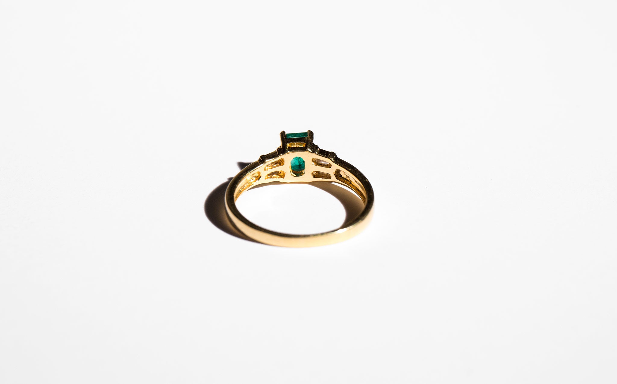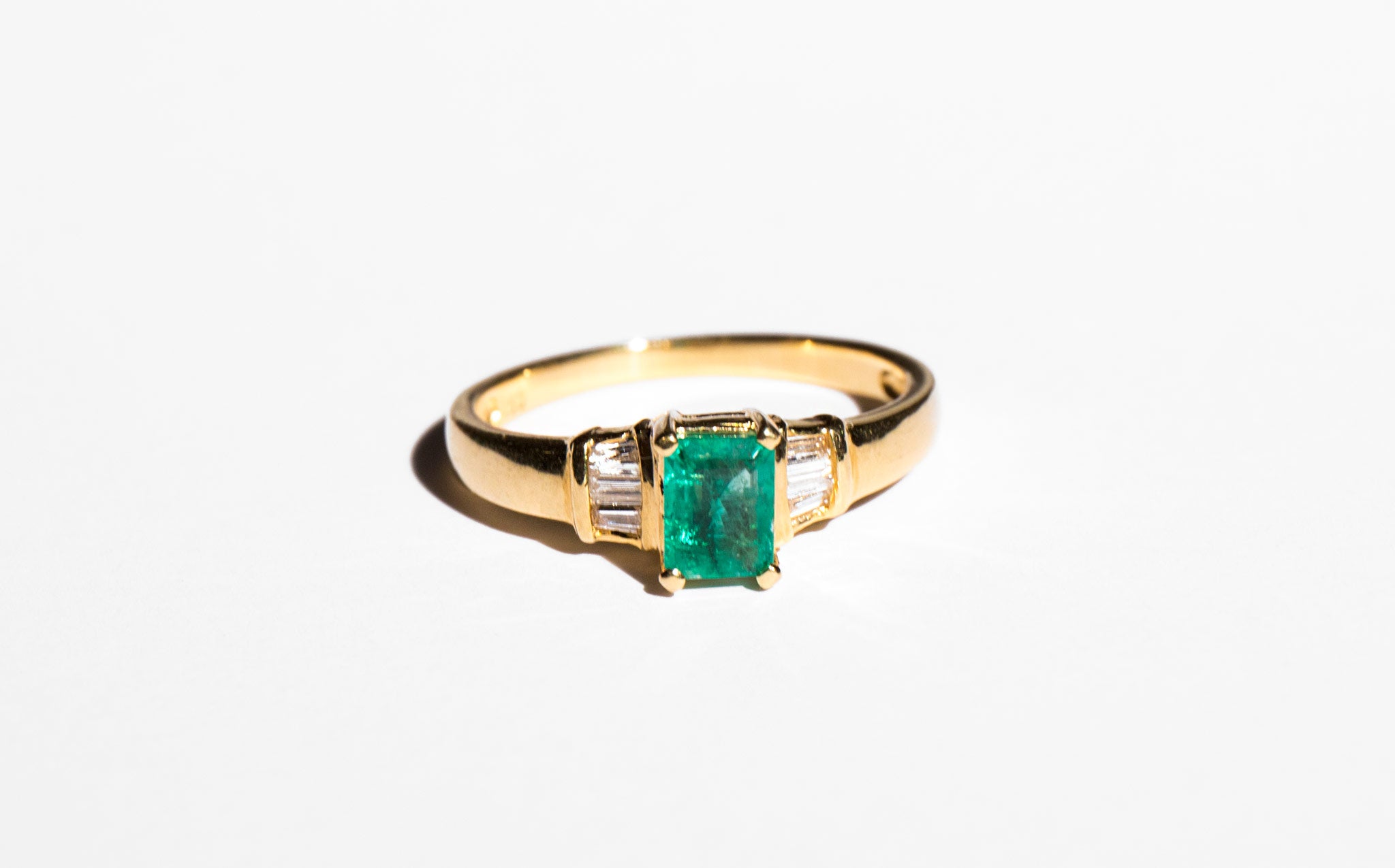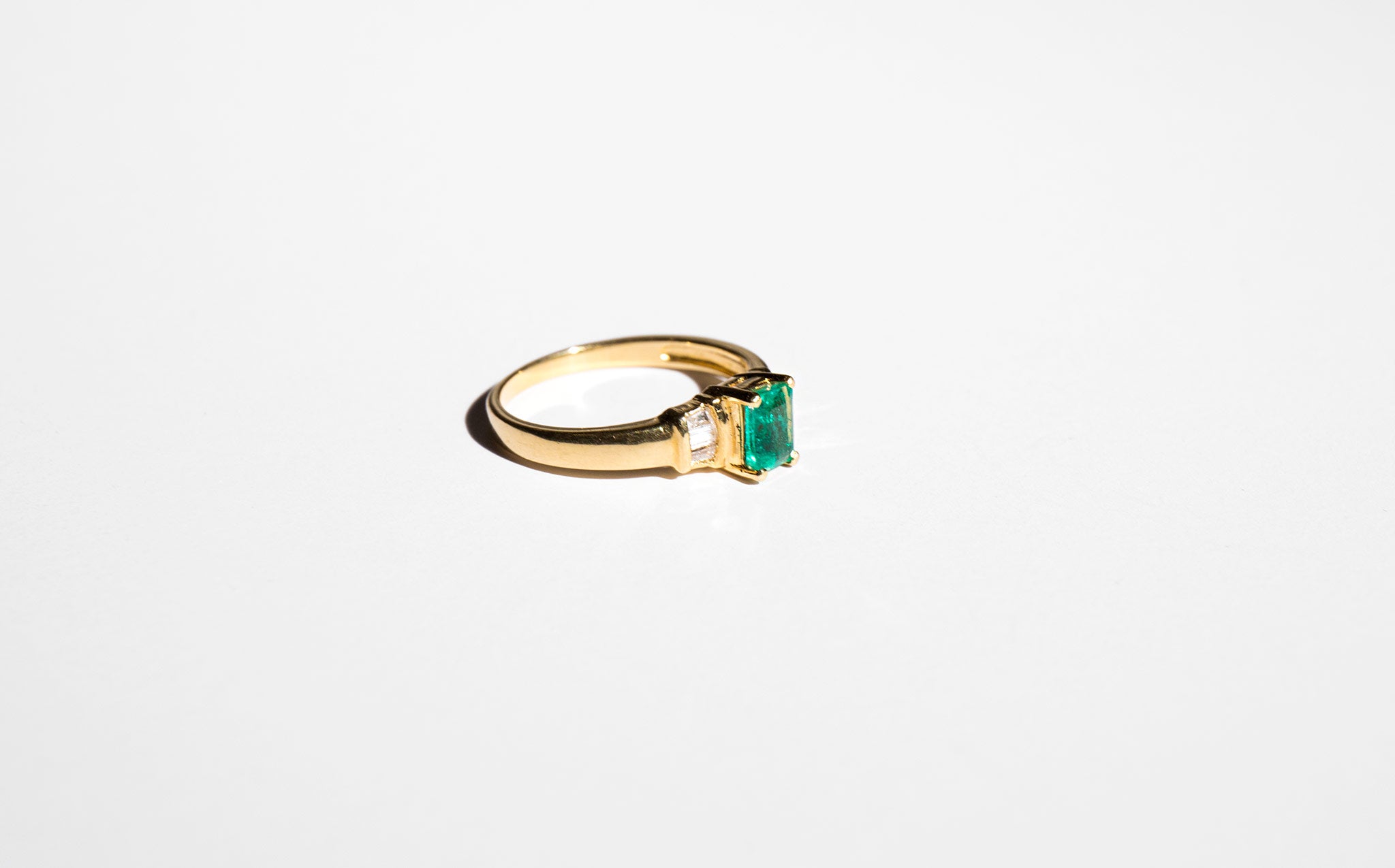 A charming 18k gold setting with pretty sparkling diamonds and bold green emeralds.