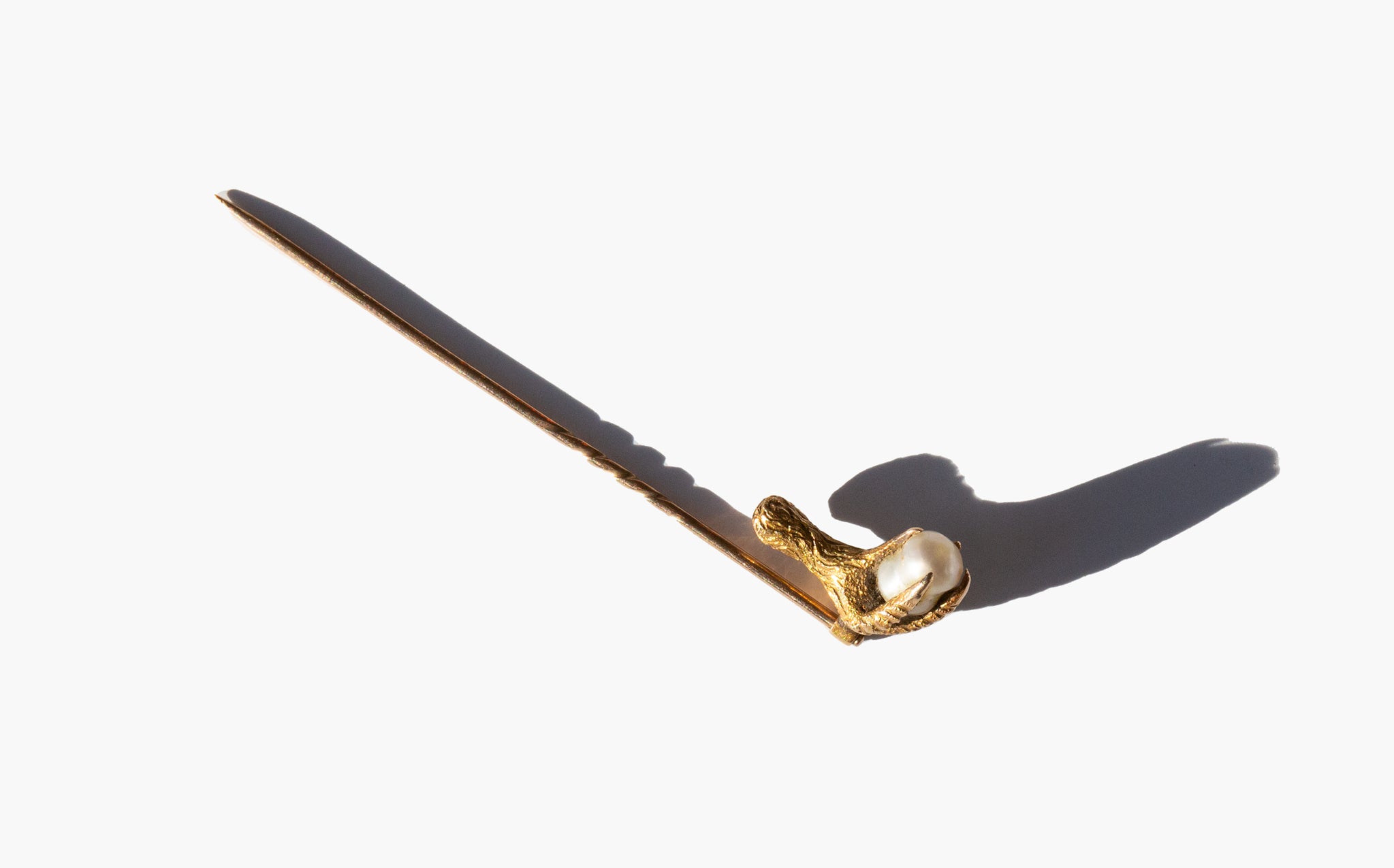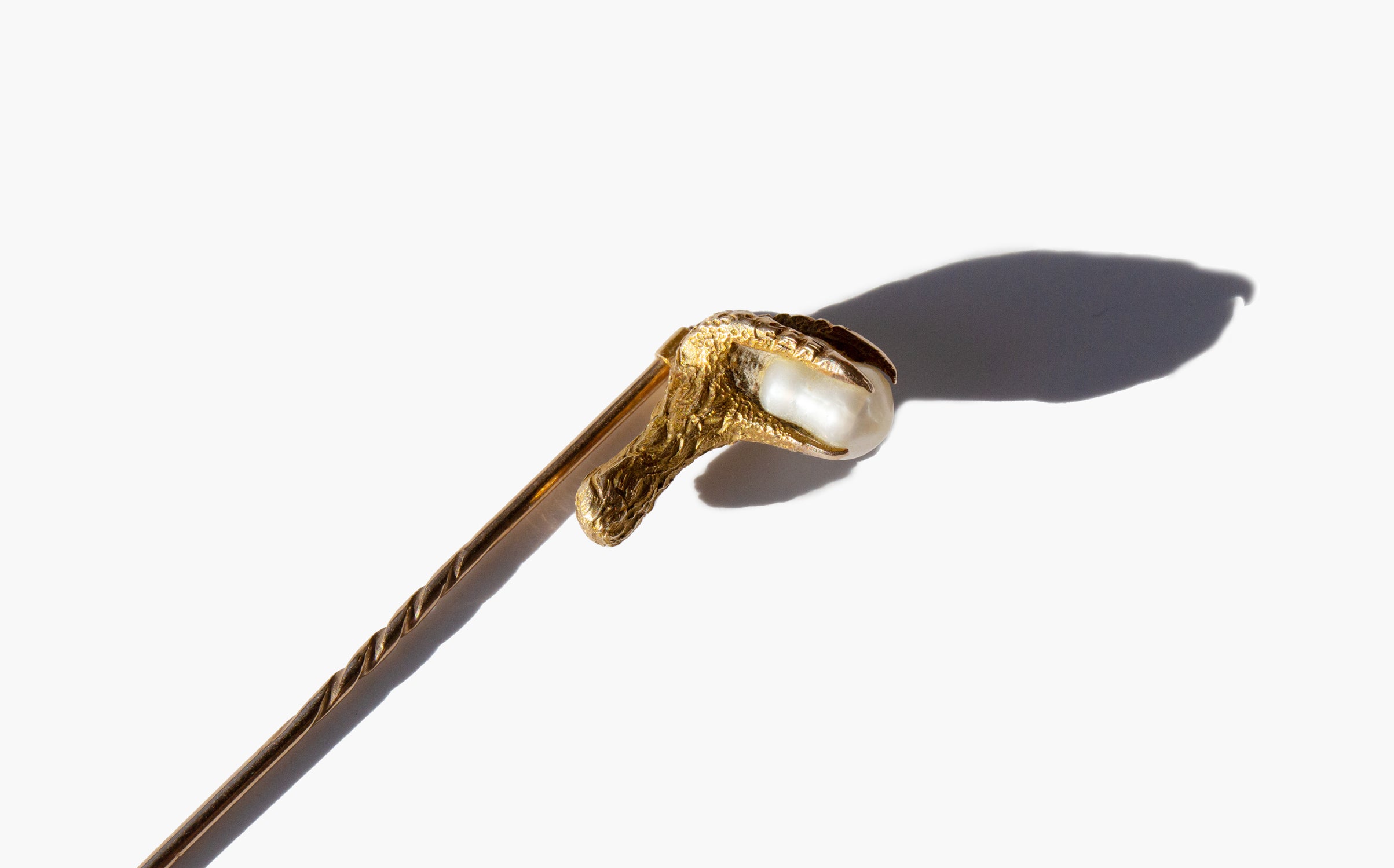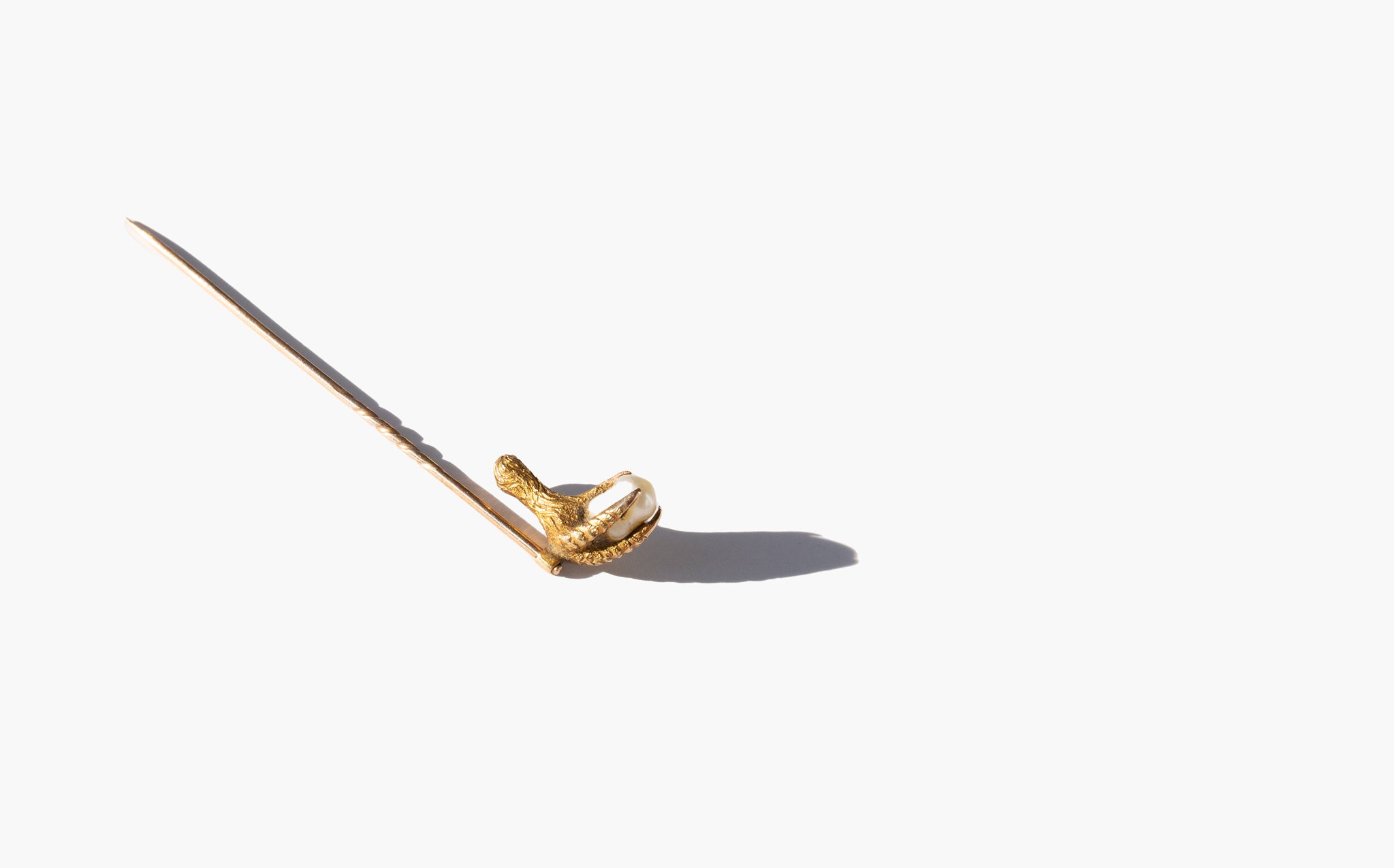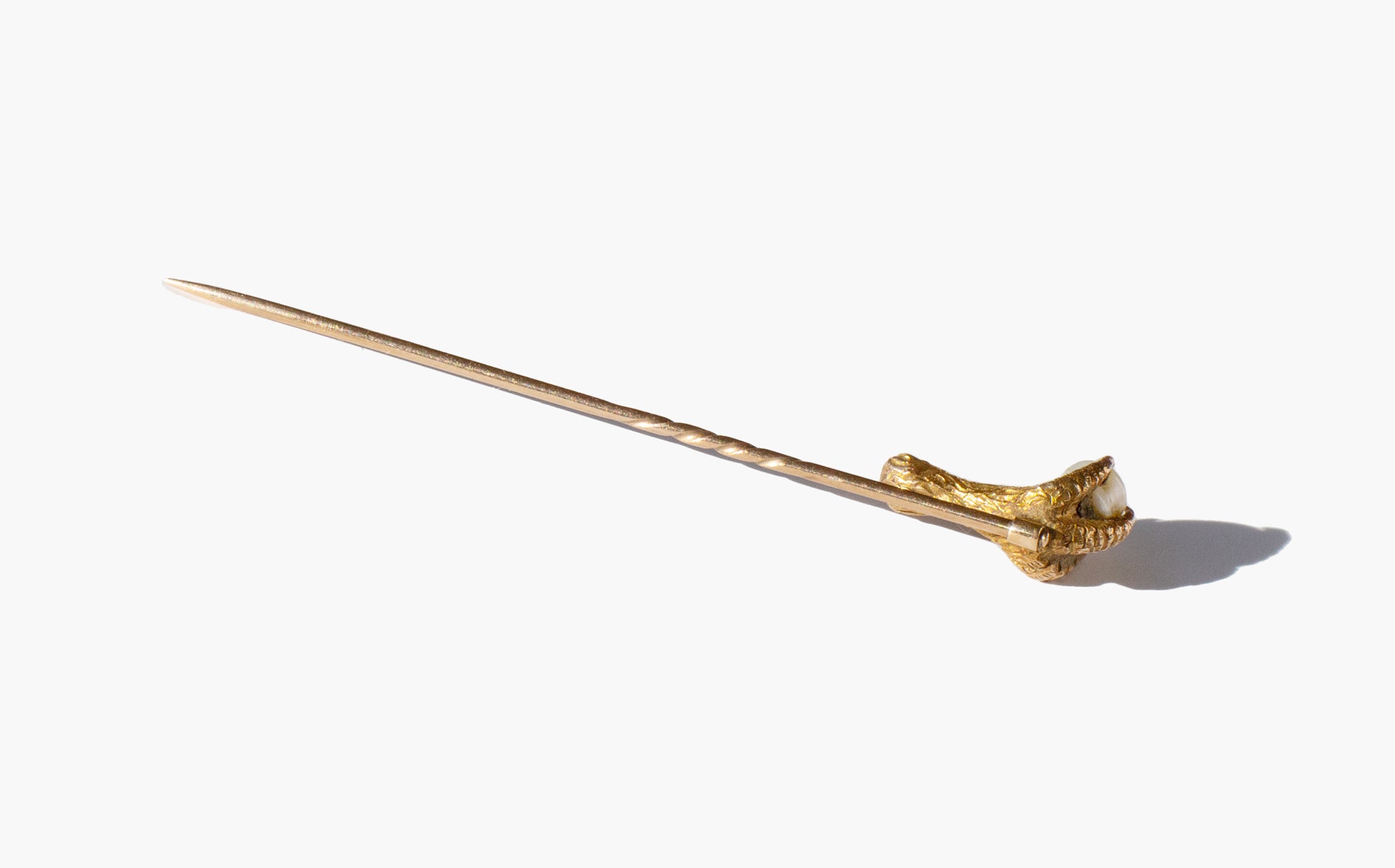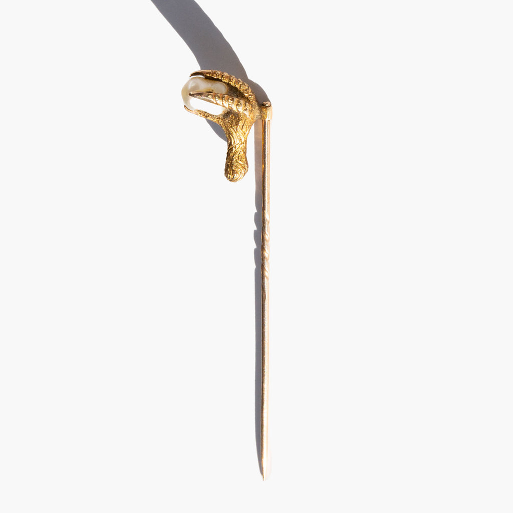 Antique 14k gold stick pin with a chicken foot clutching a small, precious pearl. In magical traditions, chicken feet are associated with purification and protection against evil. Similarly, the pearl is said to grant a wearer extraordinary foresight, protecting them from imminent dangers, and is also an amulet that will guard against the dangers of the Evil Eye.