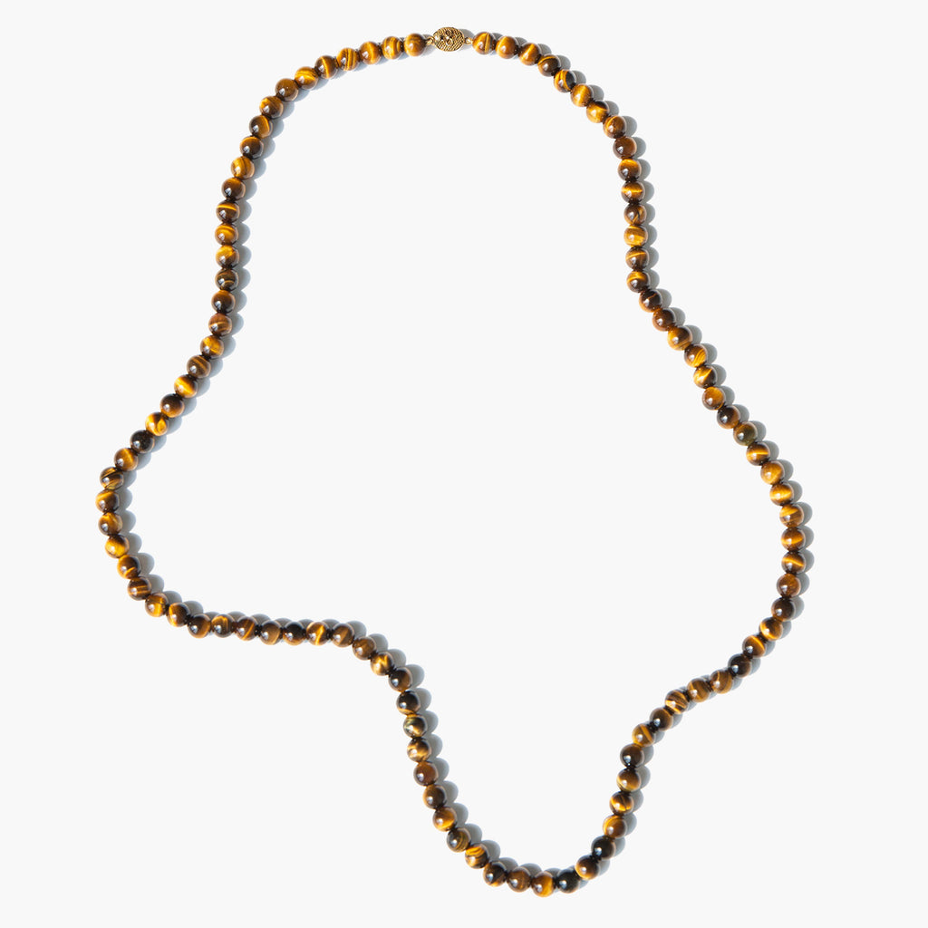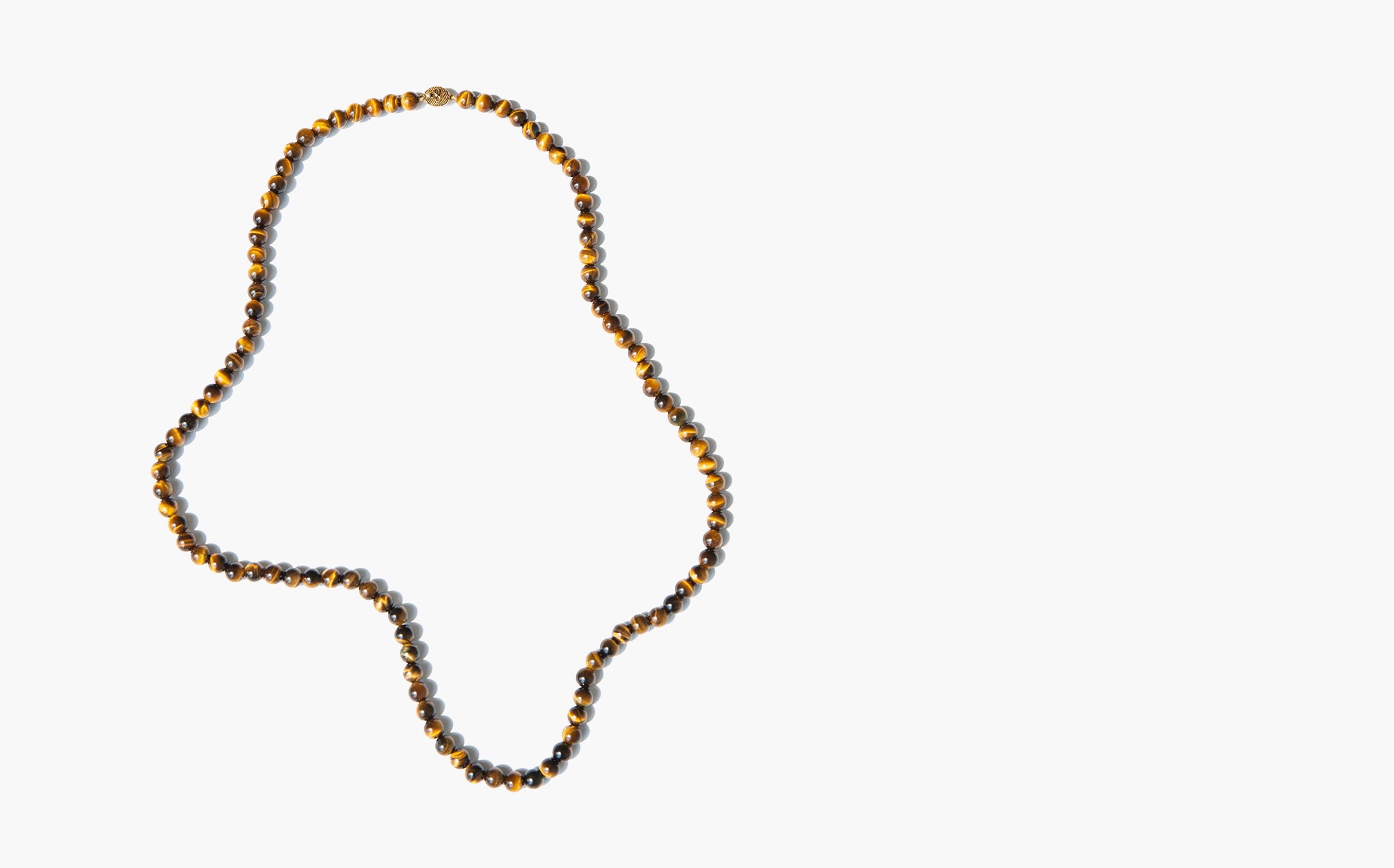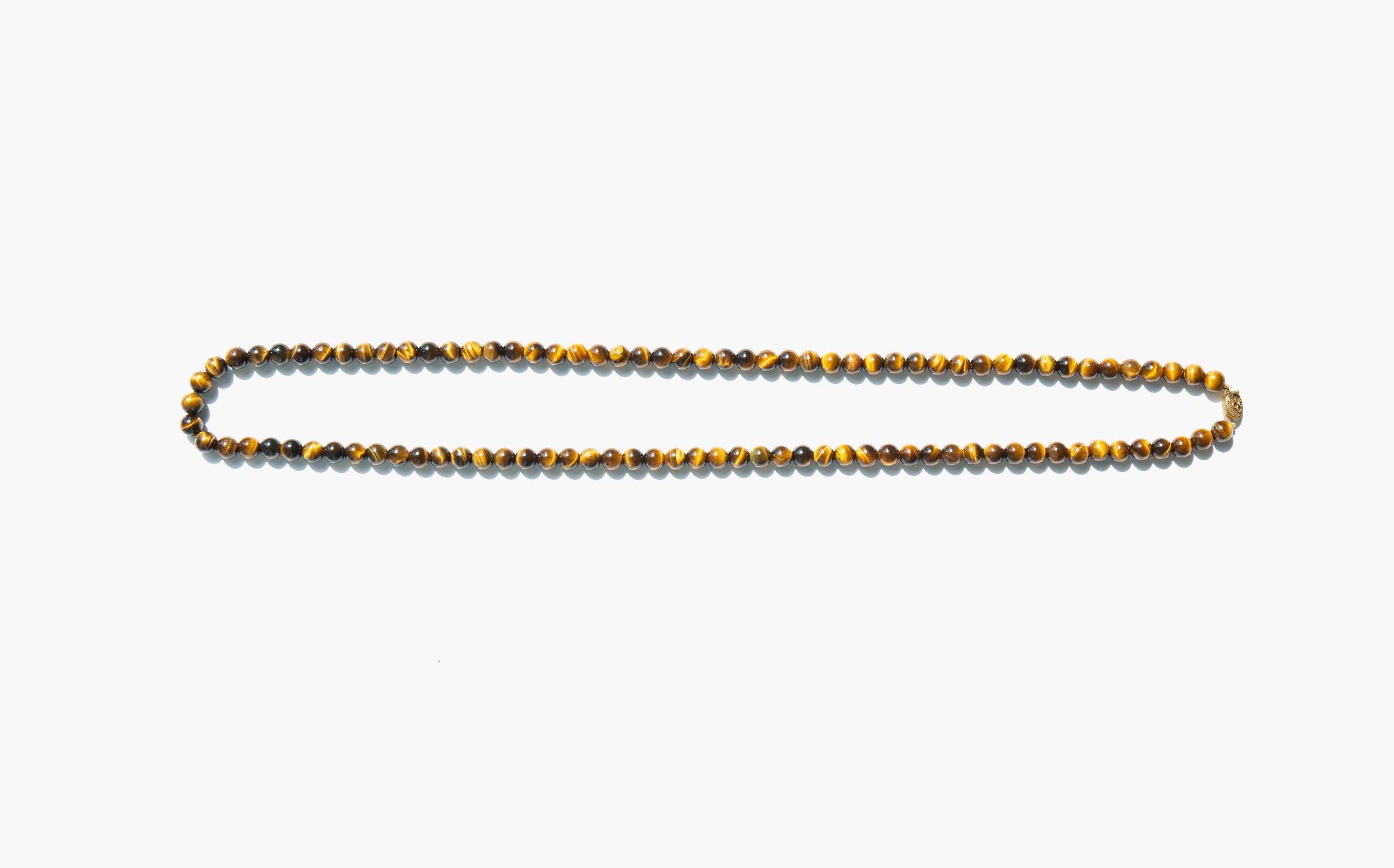 Brilliantly mottled tiger's eye beads with a gold tone silver clasp. An amazing layering piece that can be doubled and worn shorter.
