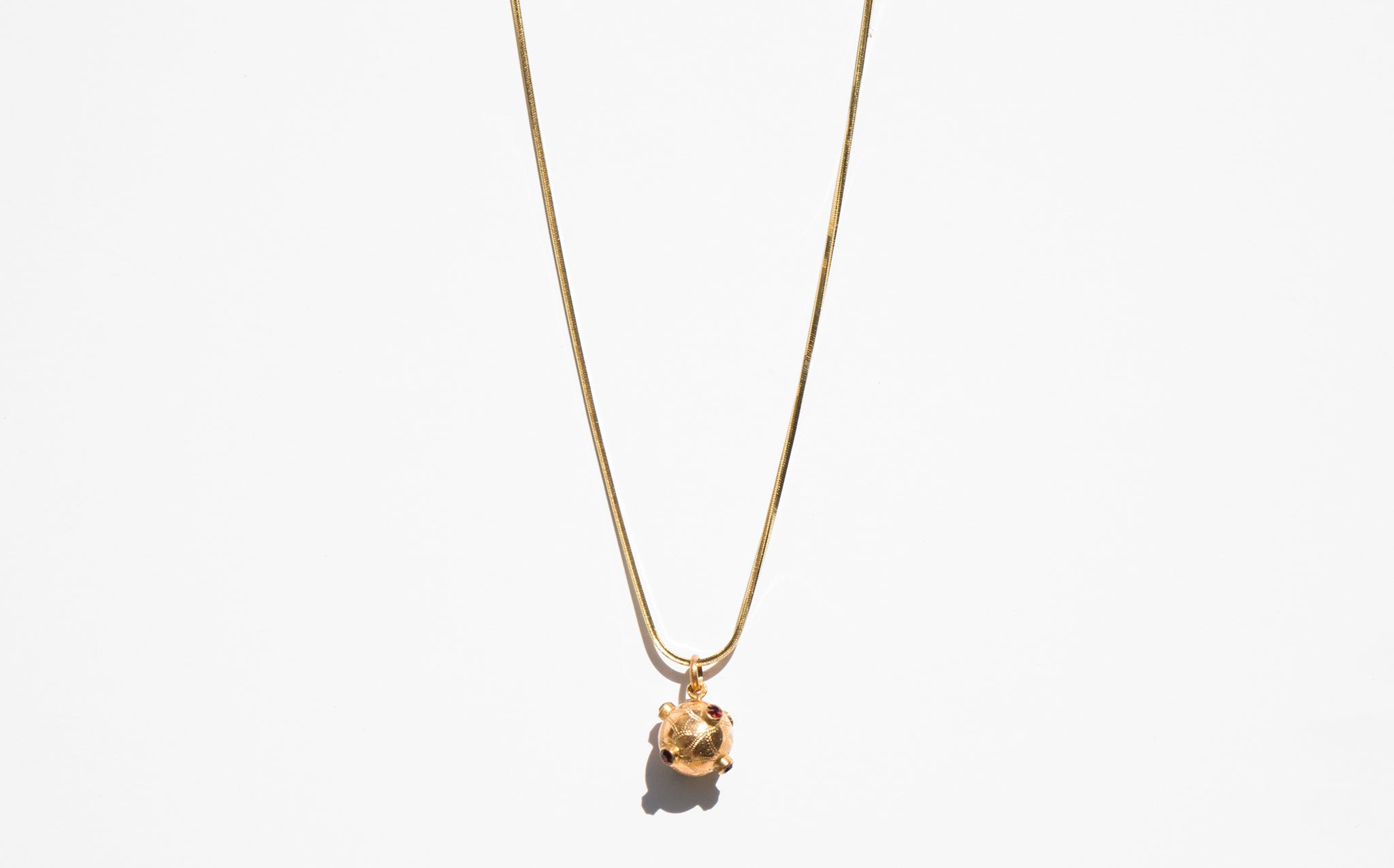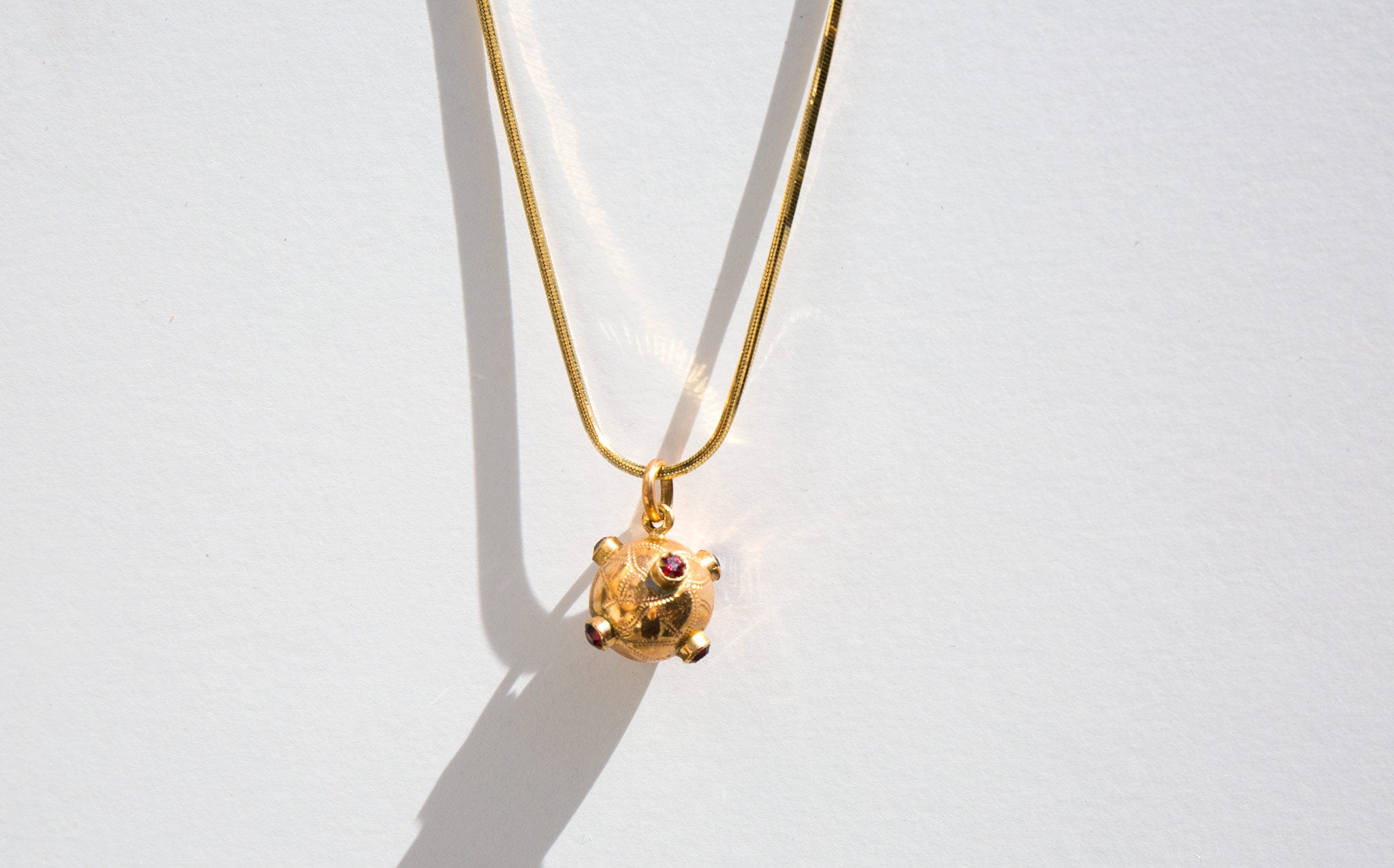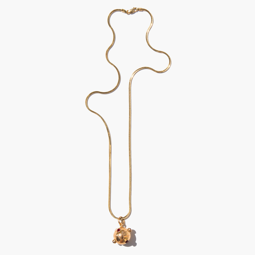18k gold and ruby orb charm on an exquisite solid 18k gold snake chain.
