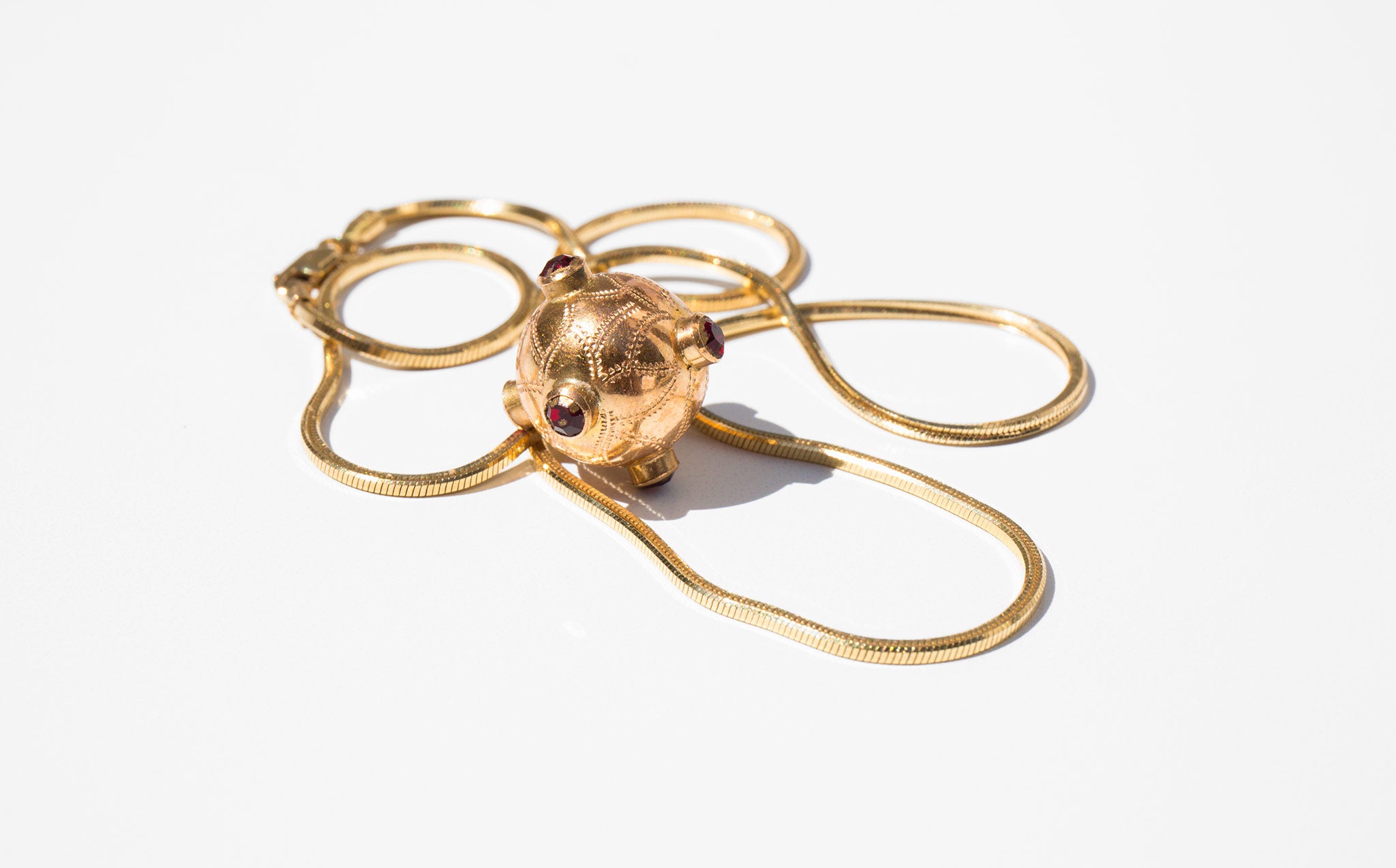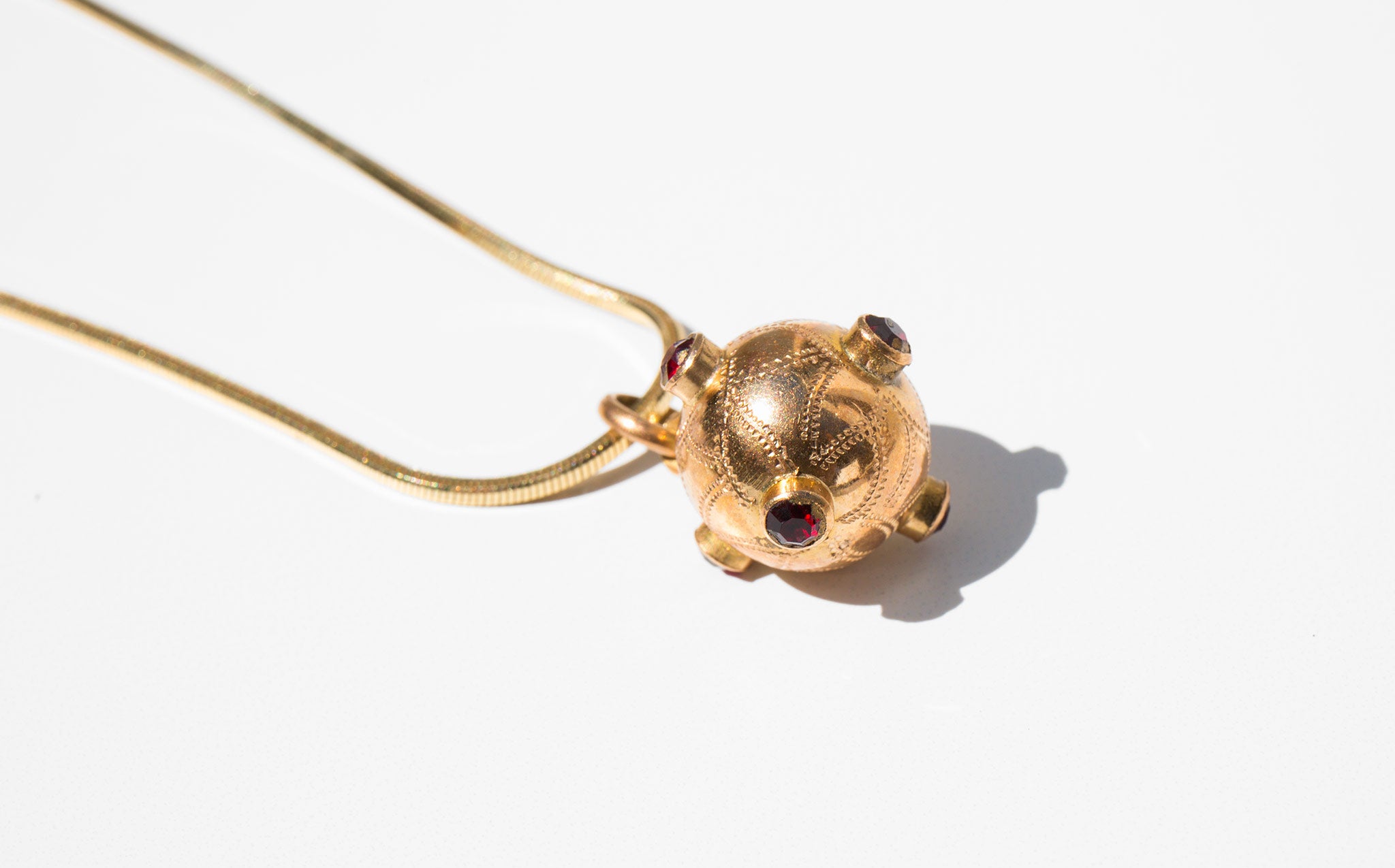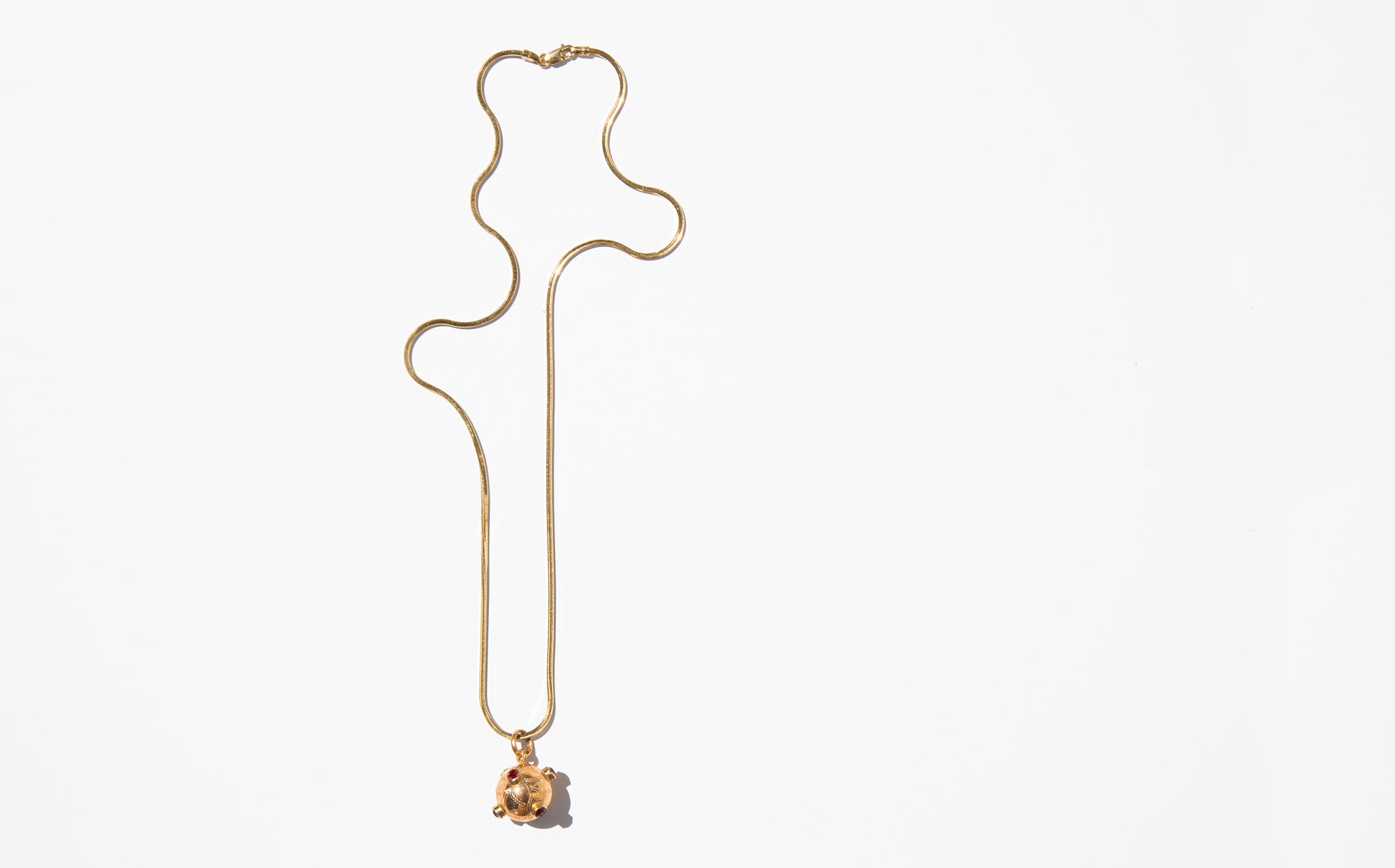 18k gold and ruby orb charm on an exquisite solid 18k gold snake chain.