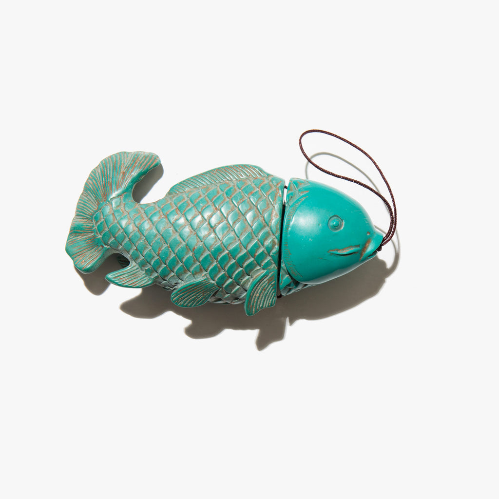 Bright turquoise hanging fish ornament with hidden erotic scenes that are revealed when you separate the head and body.