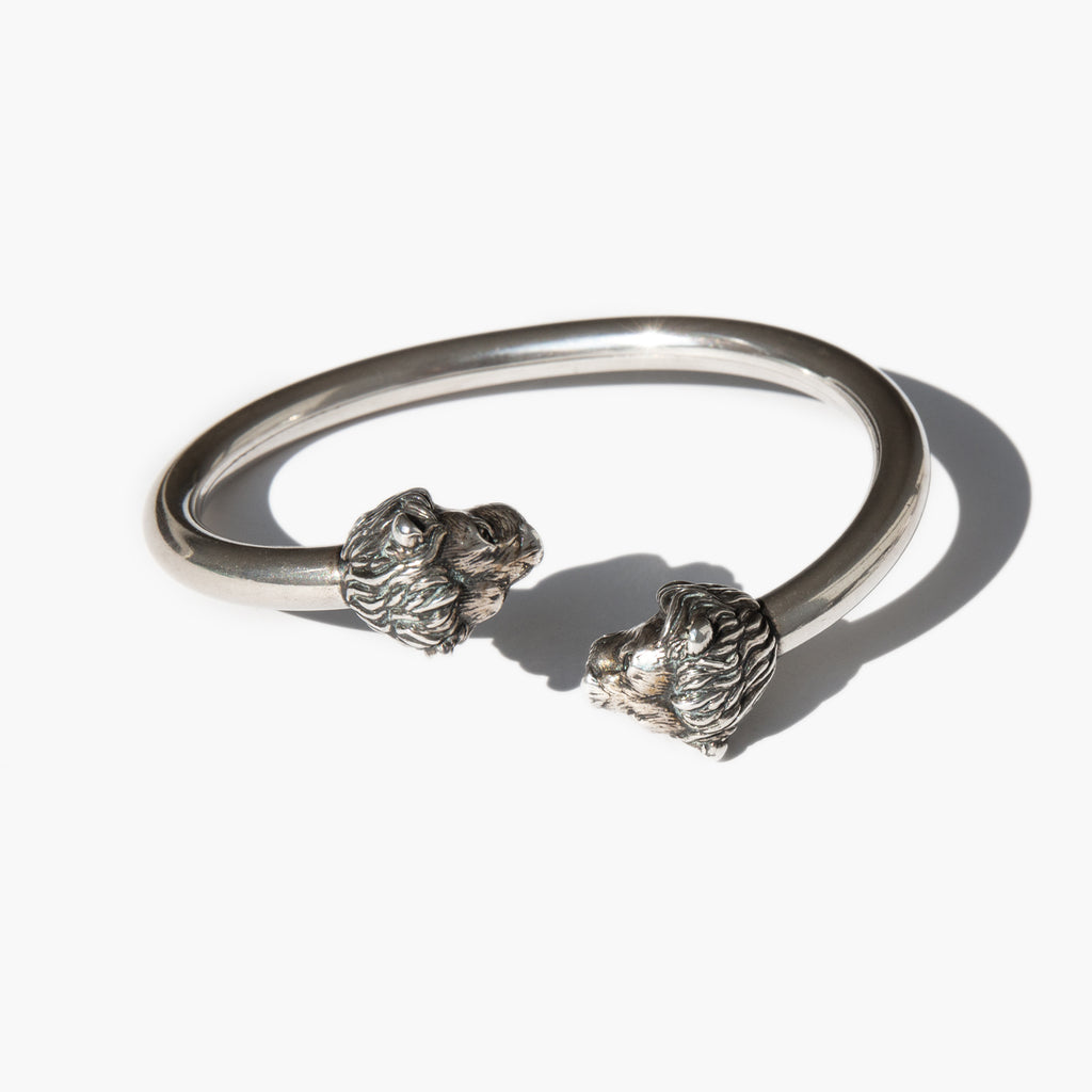 Weighty and fabulous sterling silver bangle tipped with regal lion heads. The lion or "king of beasts" symbolizes independence, courage, and strength of character.
