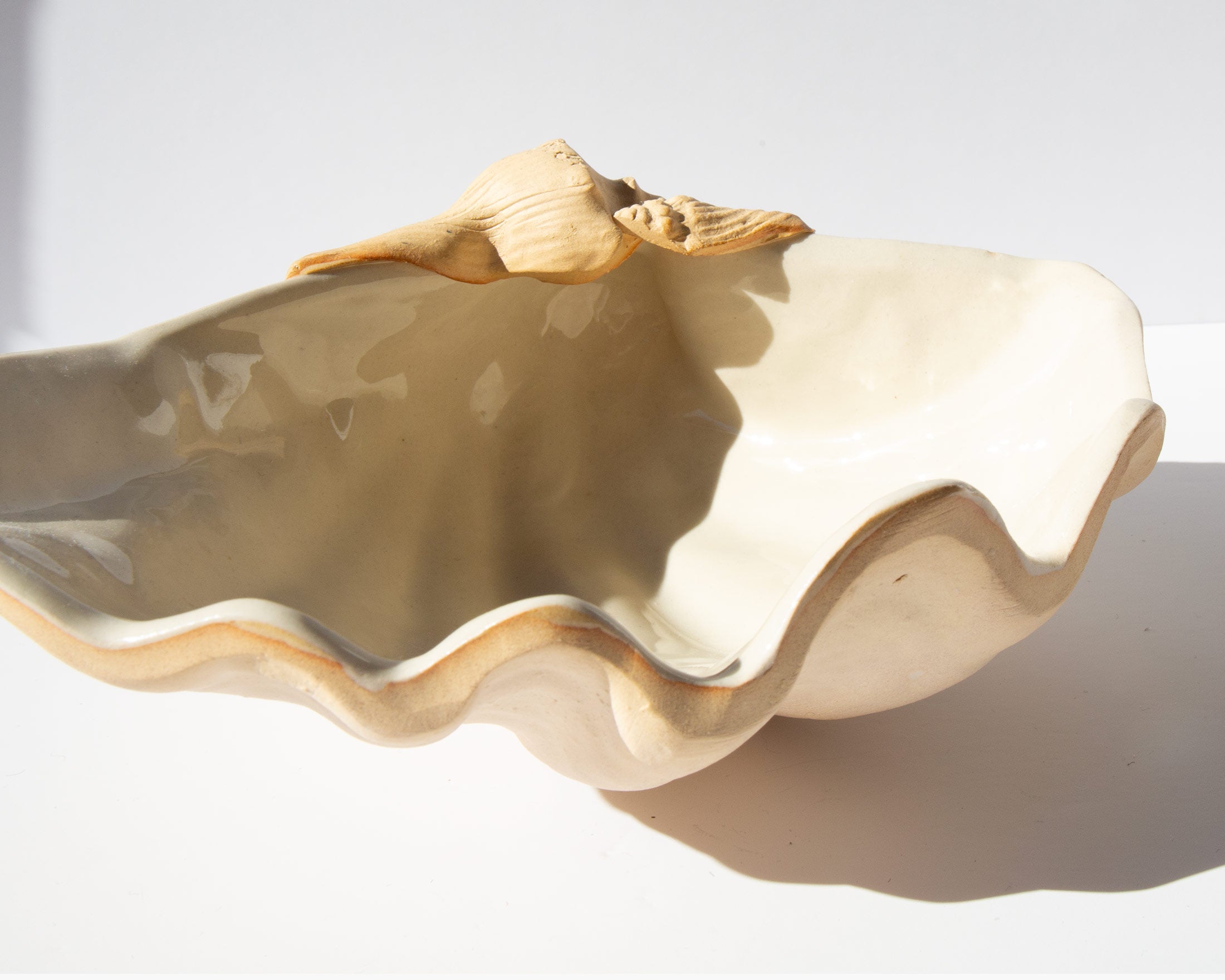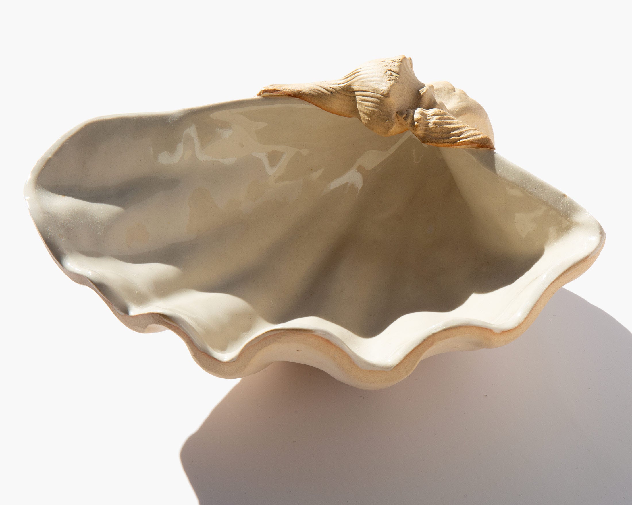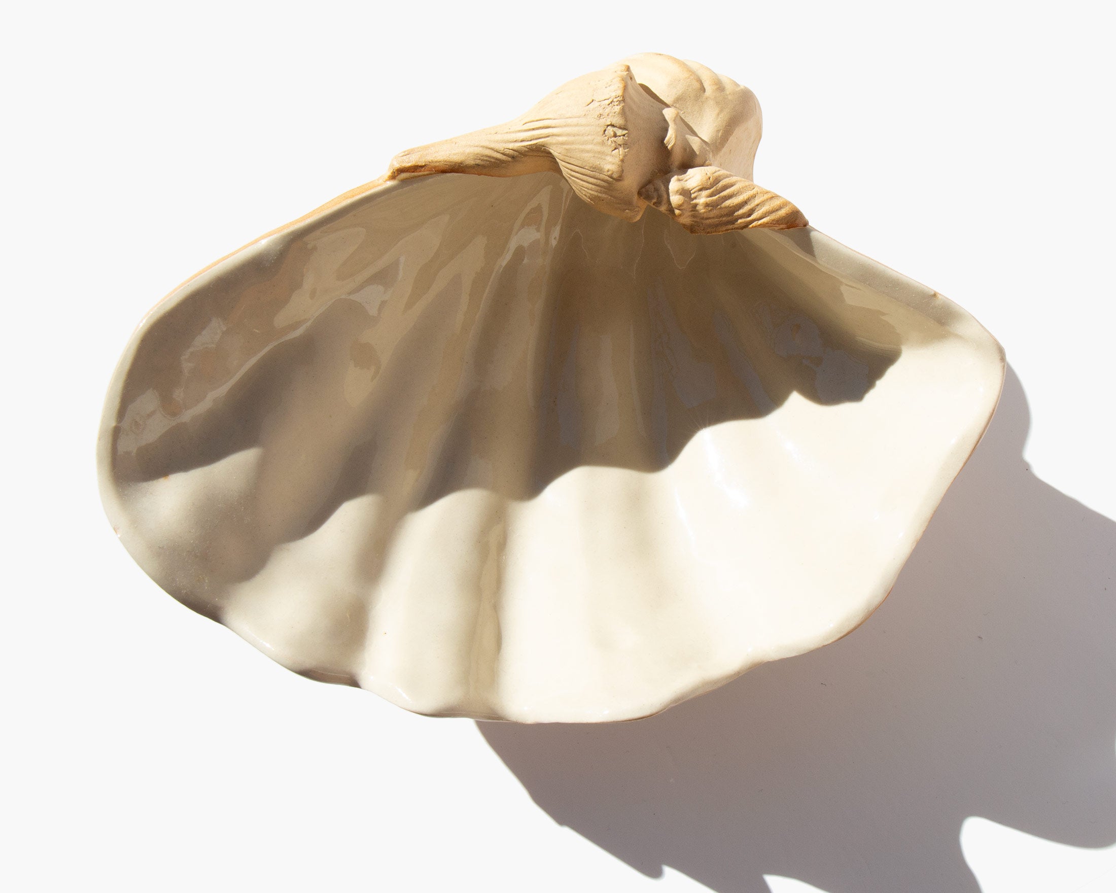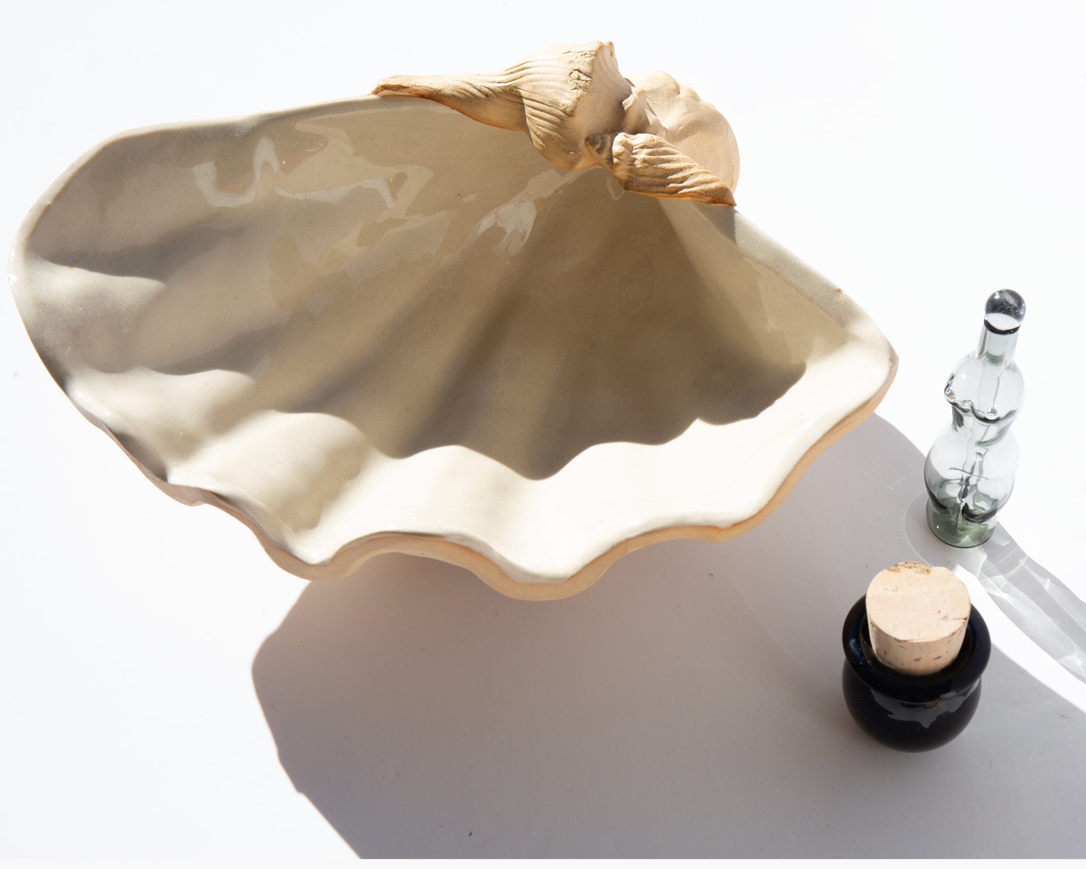 Artist signed pottery seashell bowl, a perfect size for jewelry and other treasures on the vanity. Seashells have been deeply symbolic in art and literature throughout history, and are often associated with love, fertility, and salvation.