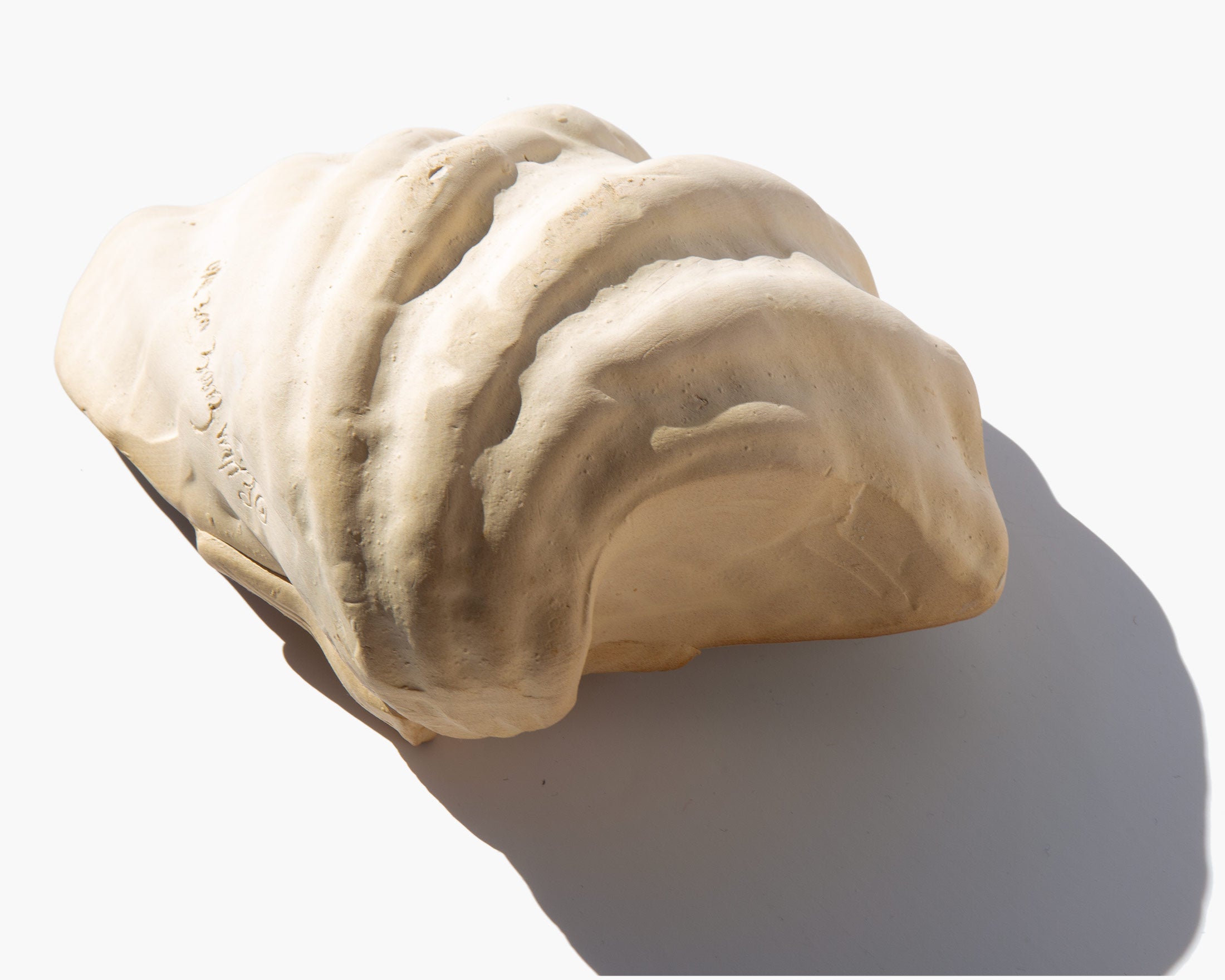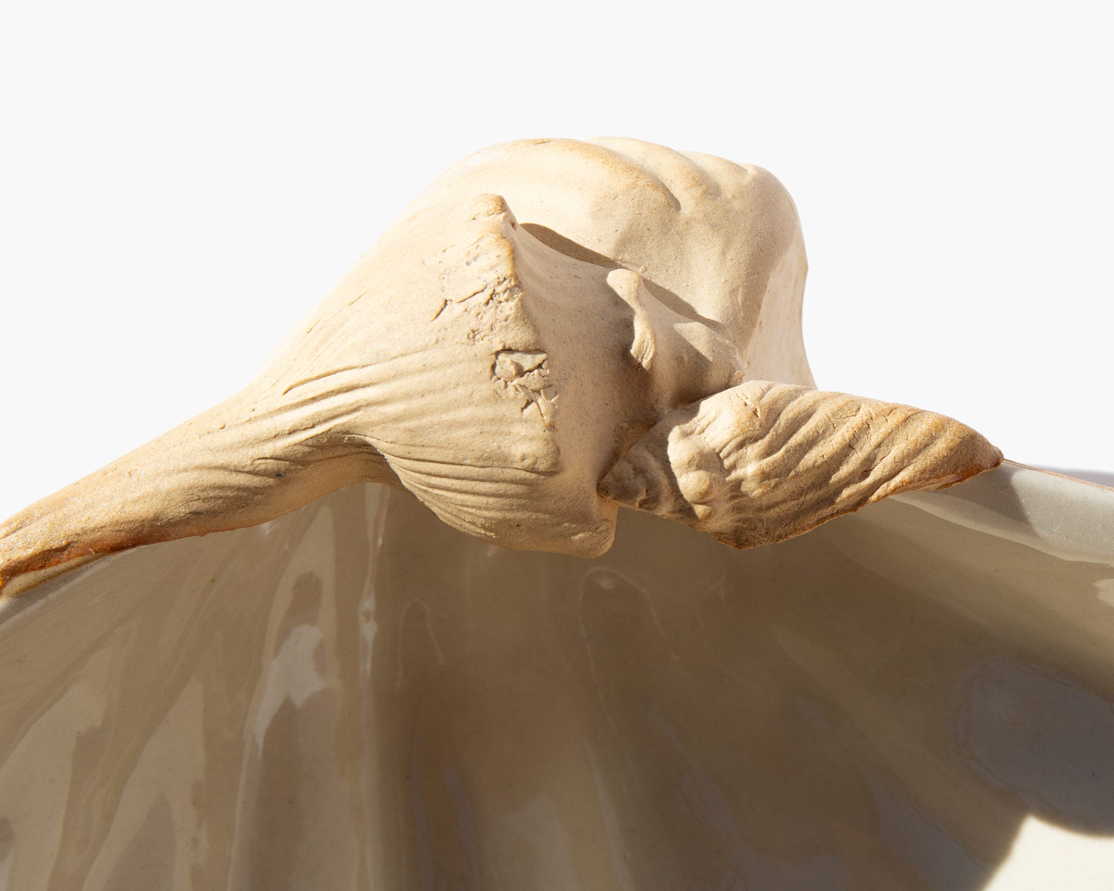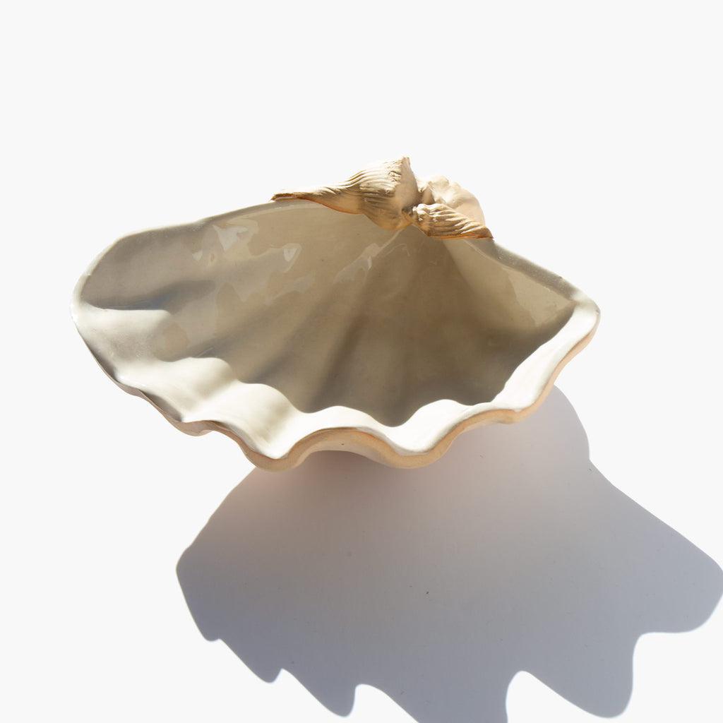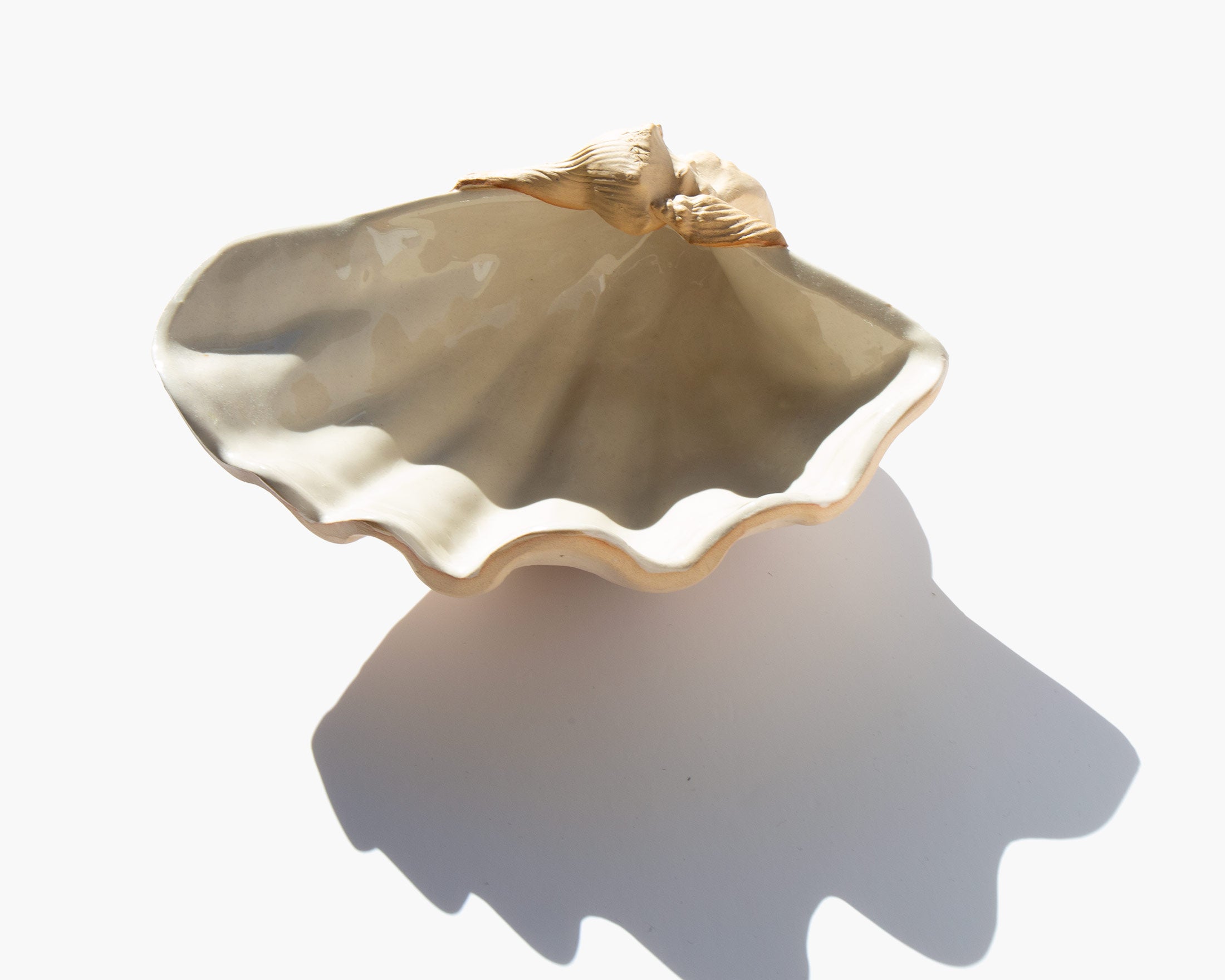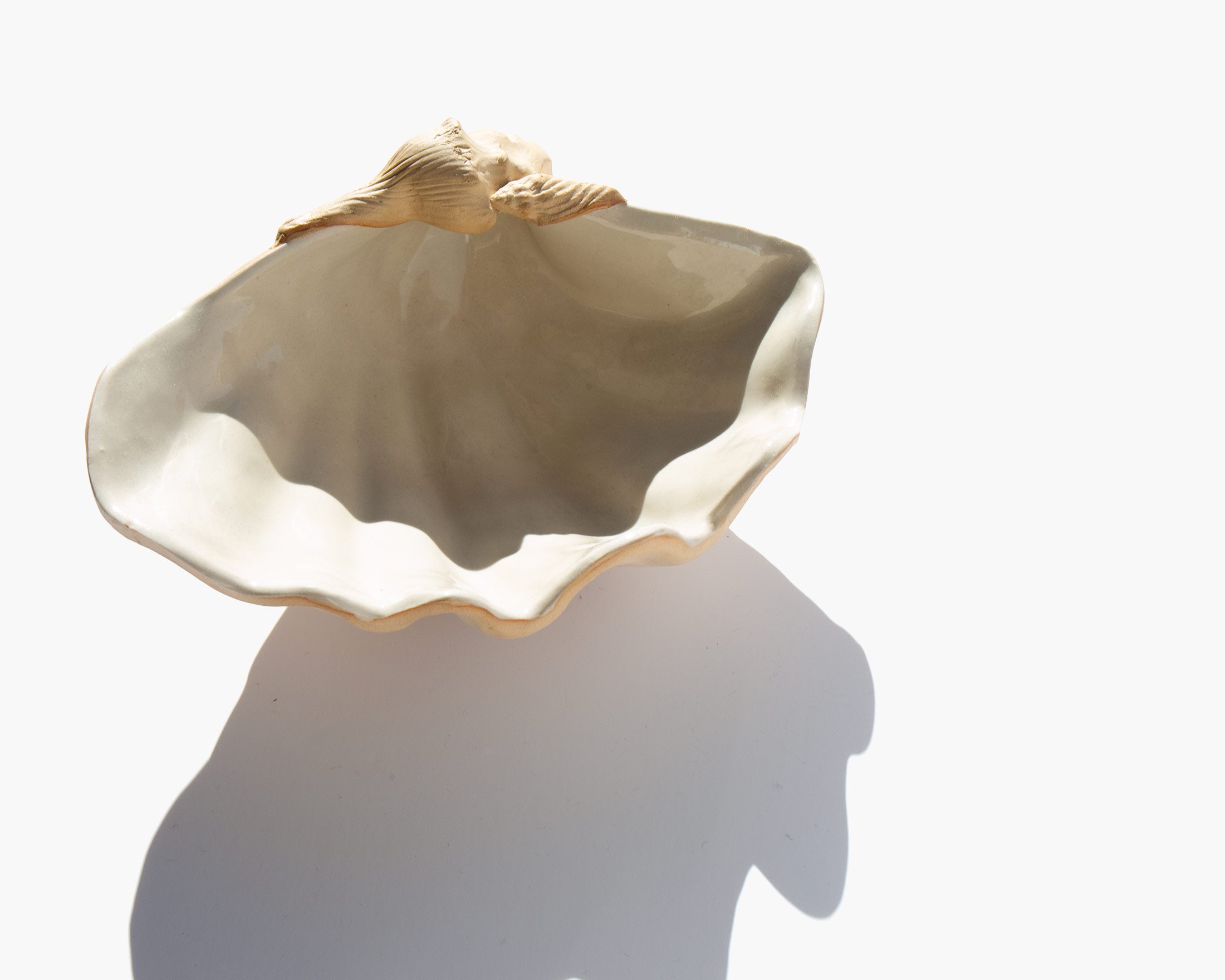 Artist signed pottery seashell bowl, a perfect size for jewelry and other treasures on the vanity. Seashells have been deeply symbolic in art and literature throughout history, and are often associated with love, fertility, and salvation.