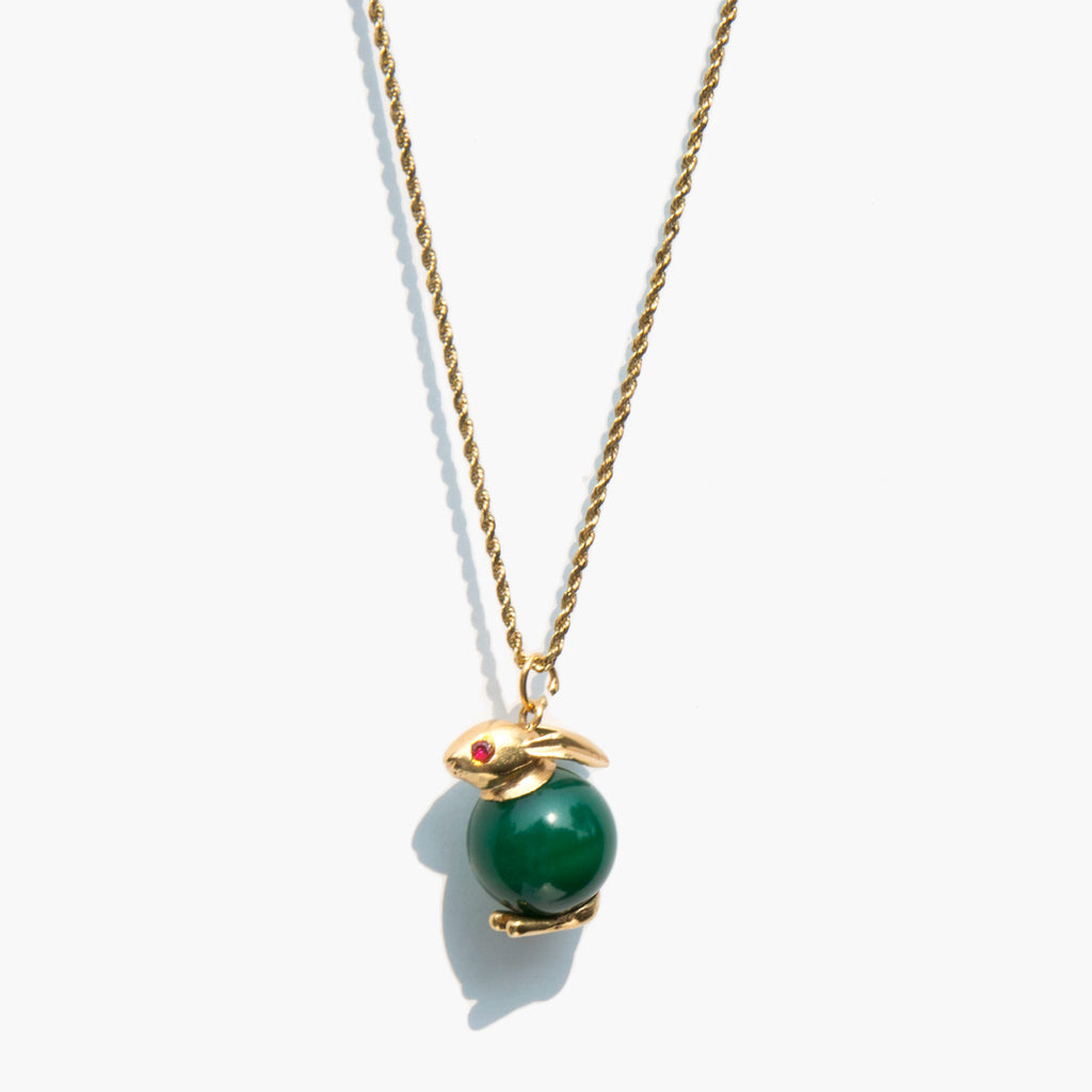 14k gold and onyx rabbit charm on a 14k gold rope chain. Rabbits have been considered a symbol of luck and good fortune for centuries. The rabbits foot is thought to be particularly lucky, probably through an association with a macabre old European custom called The Hand of Glory, wherein the pickled left hand of a hanged criminal was prepared with a candle and "would render motionless all persons to whom it was presented."
