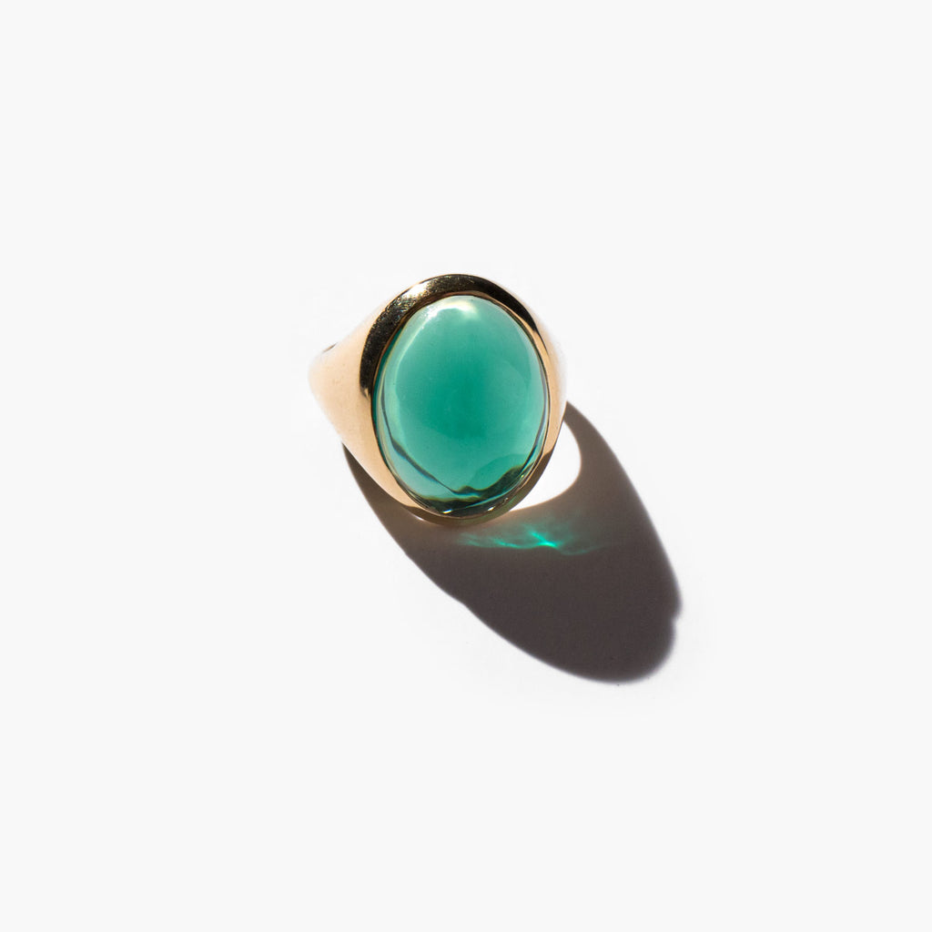 Beautifully clear, large green quartz cabochon set in a chic, simple 14k gold setting. Green quartz is known as an energy healer – a stone that absorbs negativity and transforms such psychically depleting energy into a more positive and powerful emotional space. Green quartz is also known as a lucky stone because once freed from the bonds of these draining, negative cycles, the wearer is more open to kindness, happiness, and love. **THIS RING SHIPS BY 8/31**
