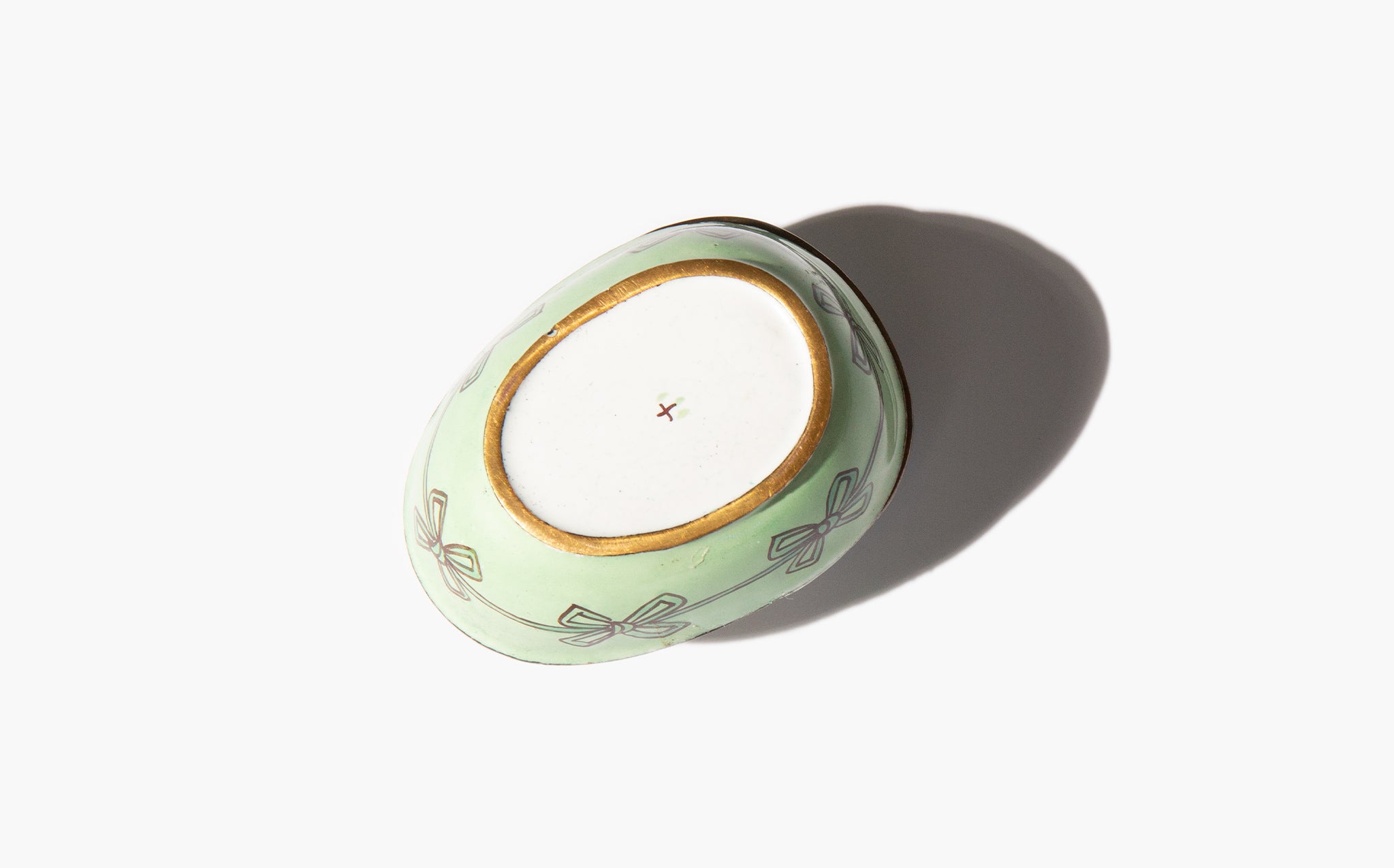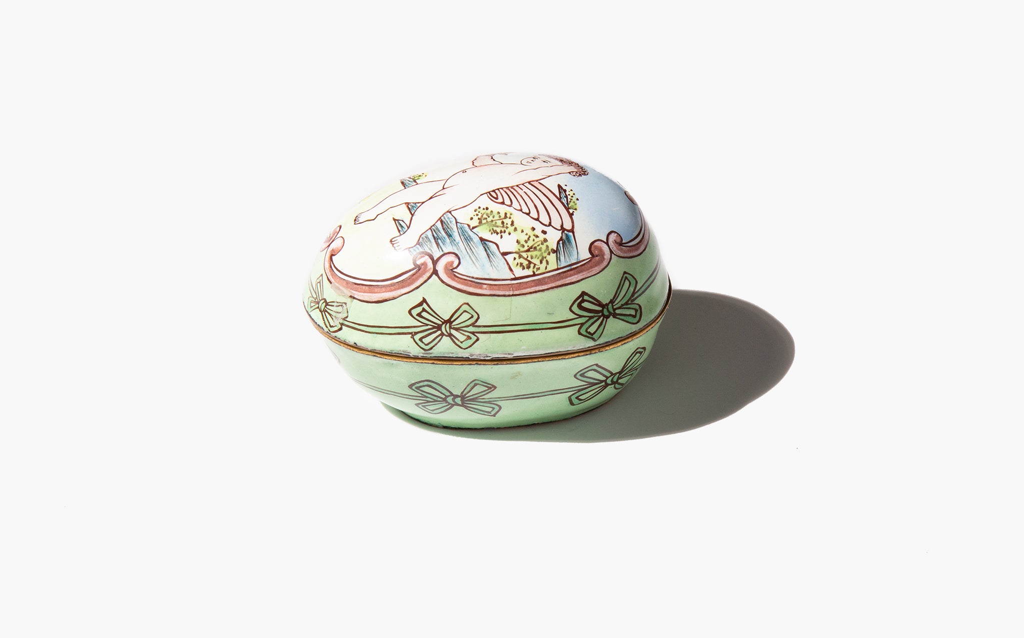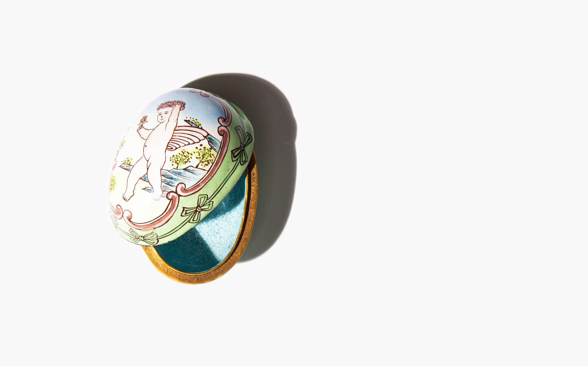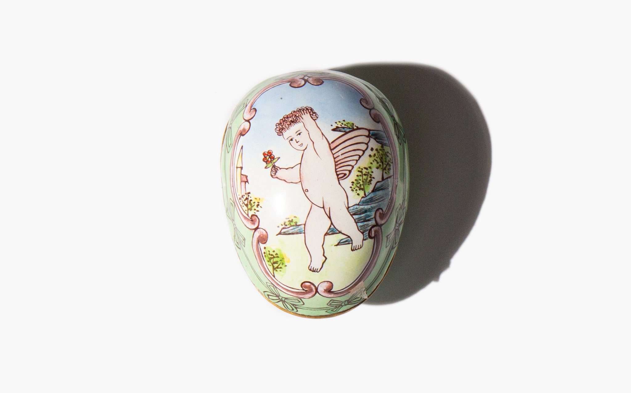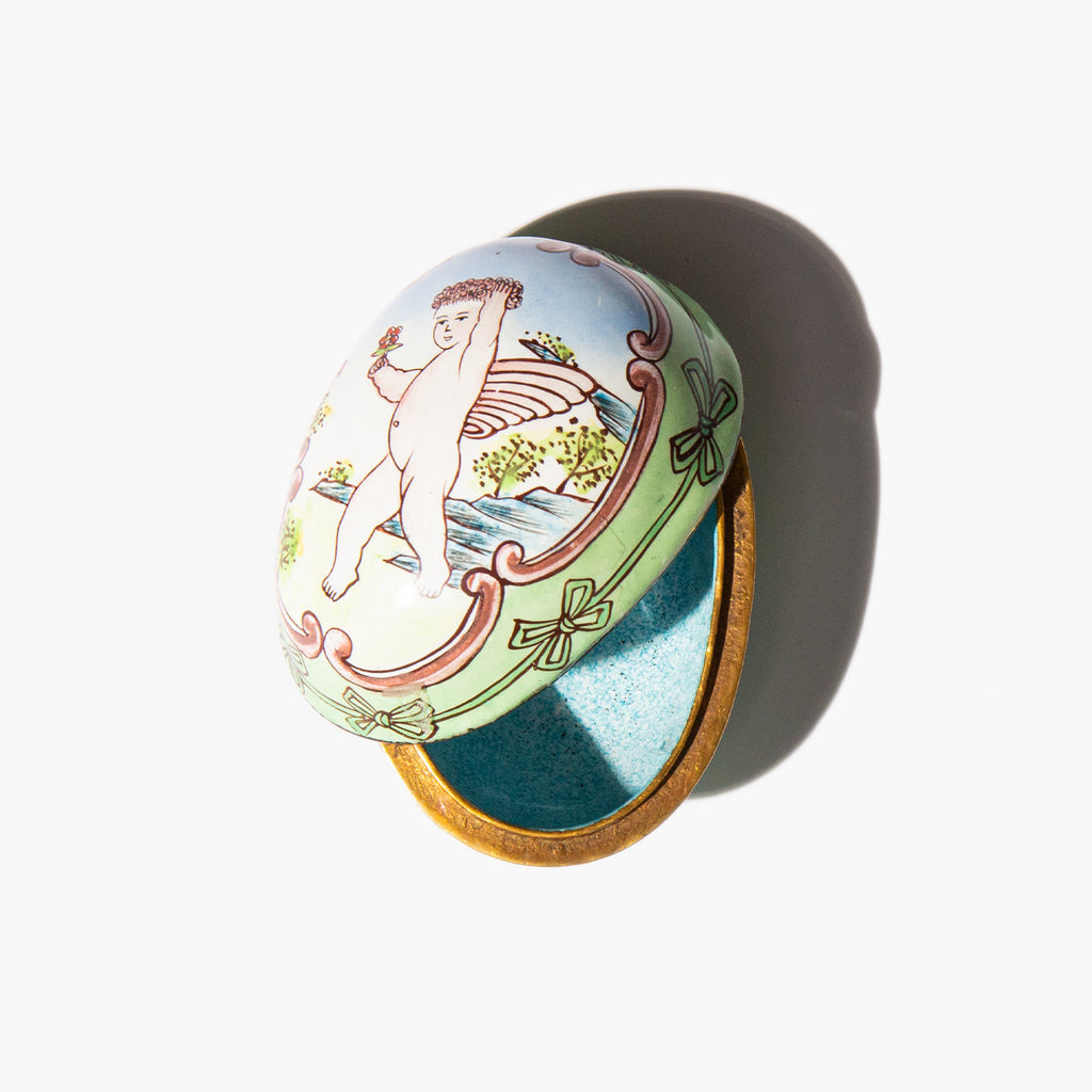 Antique hand painted enamel Battersea box depicting a cherub cavorting in the spring grass.