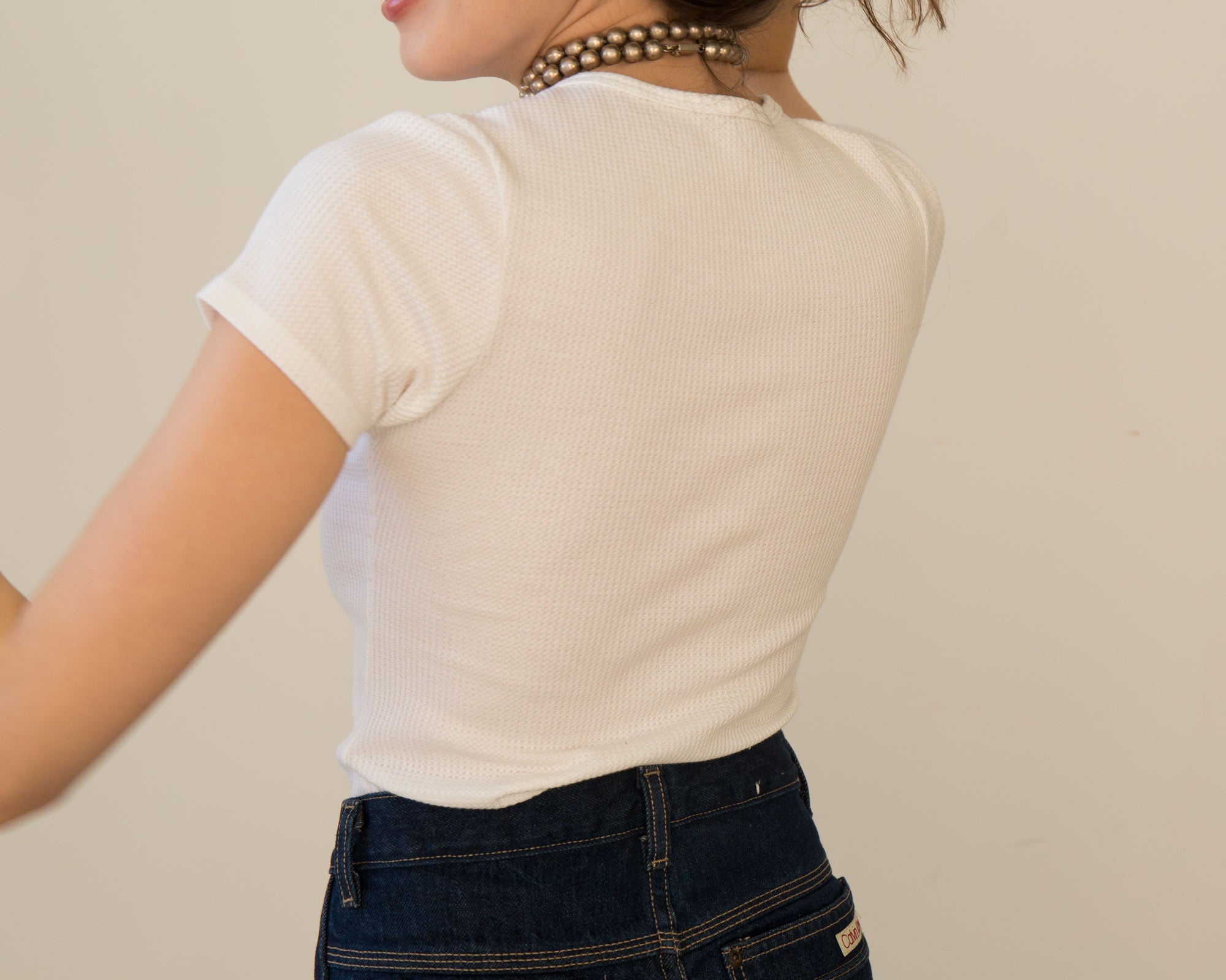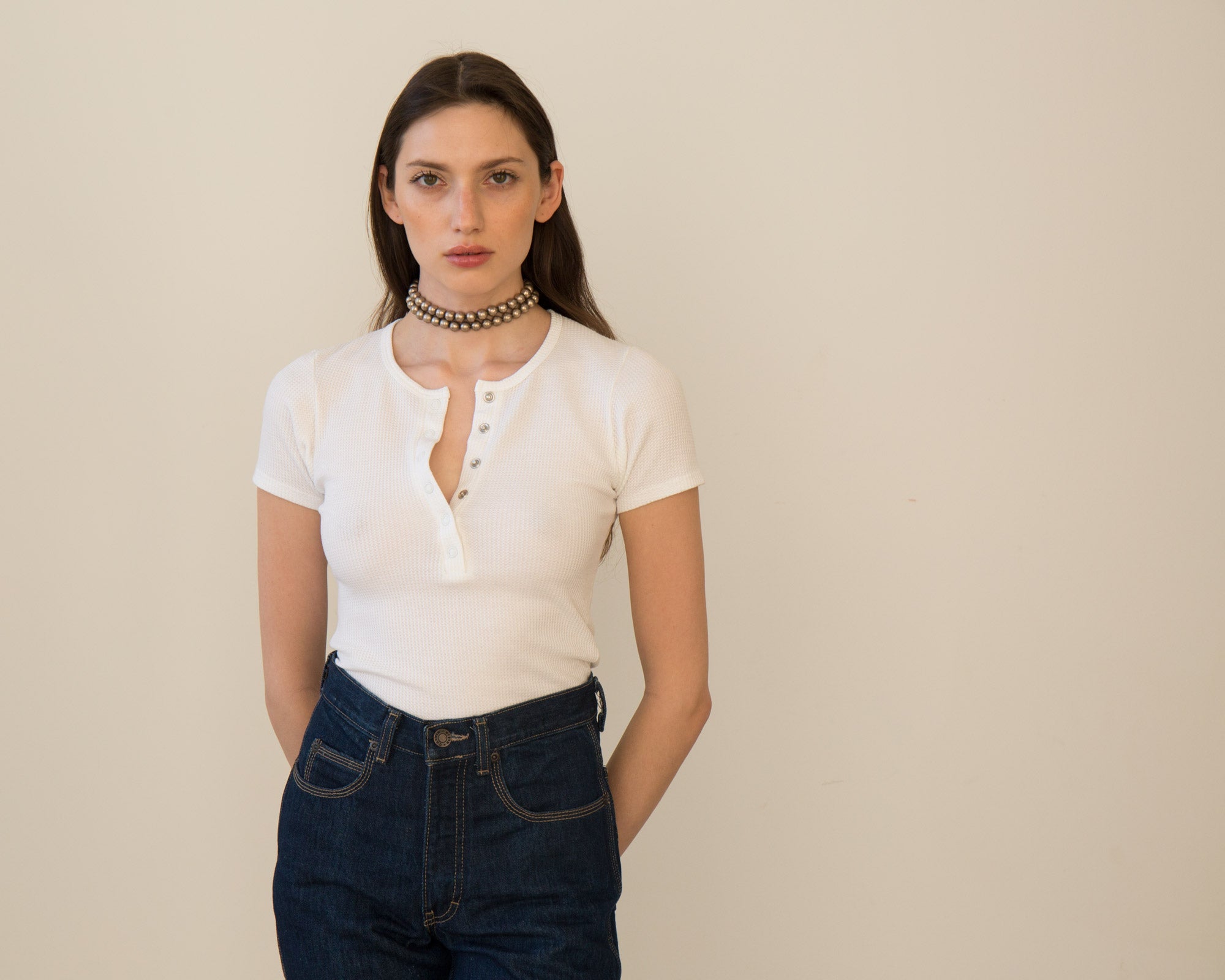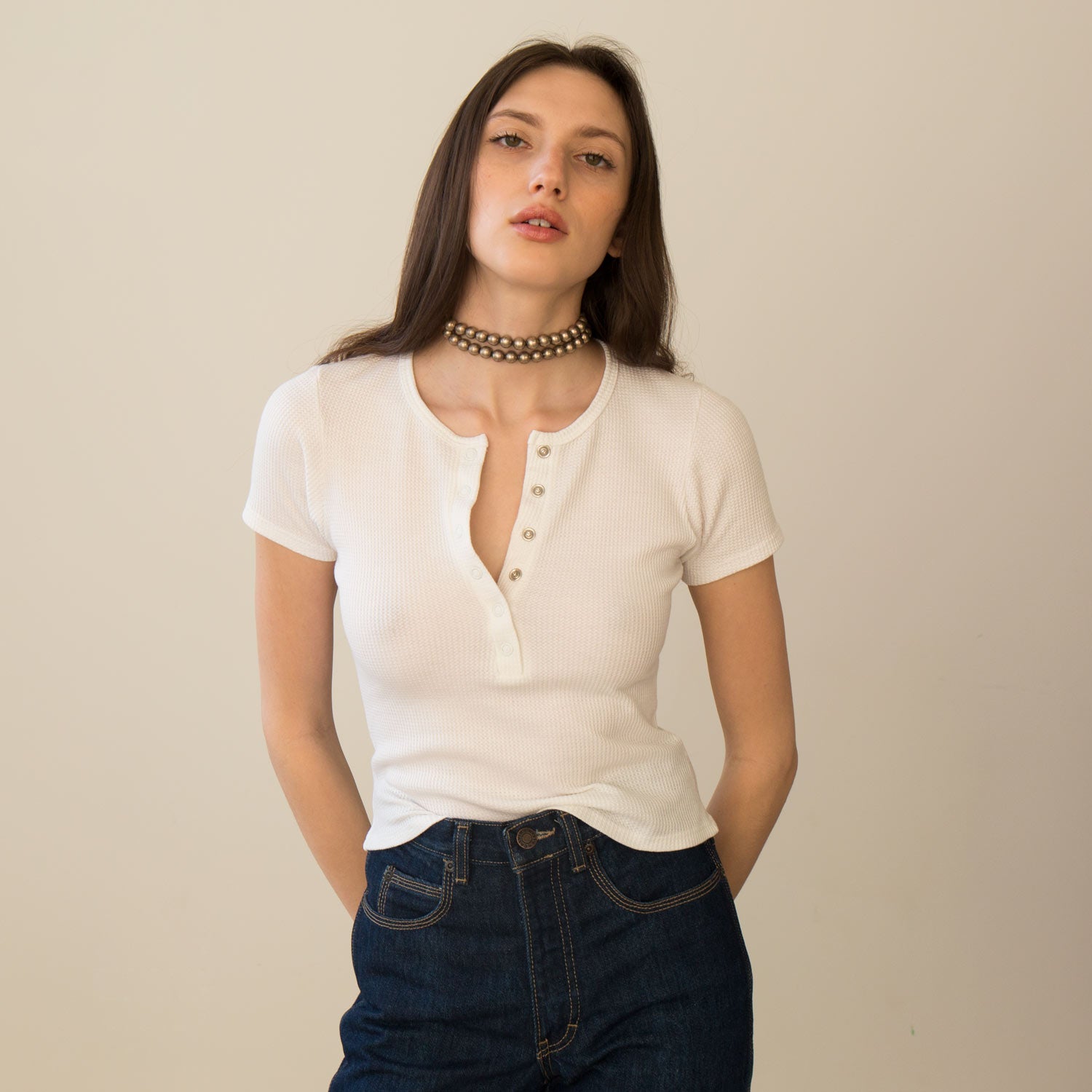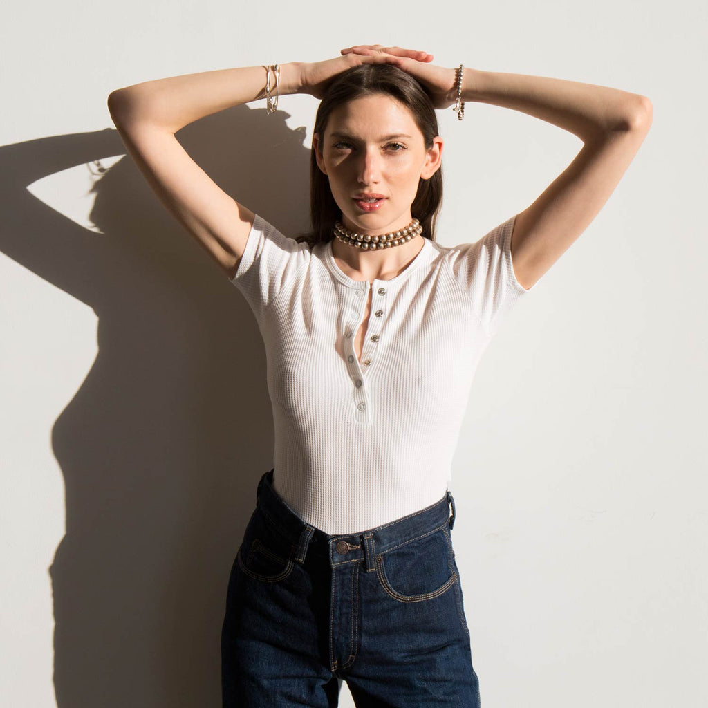 Our day to night – a form fitting and cropped tee with a deep, snap front v-neck that can be worn open or buttoned-up. Made in a soft deadstock cotton waffle knit fabric.