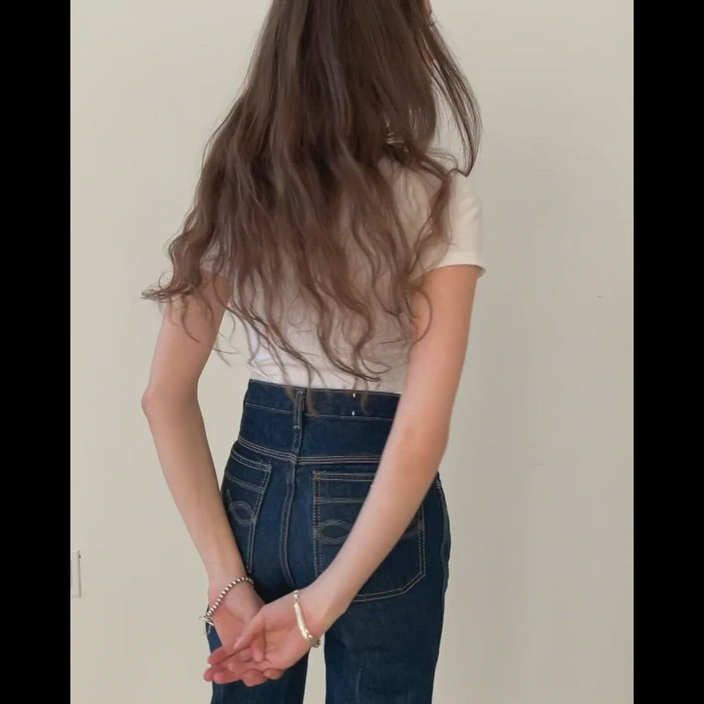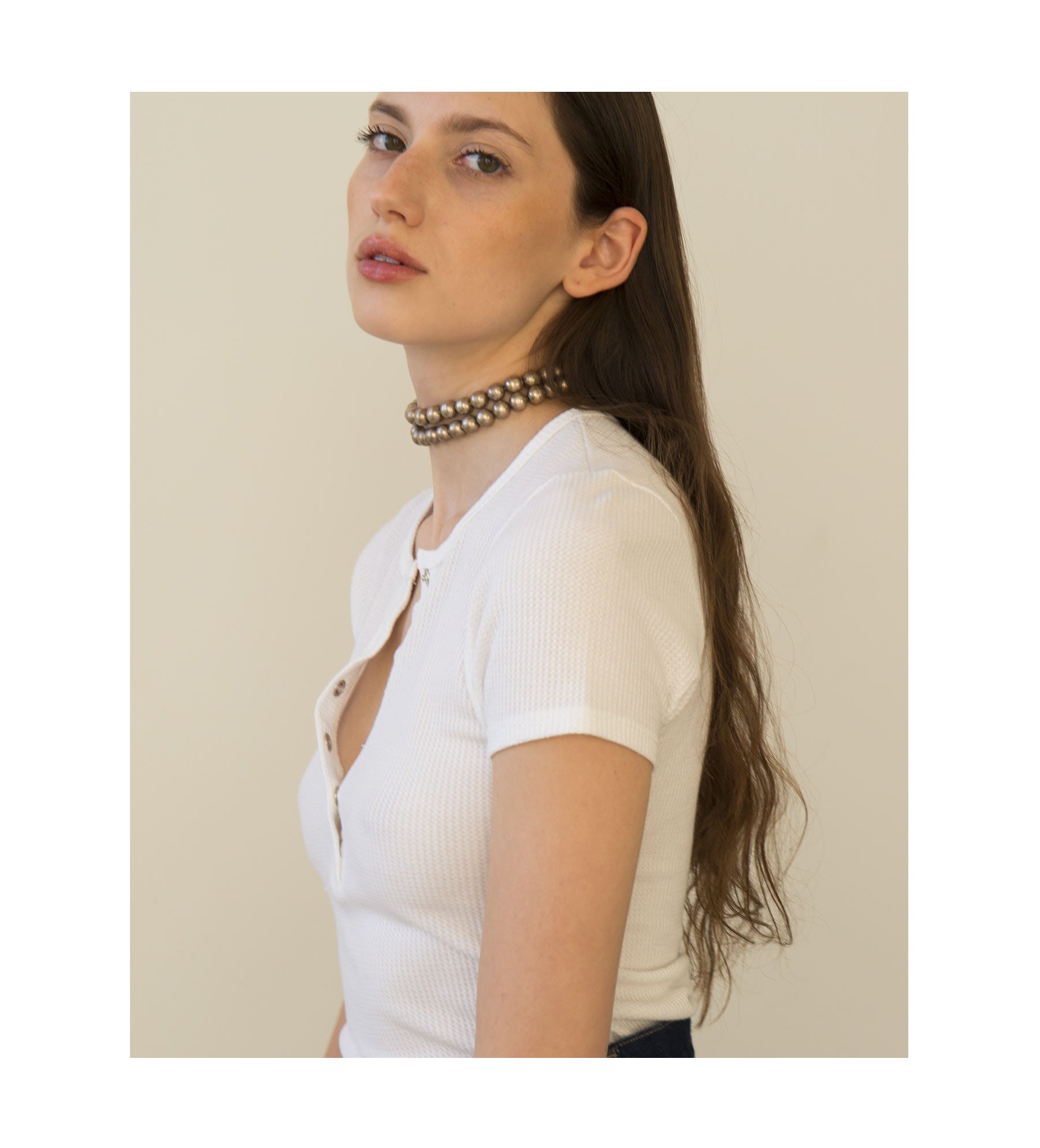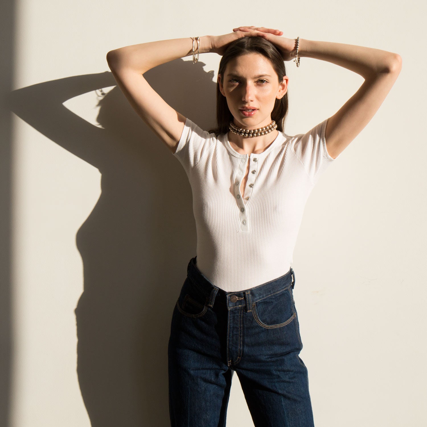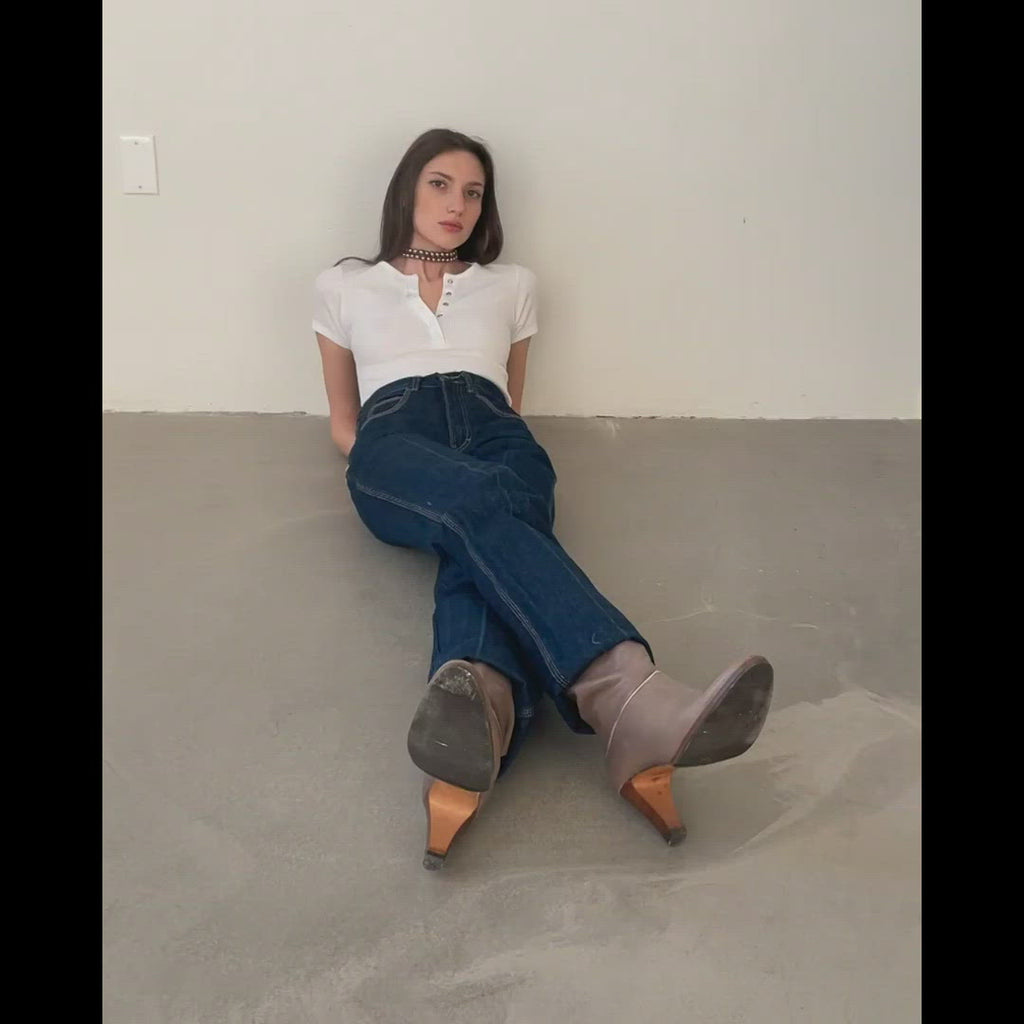 Our day to night – a form fitting and cropped tee with a deep, snap front v-neck that can be worn open or buttoned-up. Made in a soft deadstock cotton waffle knit fabric.