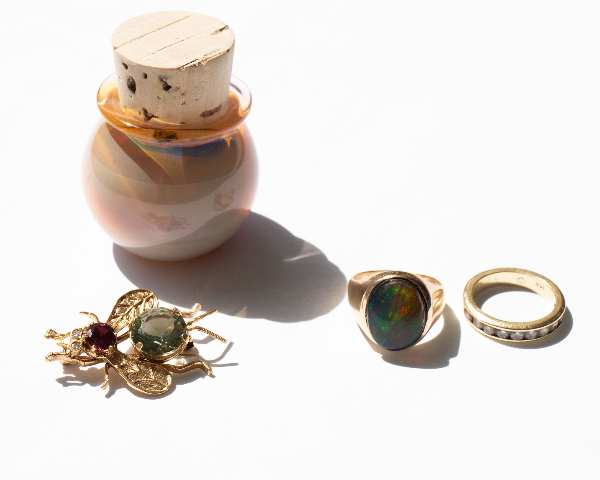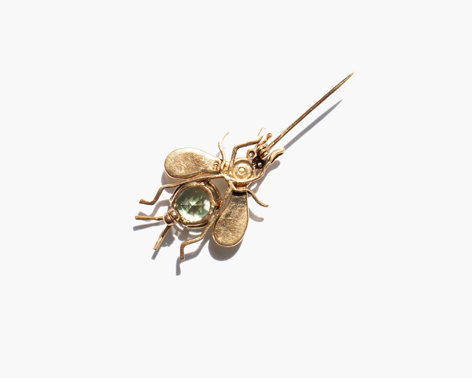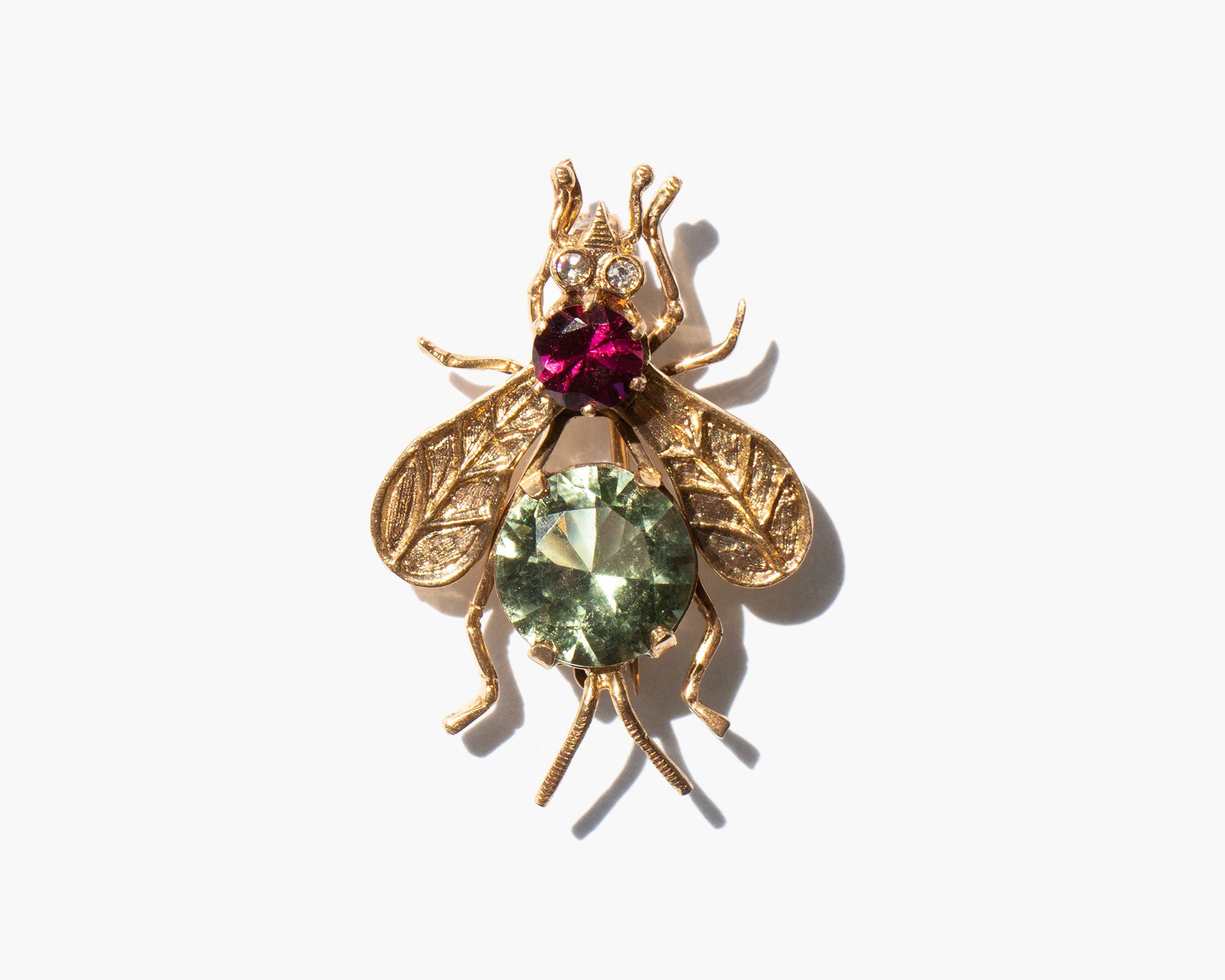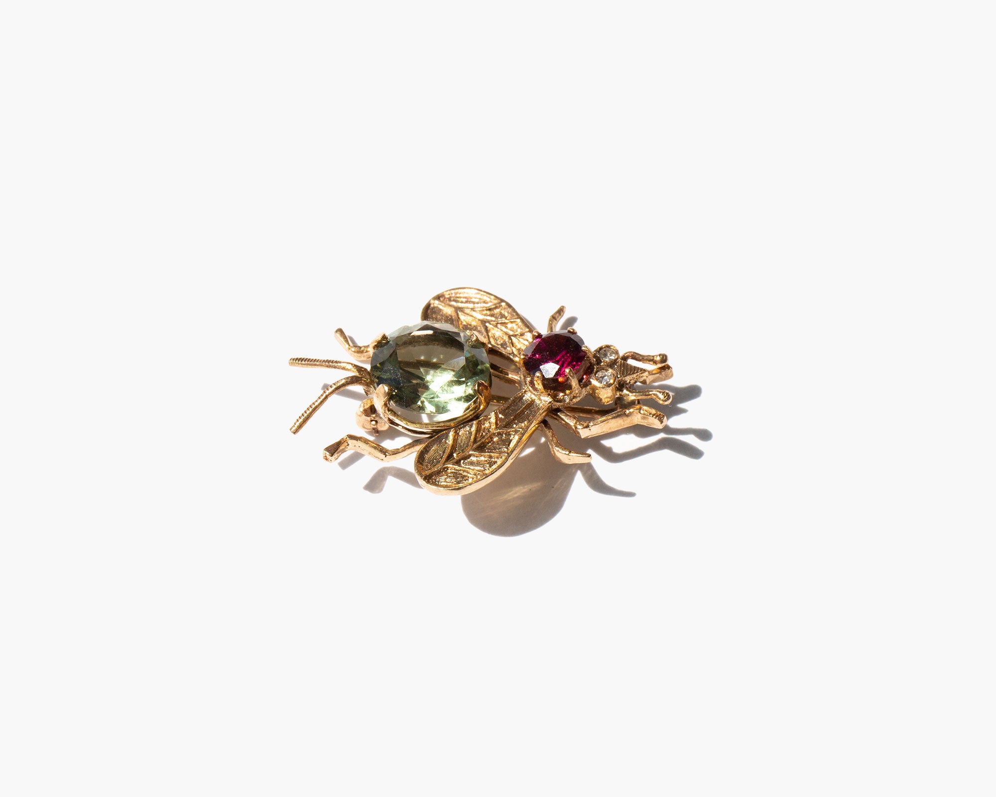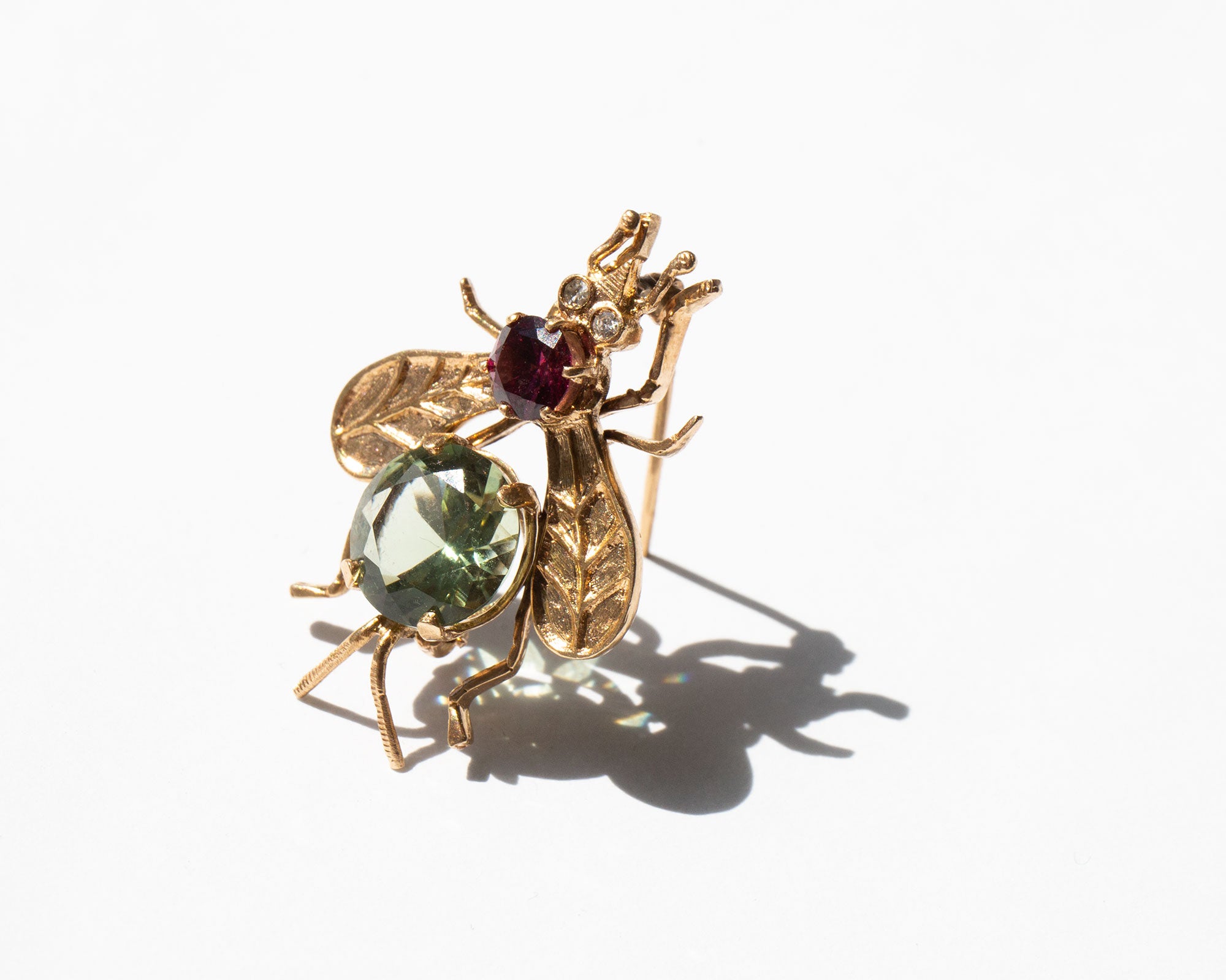 1960's fly pin of 14k gold with green beryl and tourmaline accent stones and diamond eyes. The fly is a symbol of triumph over adversity as it manages to persist in the face of much adversity.