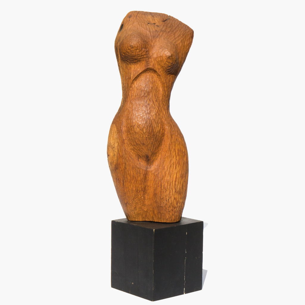 Large, handmade wooden bust on a pedestal base.