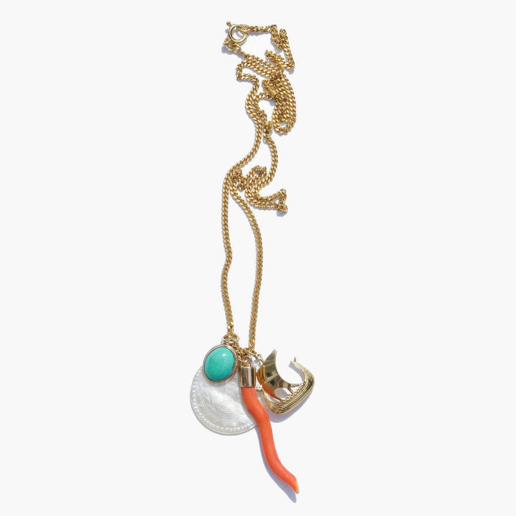 Protection for the journey of life – a cluster of antique and vintage charms paired for the spirited wanderer. Luxurious 14k gold tight link chain with a 14k gold ship, emblematic of the journey through life. The antique mother of pearl token has been added to harness the healing powers of the sea bringing relaxation, calm, and peace to the wearer. Coral has traditionally been worn to ward off bad luck and provide a general aura of protection with turquoise to further that protection. One of the oldest amulets known to humankind, turquoise is said to release negativity to free the mind for other, more productive pursuits.