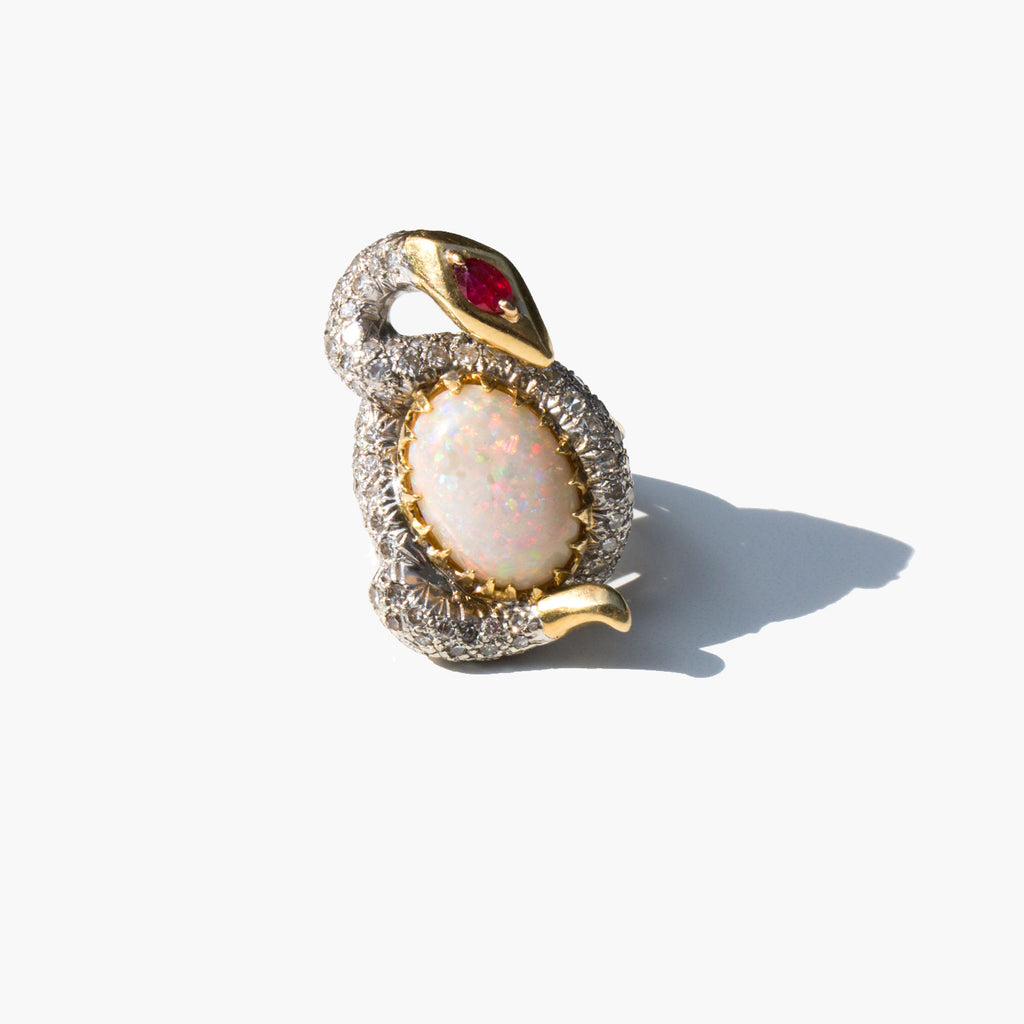 A one-of-a-kind custom made stunner – 14k and 18k mixed gold snake ring crusted with 1 1/4 cts of diamonds, an extraordinary, large, and spectral colored opal, and a single red ruby eye. For centuries snakes have been regarded as symbols of protection and guardianship because when threatened, they tend to stand their ground and fight rather than retreat. Many ancient sites have used symbols of snakes at their entryways as symbolic defenders and having a snake talisman is a potent reminder of strength and courage in the face of fear and adversity.