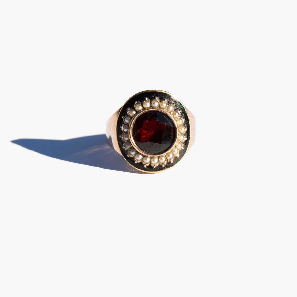 More than two hundred year old antique 14k peach gold memorial ring with natural pearls, black enamel, and foiled garnet. The ring is English in origin and inscribed "Elizabeth Franks, August 14, 1798 at 59."