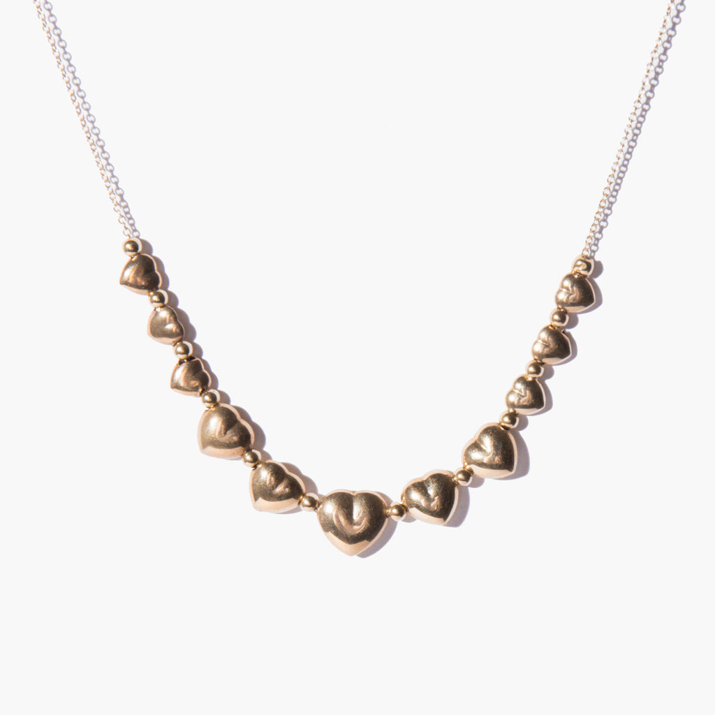 Graceful 14k gold chain with an array of 14k gold hearts that slide.