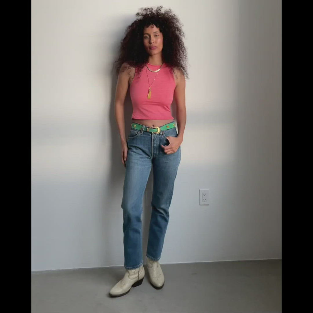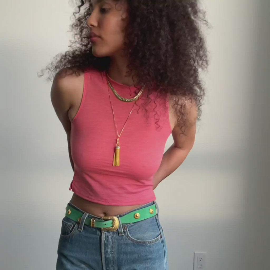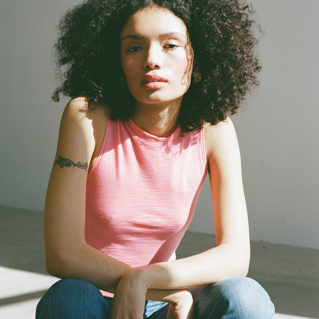 A classic sleeveless tee with a high neckline and slim, cropped silhouette. A limited edition for summer, The Muscle Tee in coral is made in a soft cotton blend with a subtle heathered effect. **THIS ITEM IS FINAL SALE.