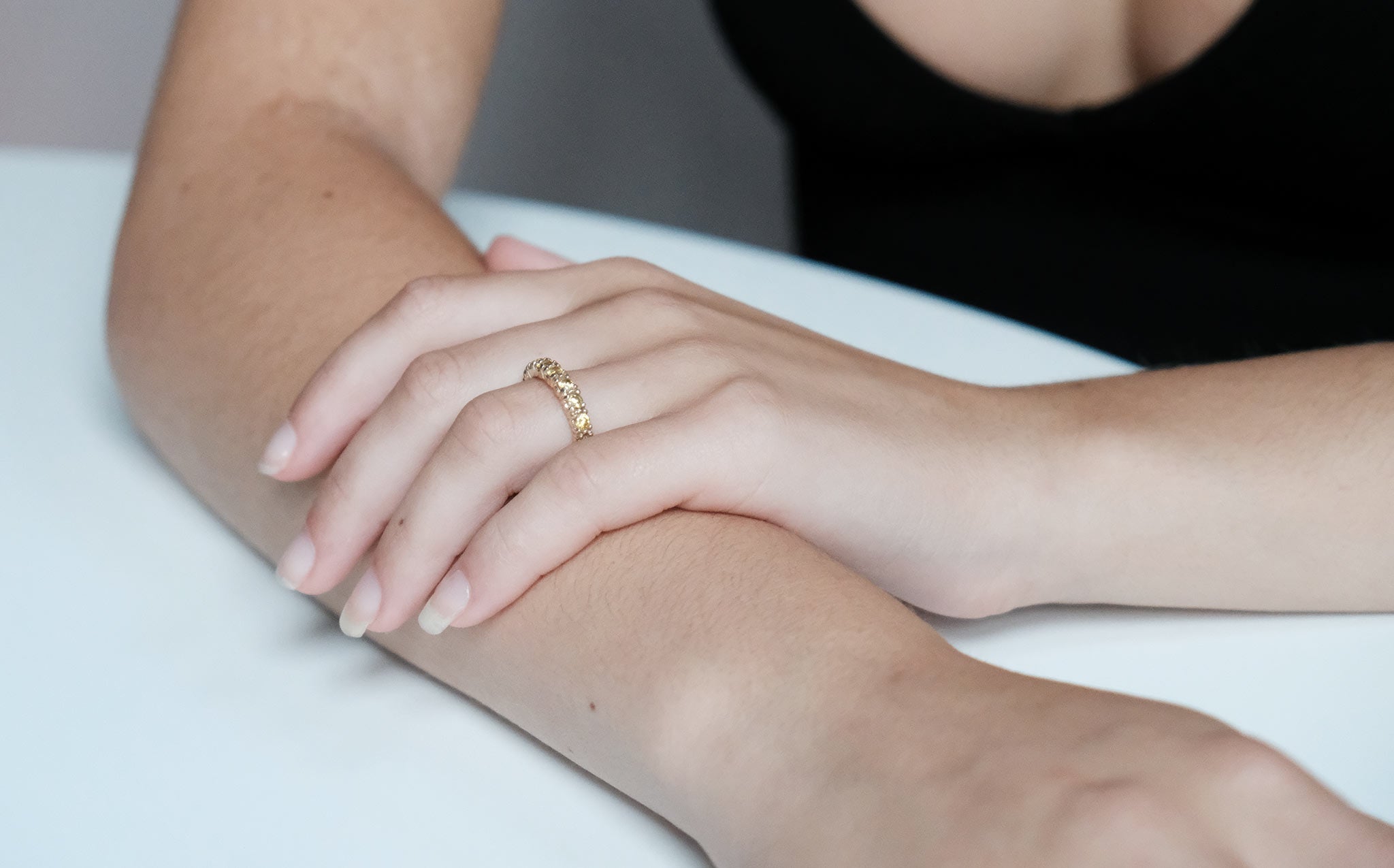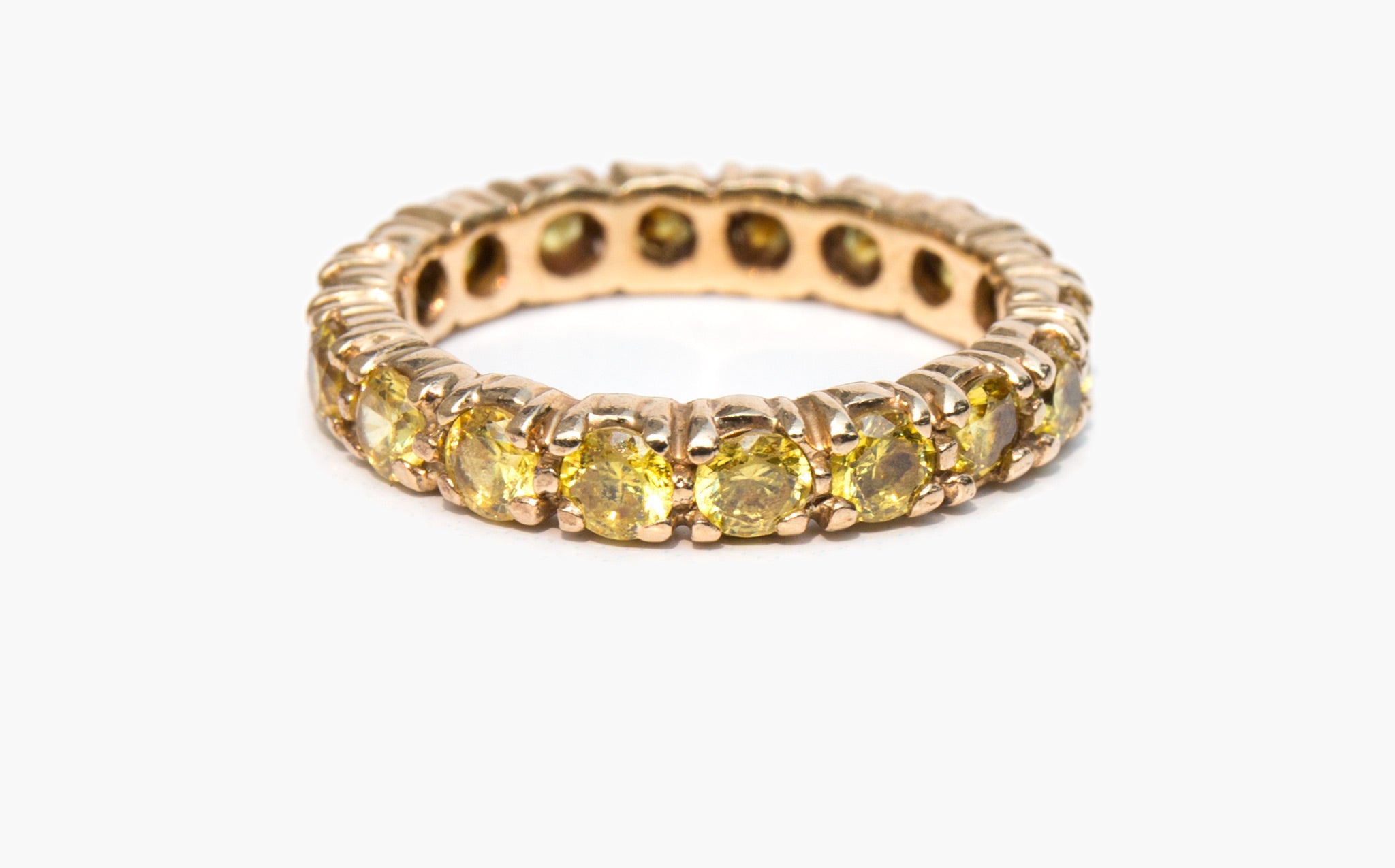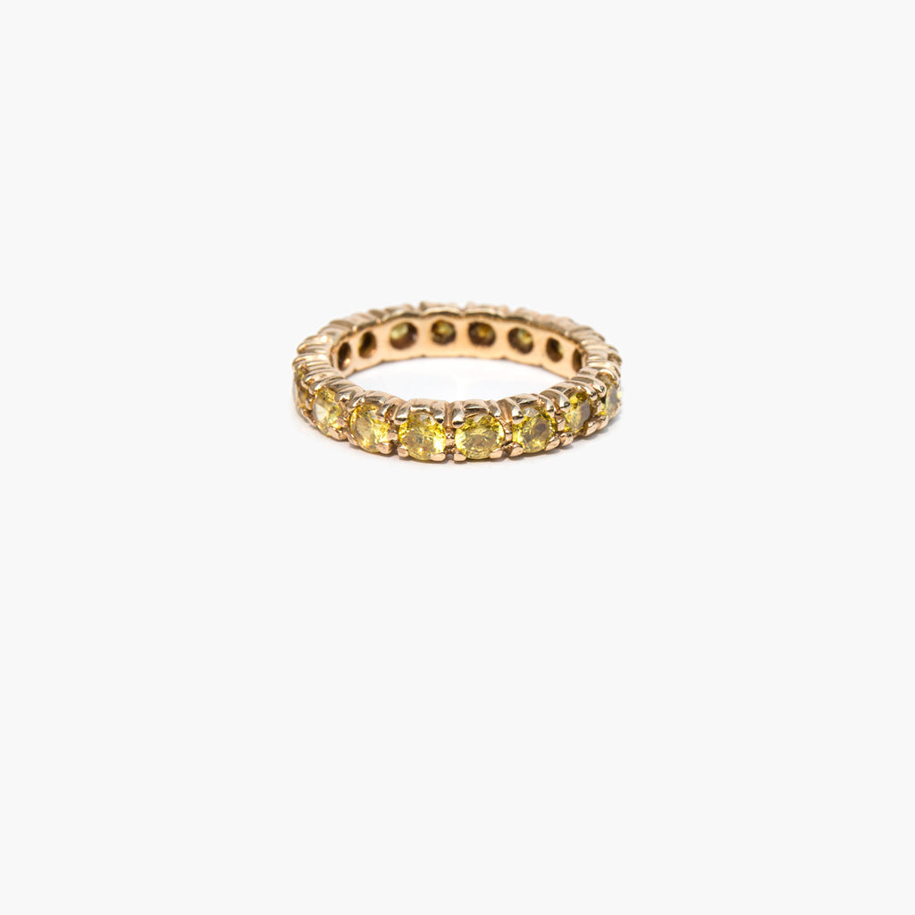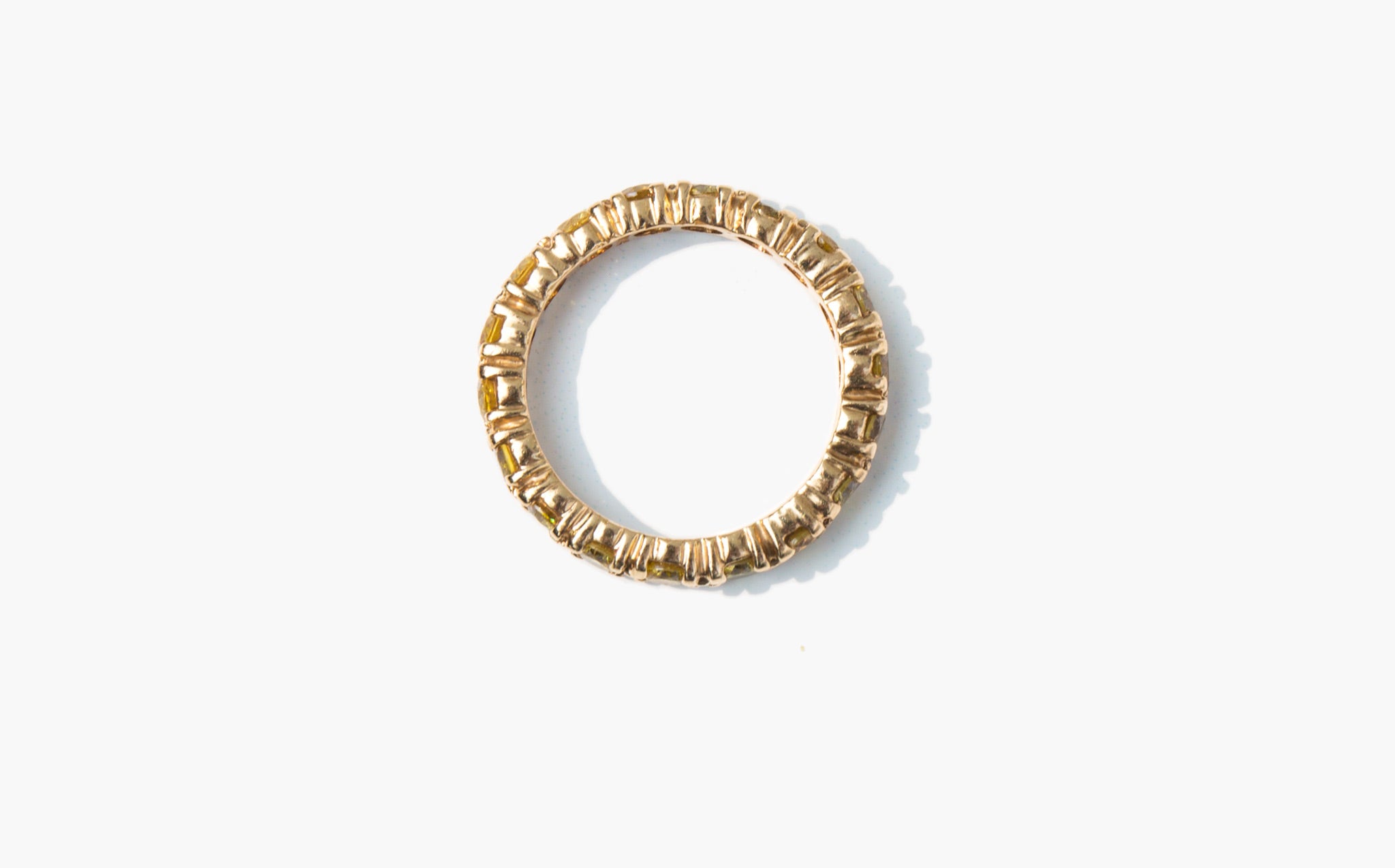 A magical and radiant eternity band of 14k gold and peridot – a stone associated with peace, tranquility, warmth, and unflagging positive energy.