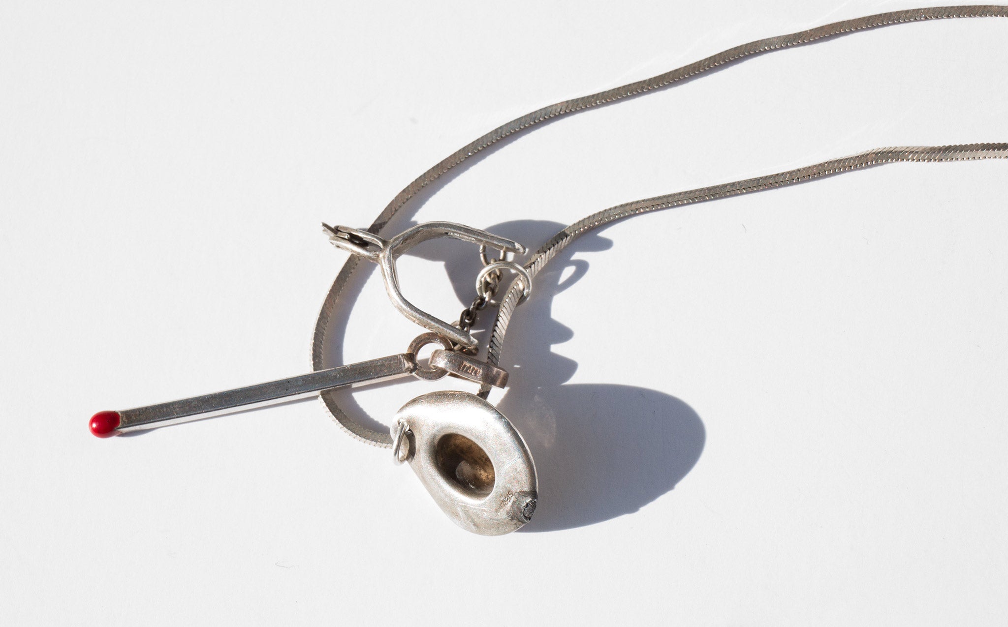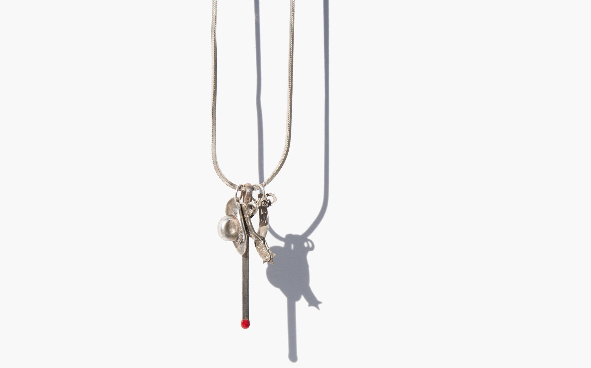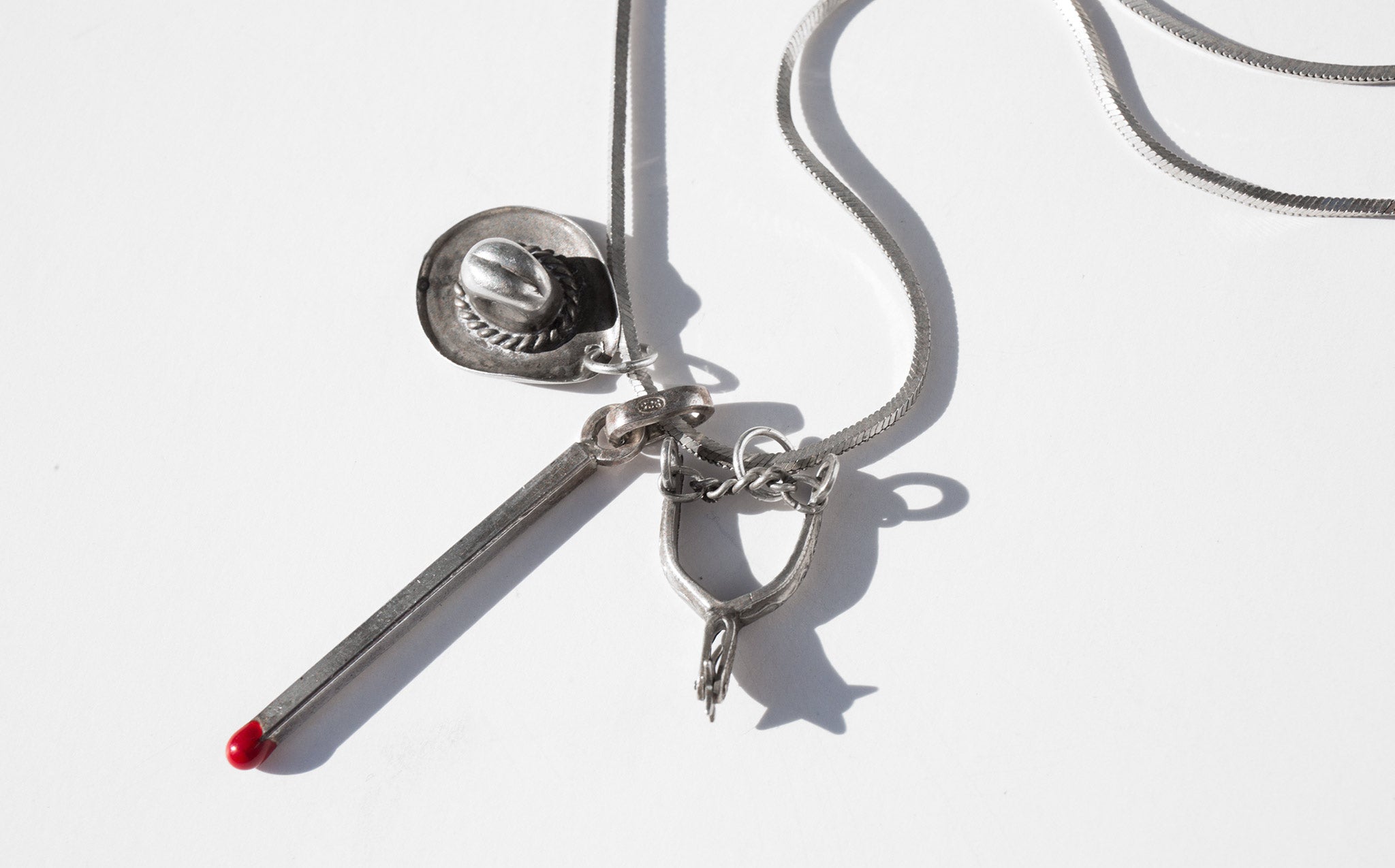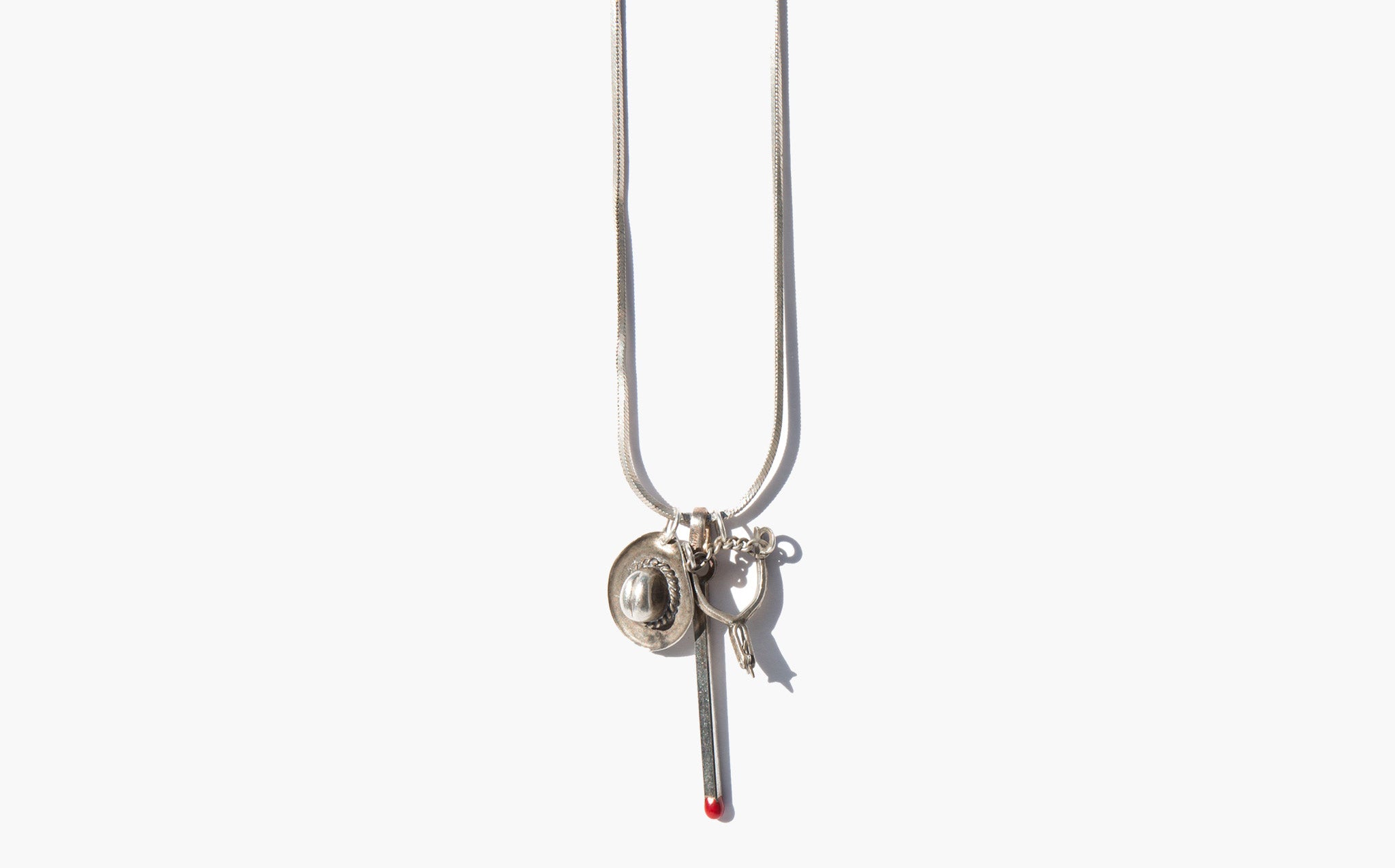 Sterling silver box chain with sterling silver cowboy hat, match, and spur charms.