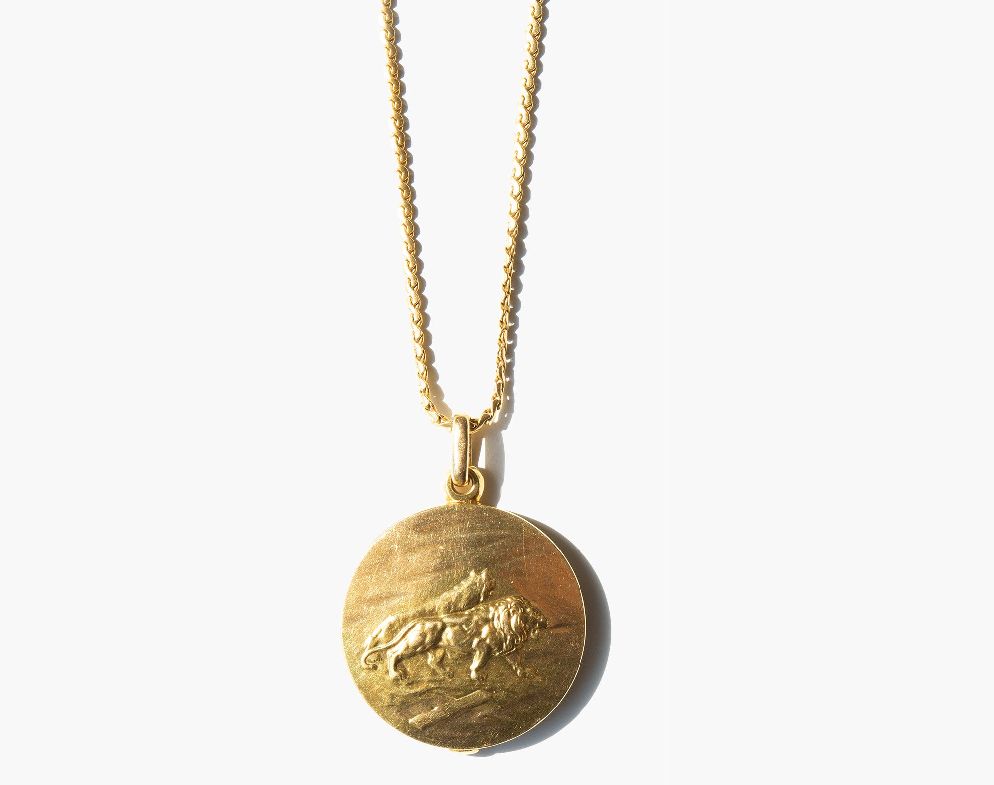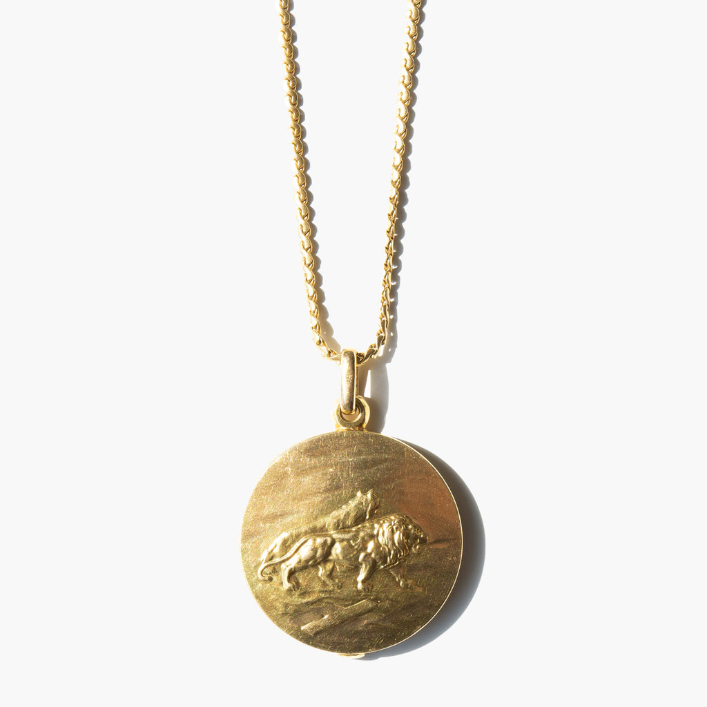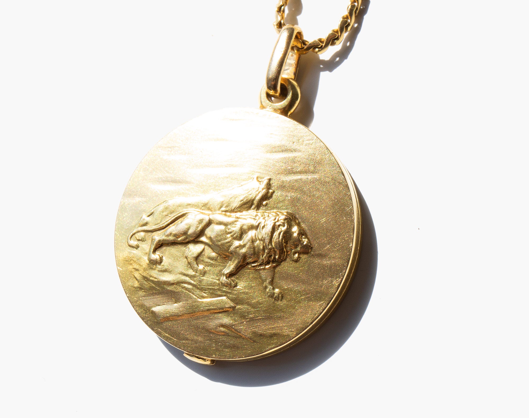 Spectacular antique French turn of the century 18k gold double lion locket on a long 18k gold S-link chain. The lion or "king of beasts" symbolizes independence, courage, and strength of character.