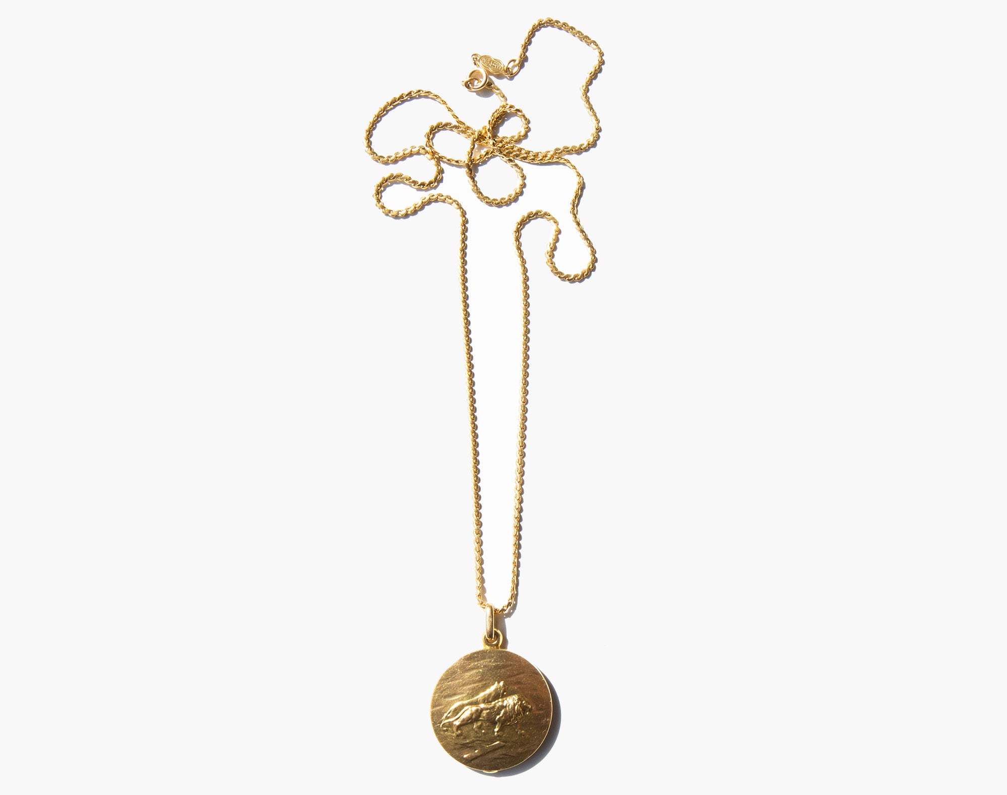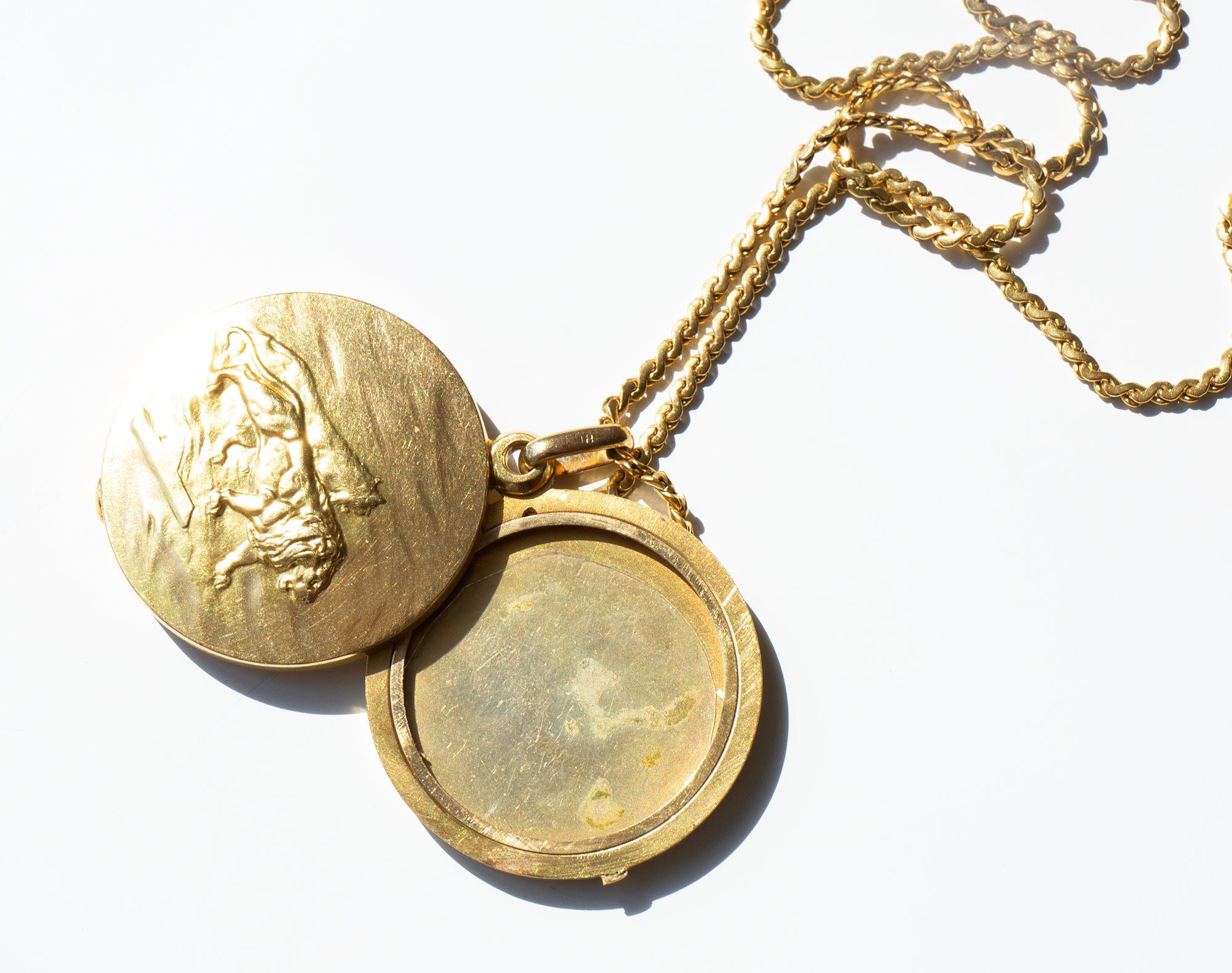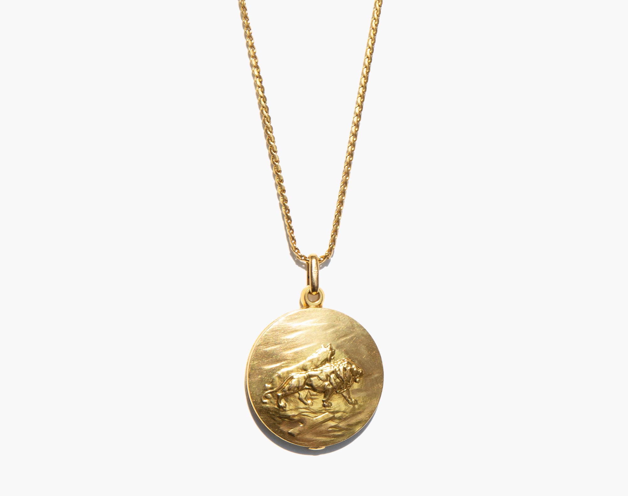 Spectacular antique French turn of the century 18k gold double lion locket on a long 18k gold S-link chain. The lion or "king of beasts" symbolizes independence, courage, and strength of character.
