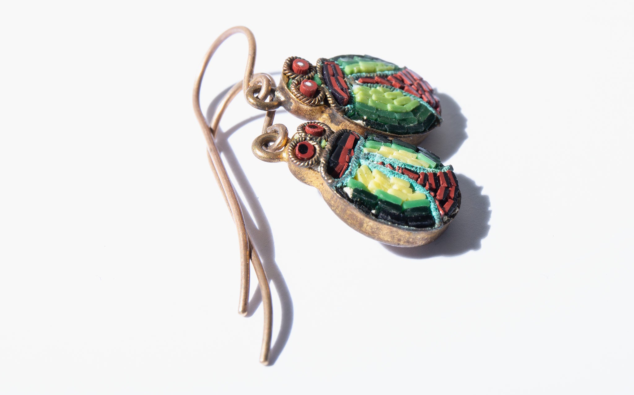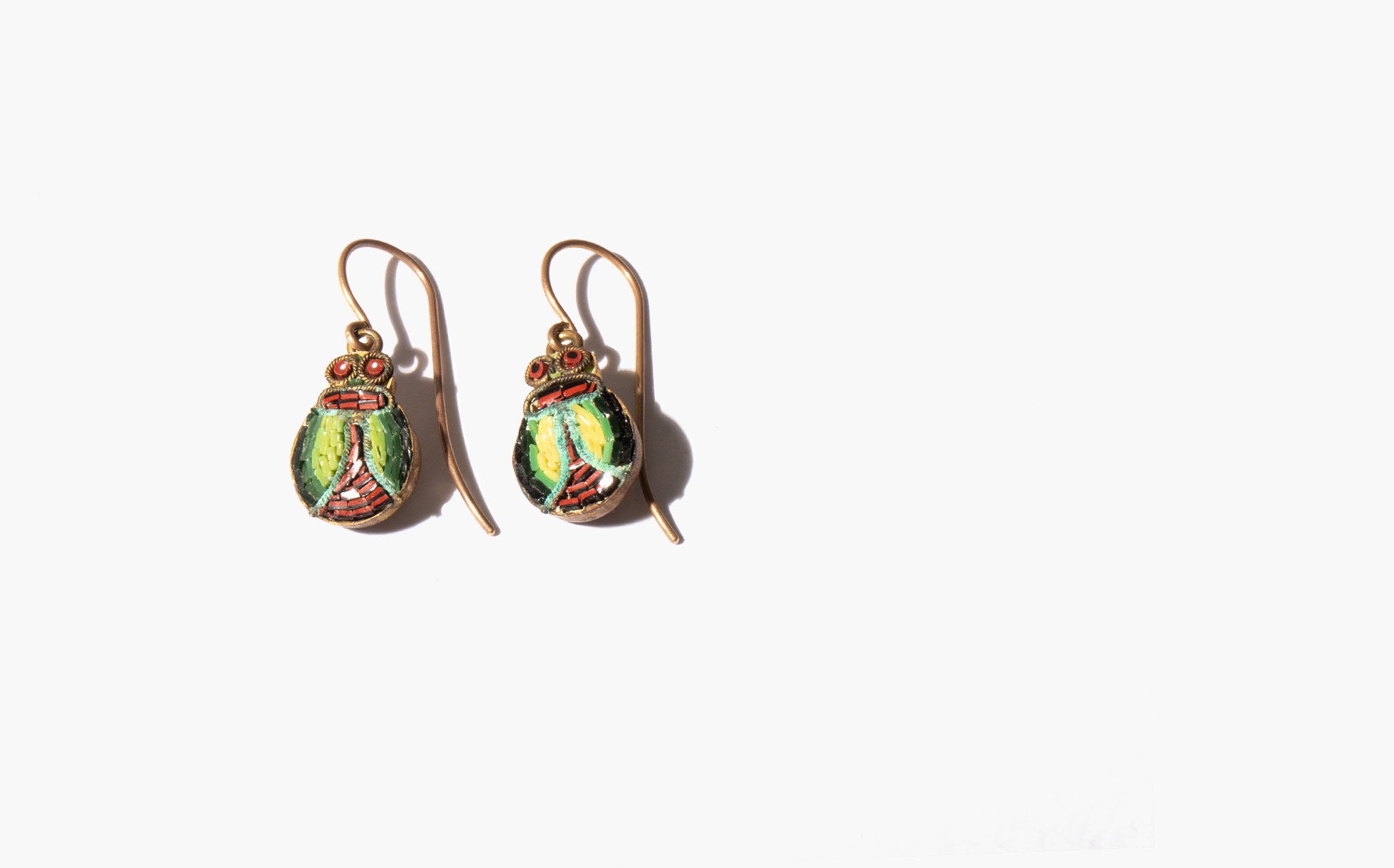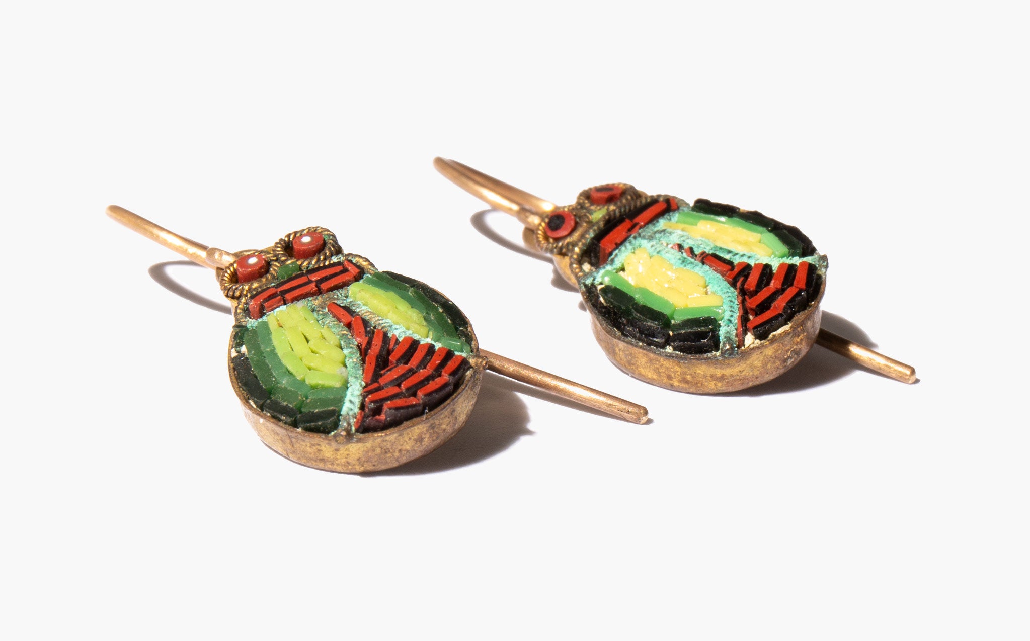The micro mosaic scarabs are antique on newer, vintage 14k gold wires.