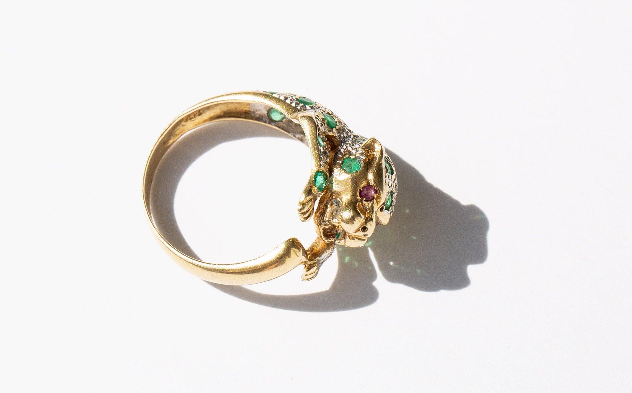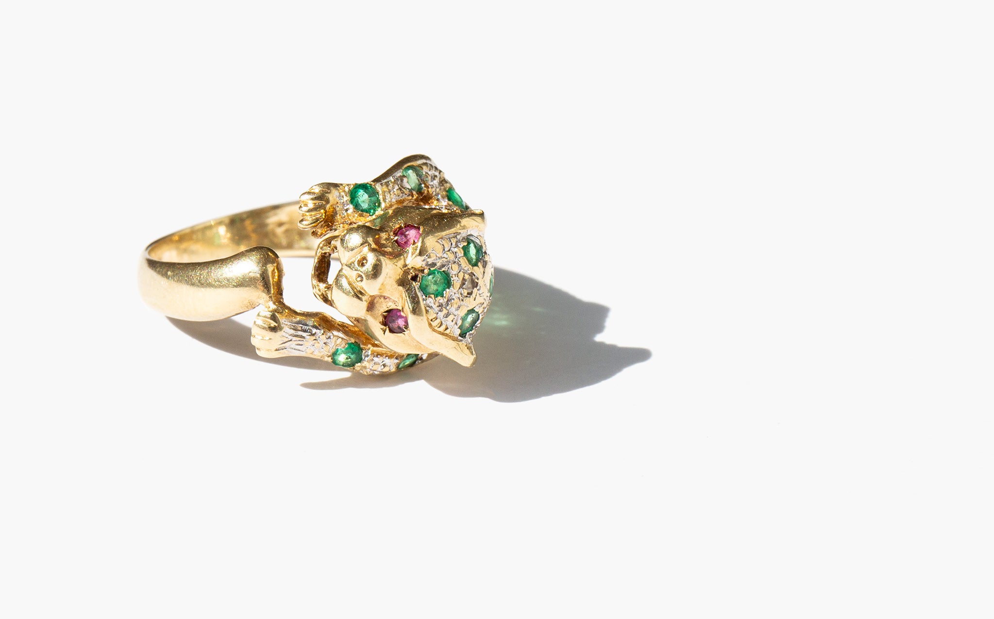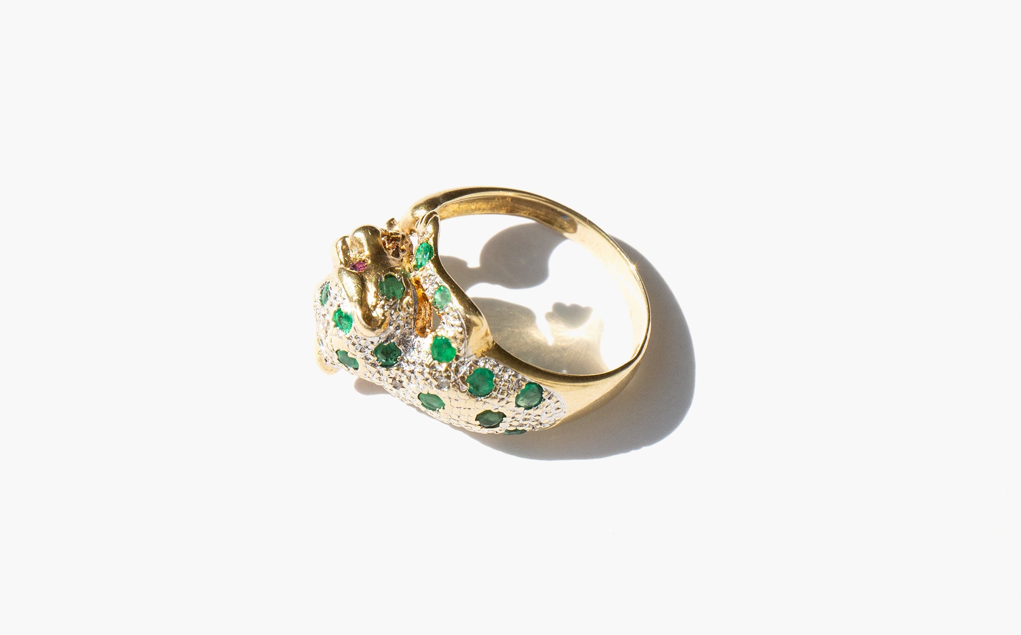 Exquisite 14k gold panther ring studded with emeralds and diamonds and two blood red ruby eyes.