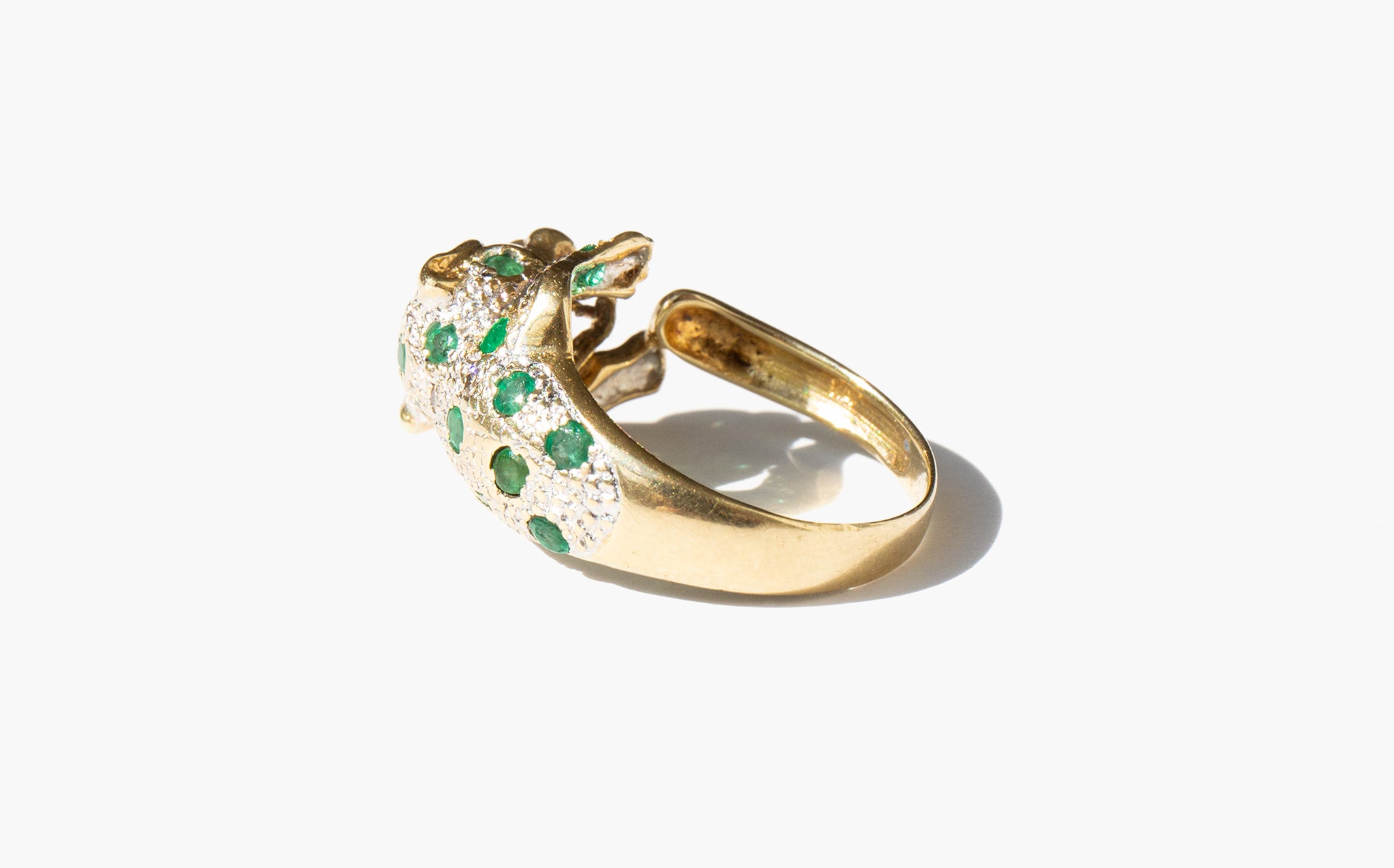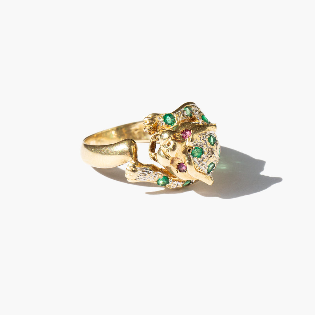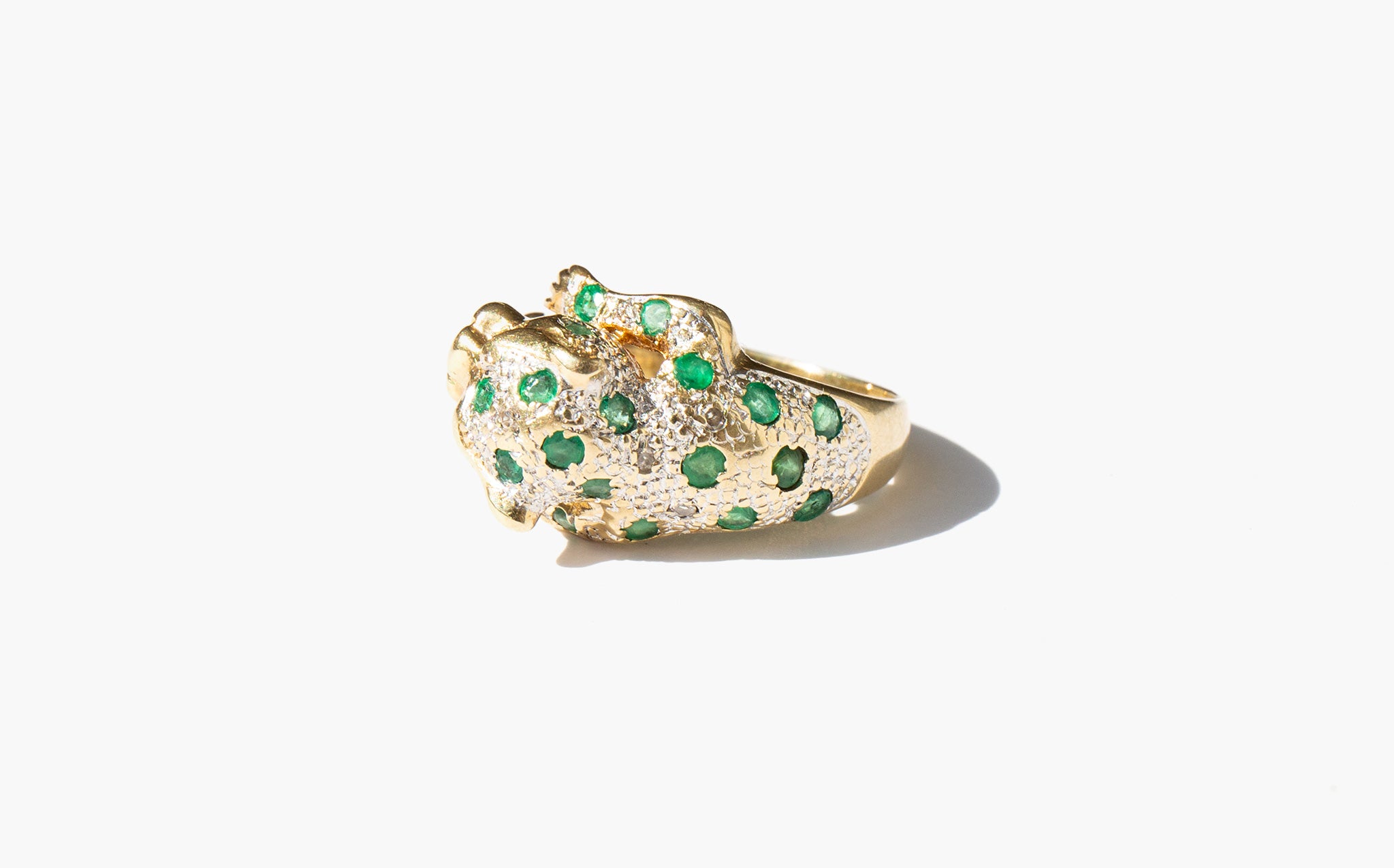Exquisite 14k gold panther ring studded with emeralds and diamonds and two blood red ruby eyes.