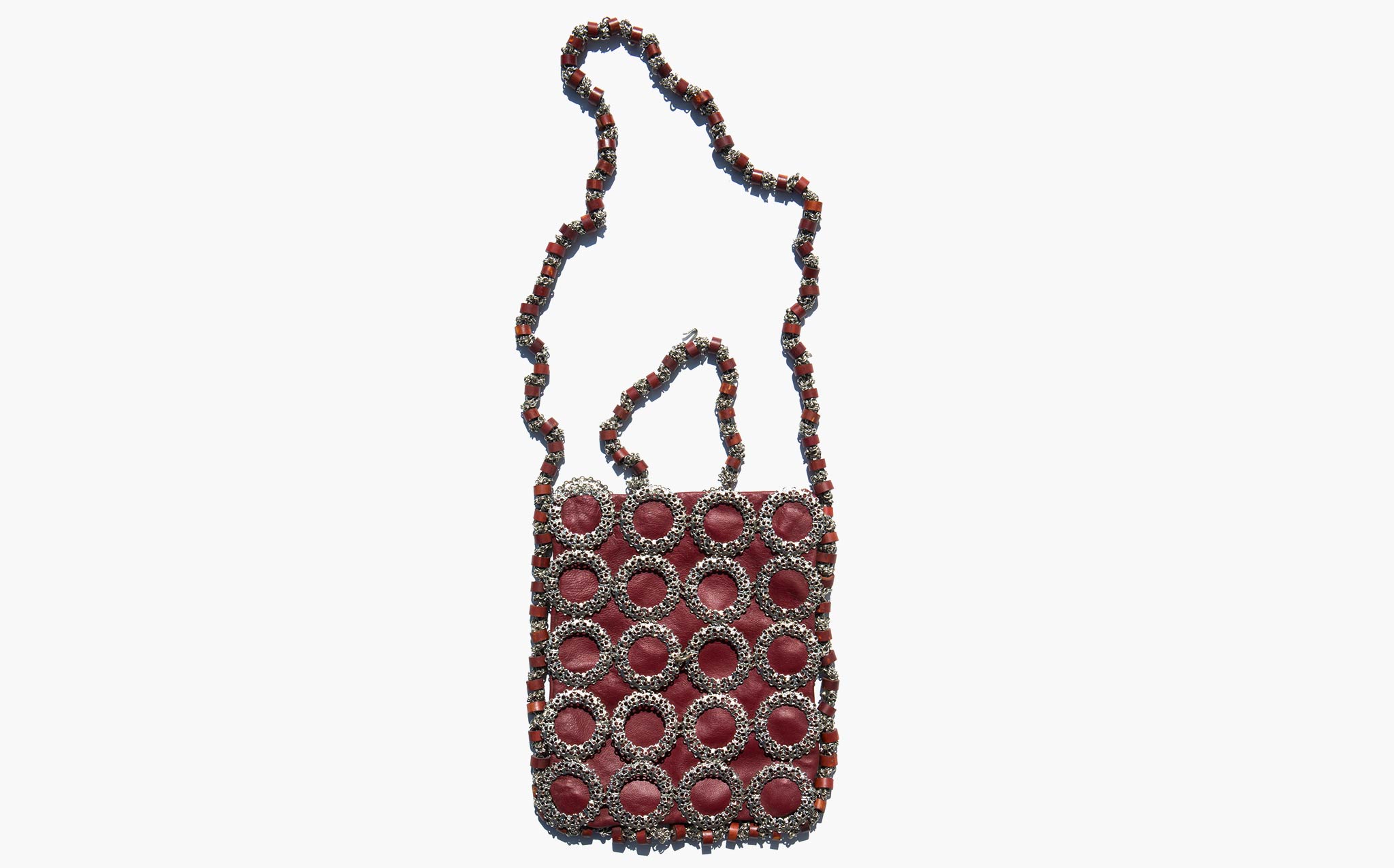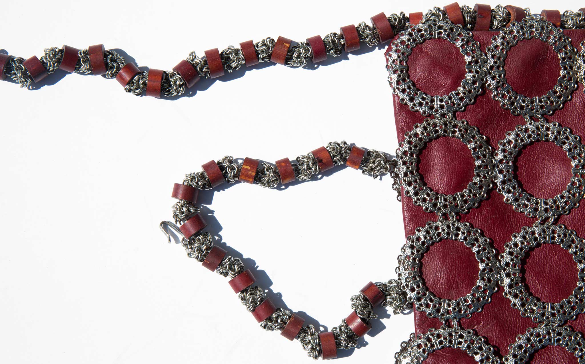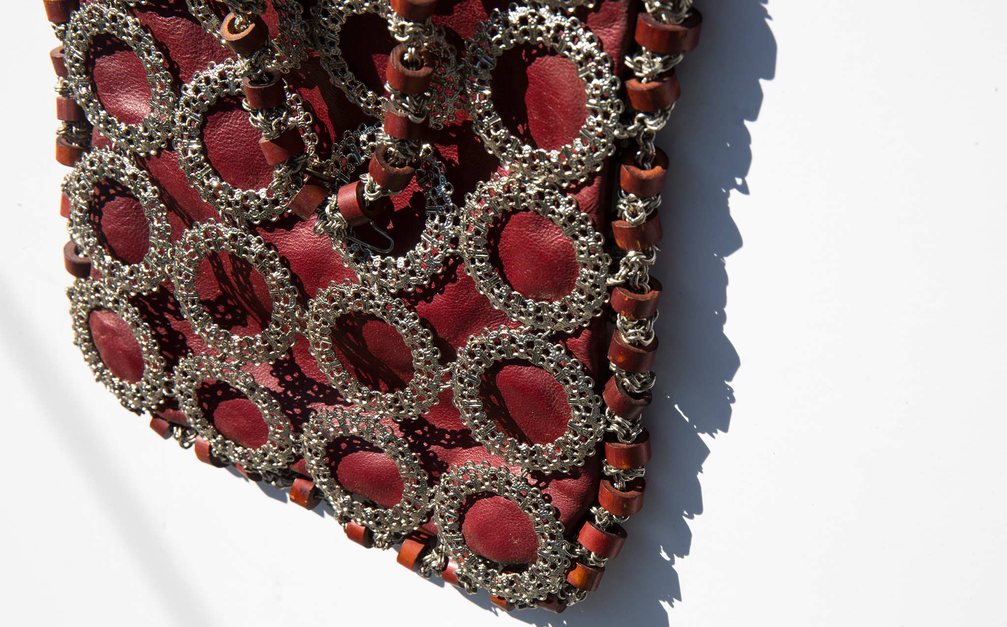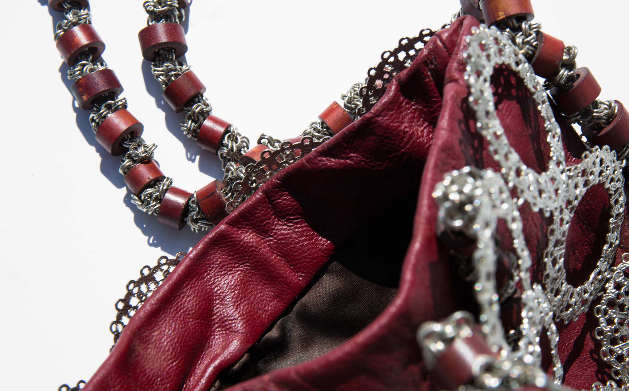 Slouchy oxblood leather tote with an intricate metal sleeve.