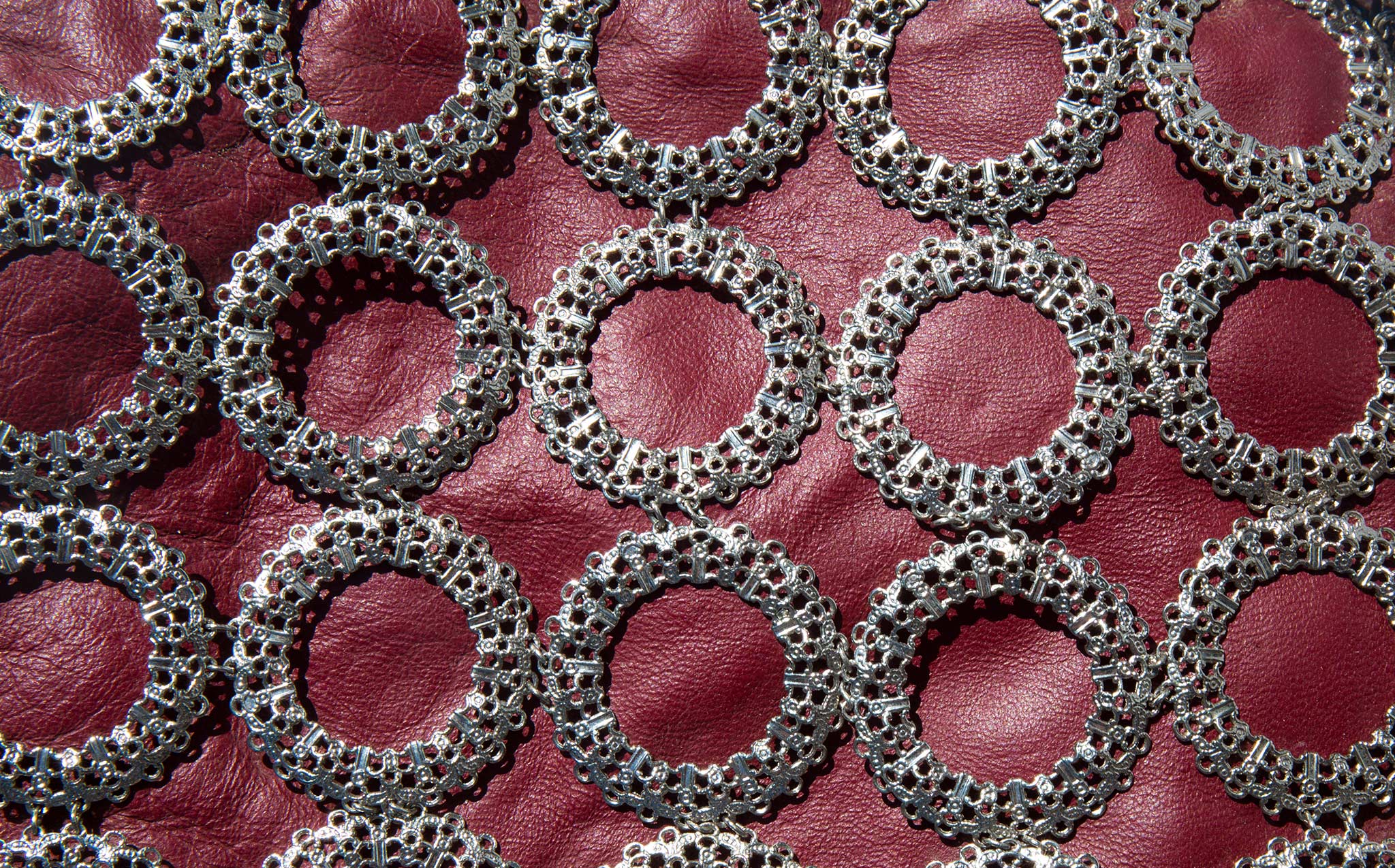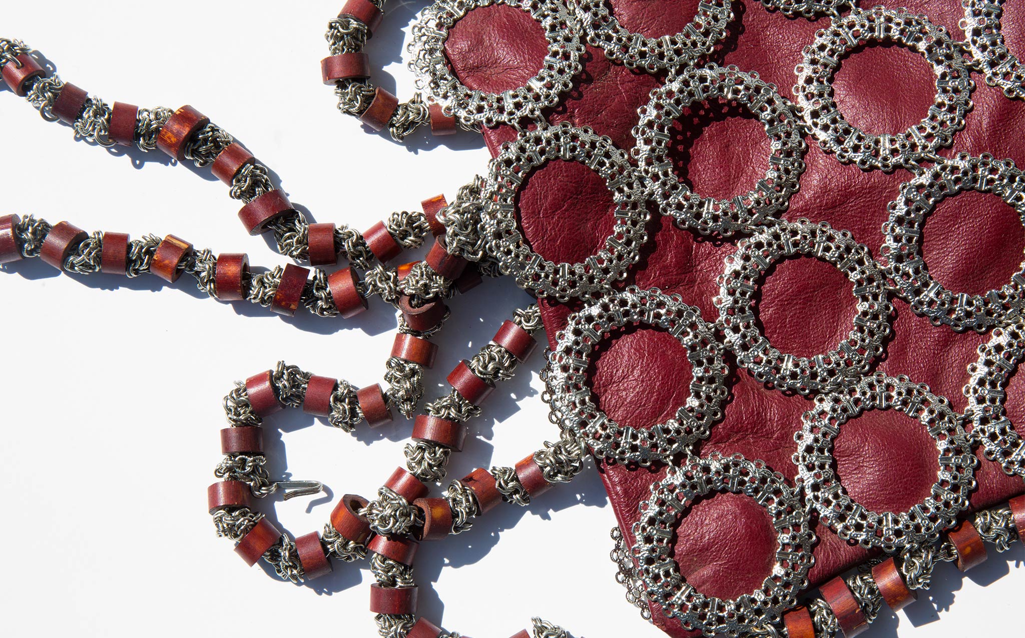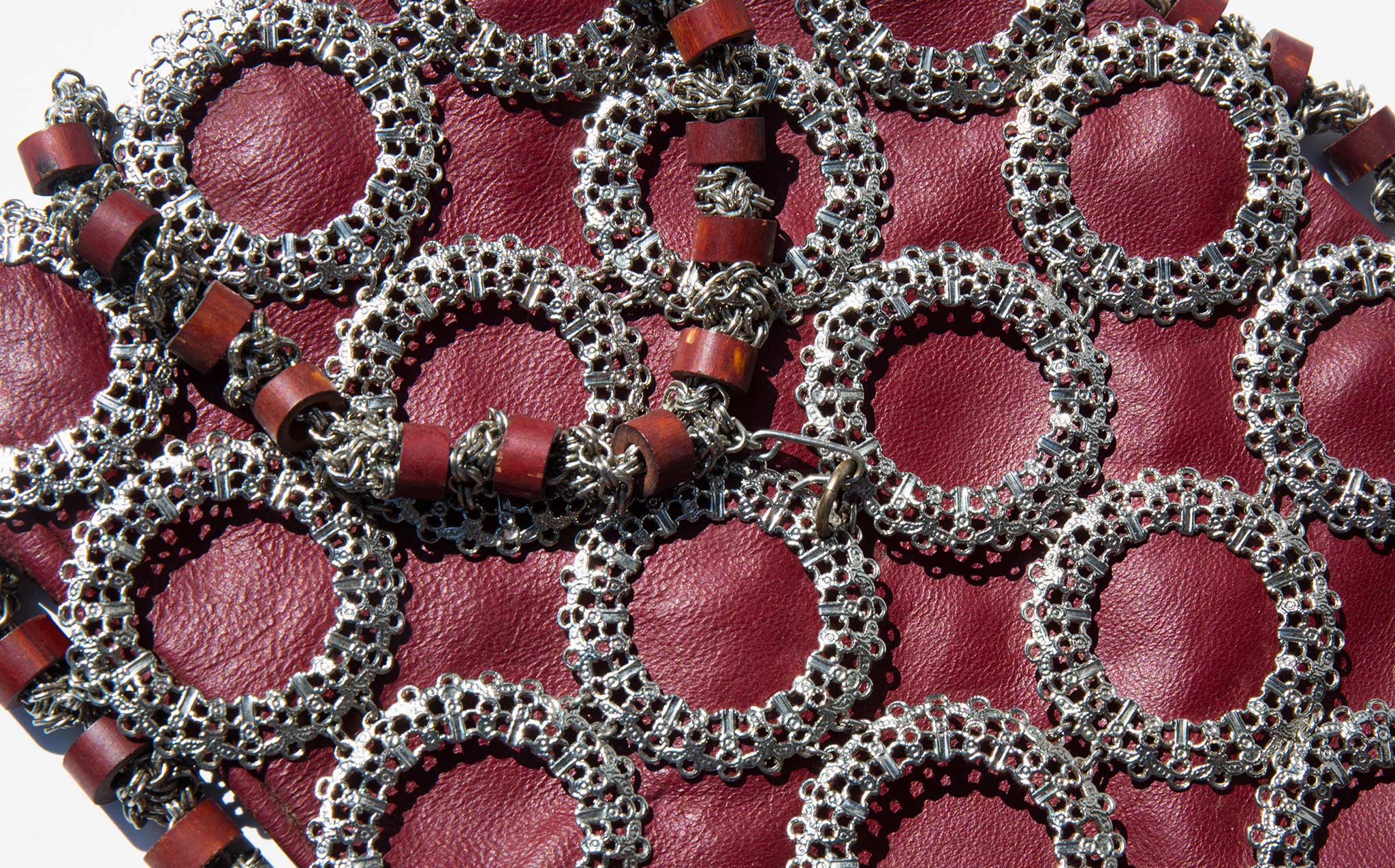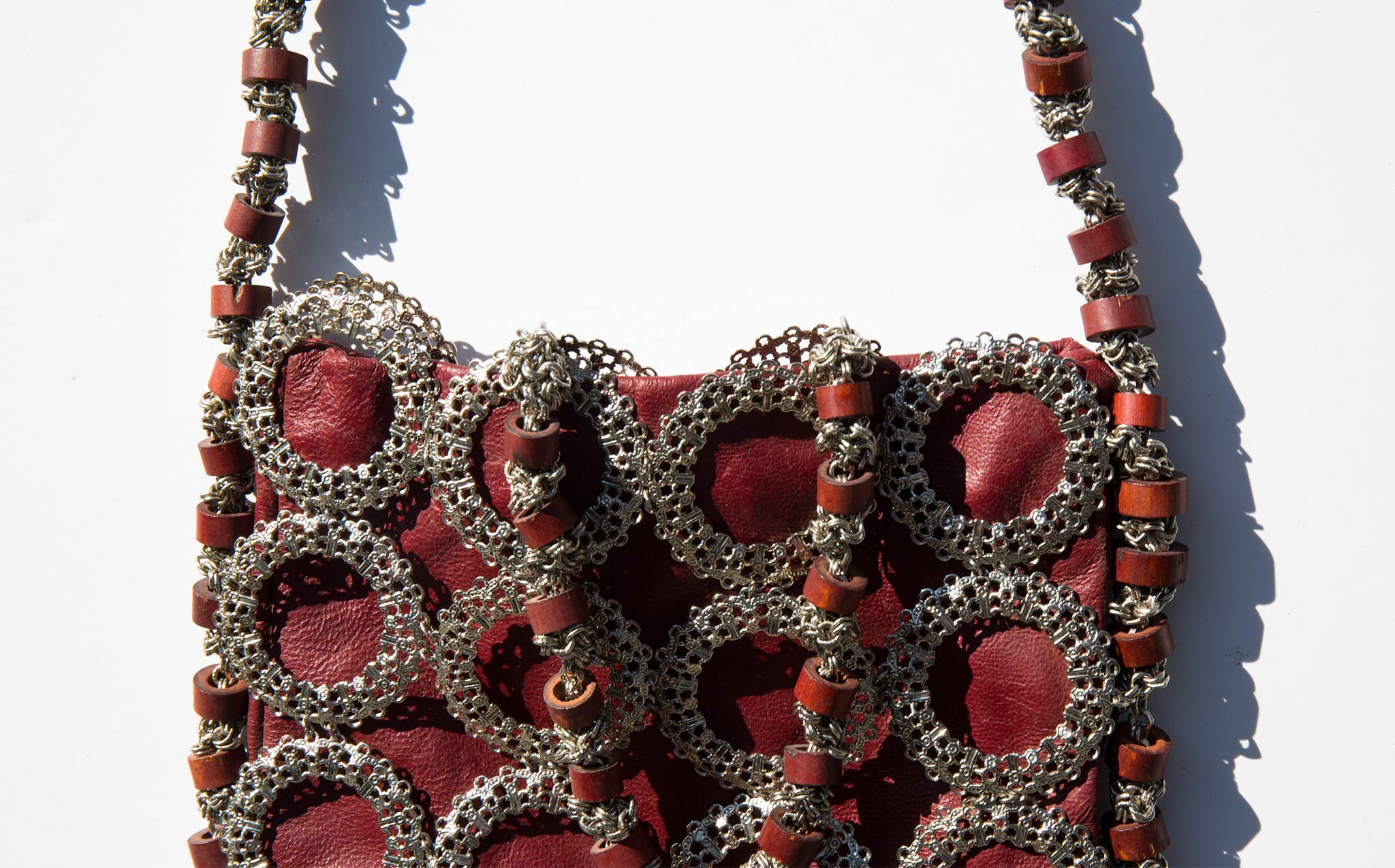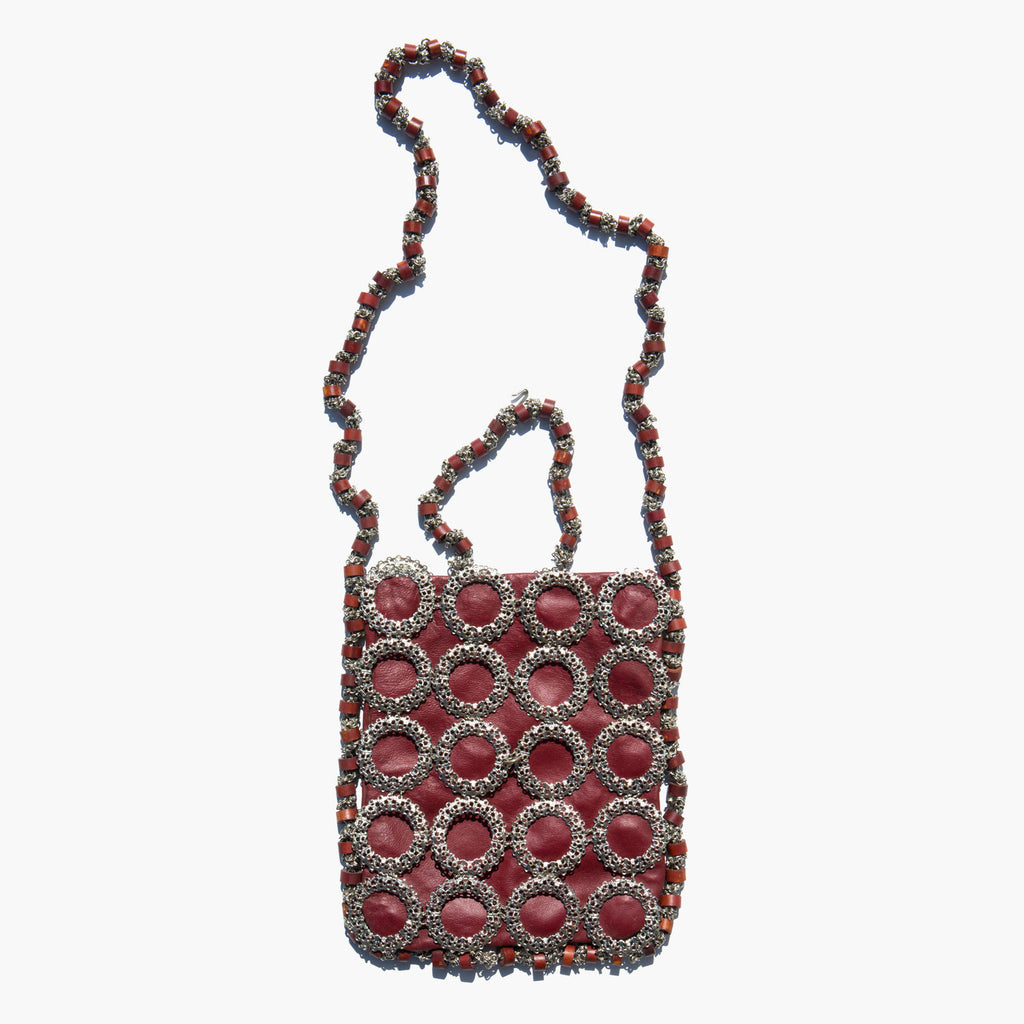 Slouchy oxblood leather tote with an intricate metal sleeve.