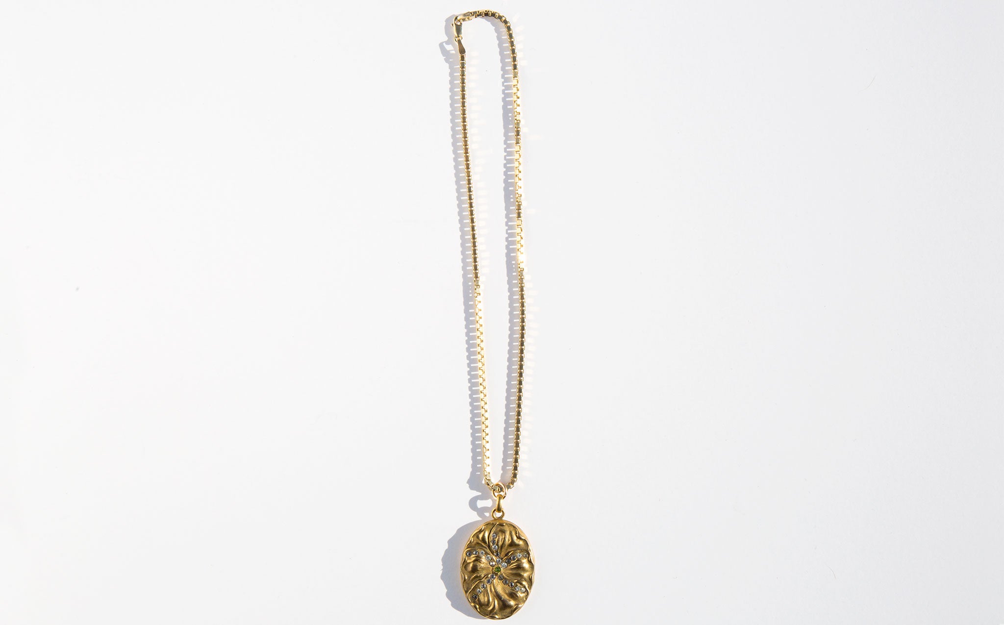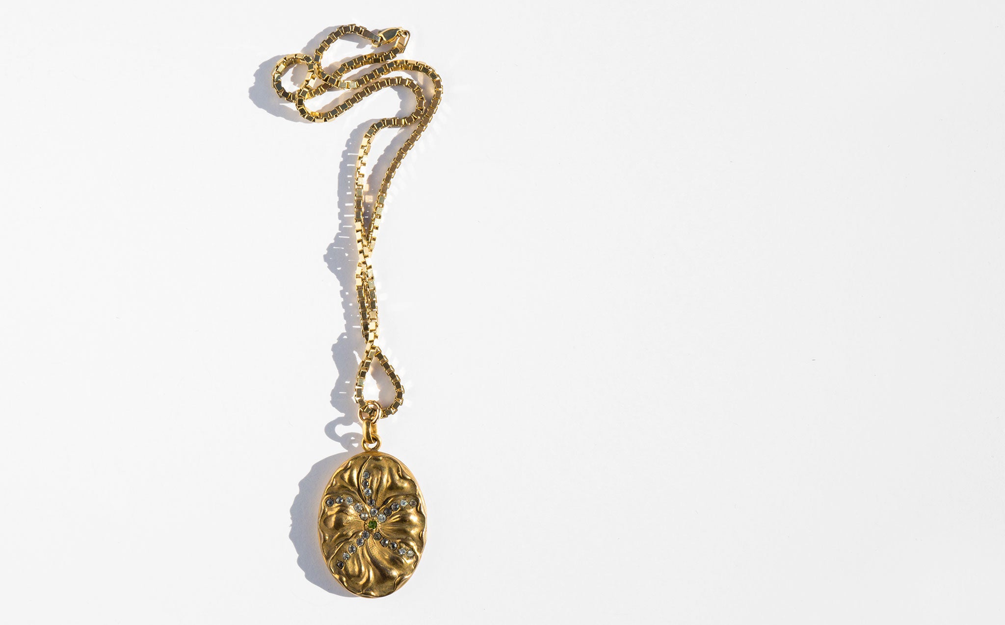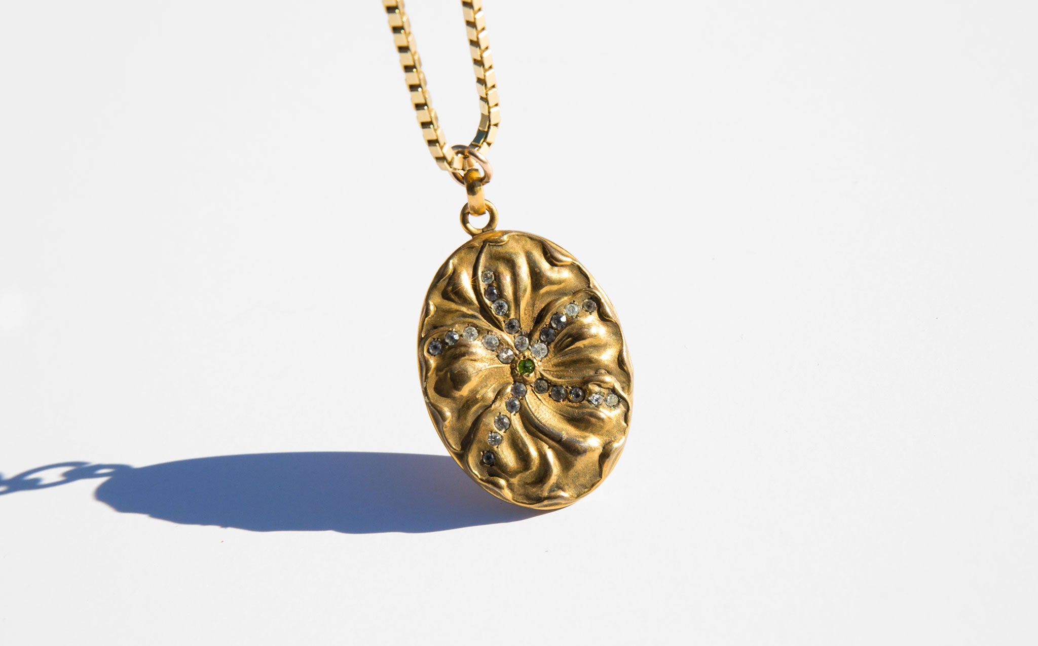 Antique gold filled pansy locket with paste diamonds, a form of imitation diamond made from cut glass popularized in the 18th century. Strung on a weighty solid 14k gold vintage box choker. During the Victorian era, when displays of affection and emotion during a courtship were frowned upon, pansies were placed into small bouquets of herbs and flowers and given by an admirer to convey feelings of love or affection.
