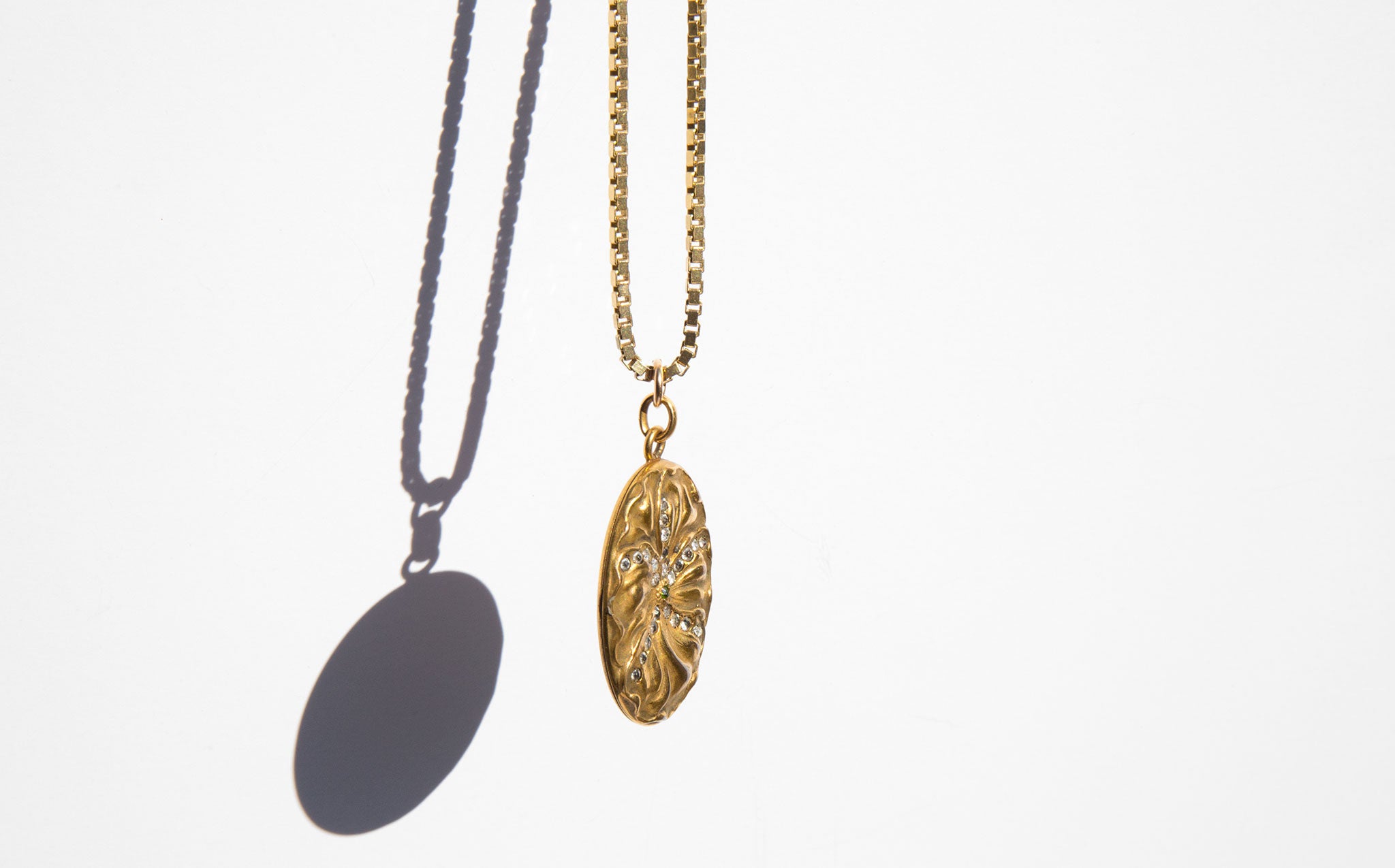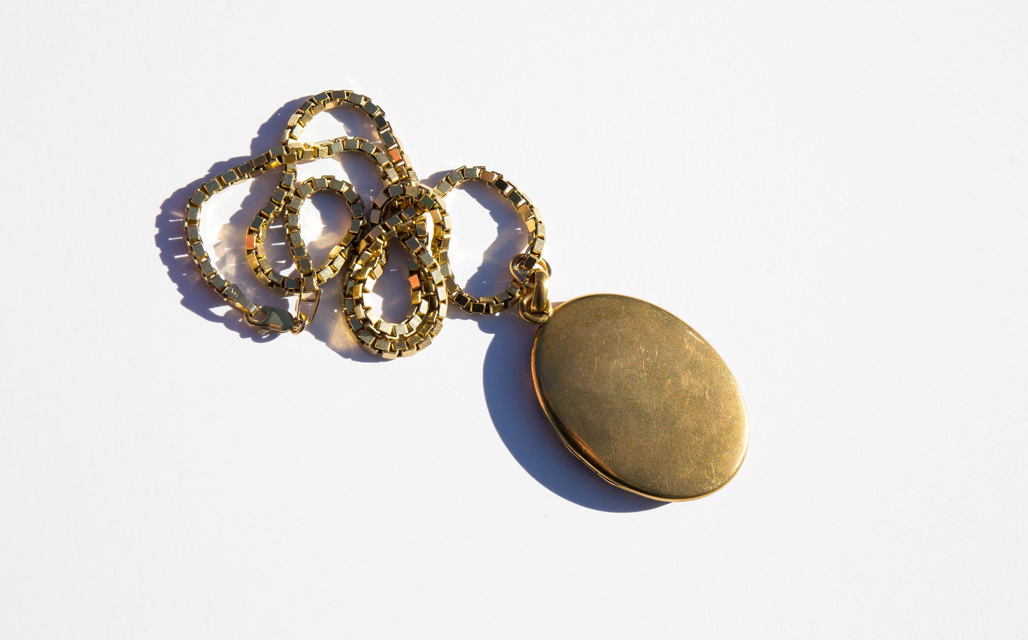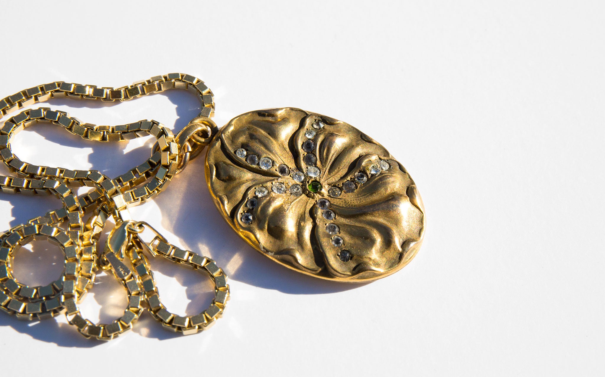 Antique gold filled pansy locket with paste diamonds, a form of imitation diamond made from cut glass popularized in the 18th century. Strung on a weighty solid 14k gold vintage box choker. During the Victorian era, when displays of affection and emotion during a courtship were frowned upon, pansies were placed into small bouquets of herbs and flowers and given by an admirer to convey feelings of love or affection.