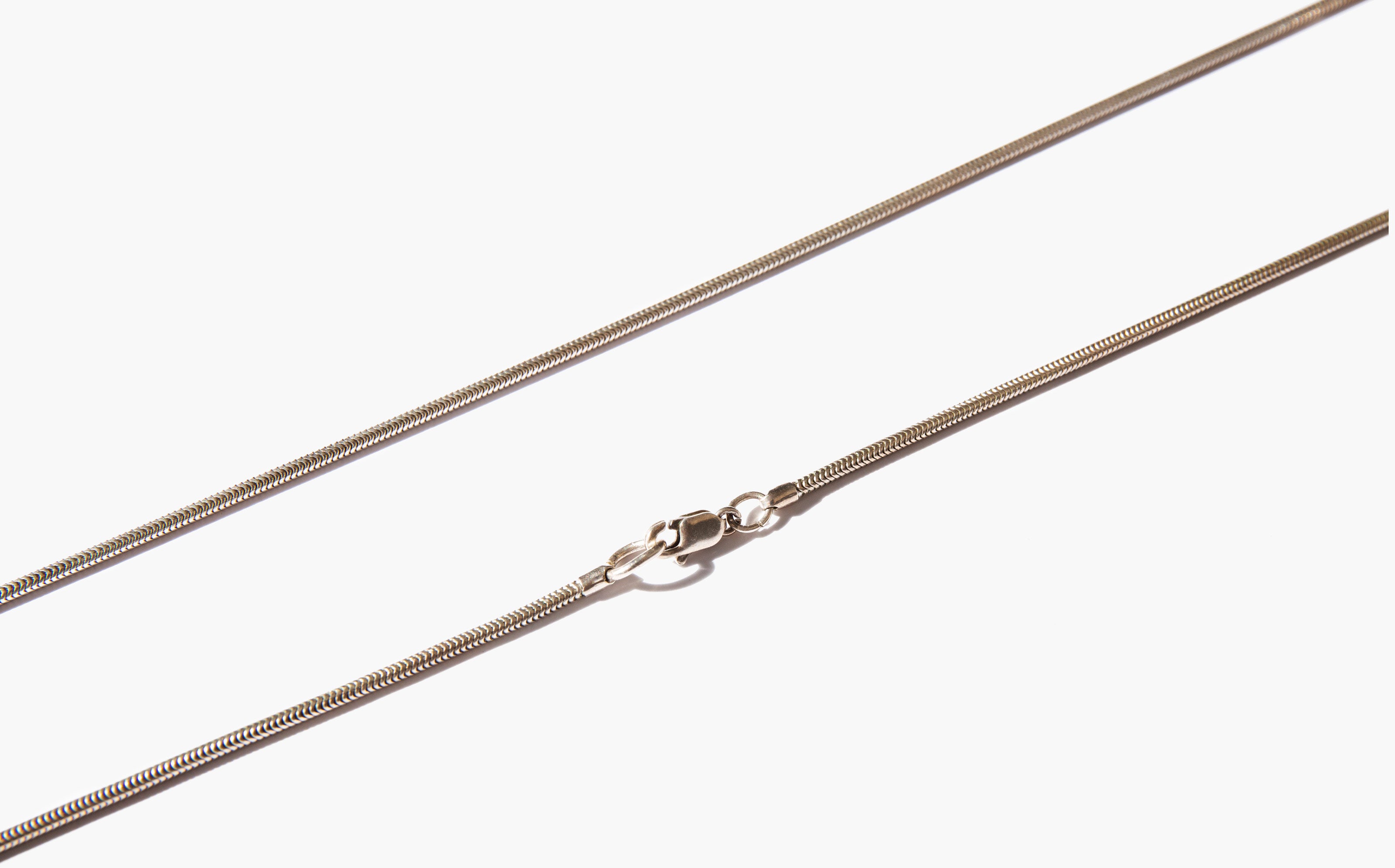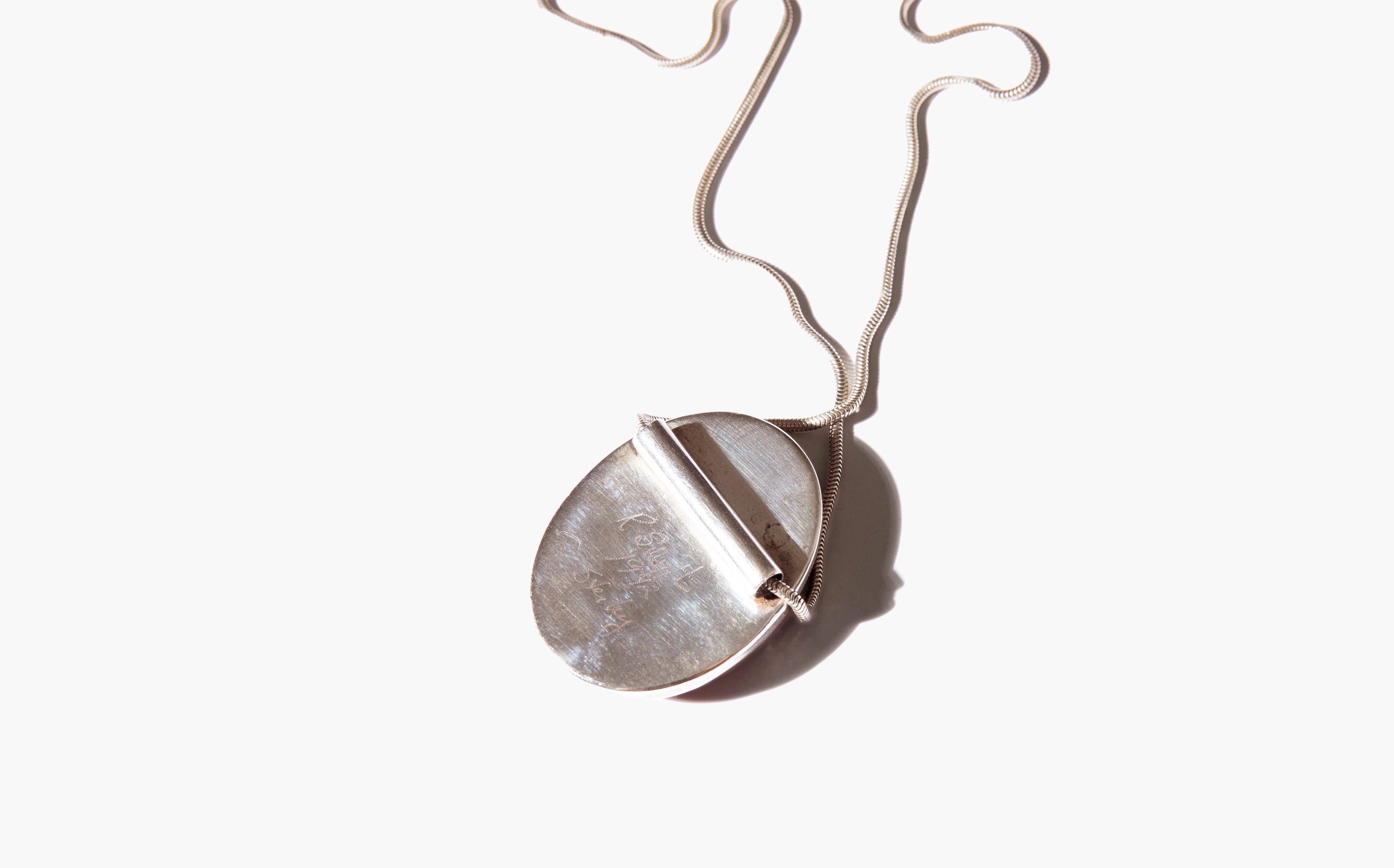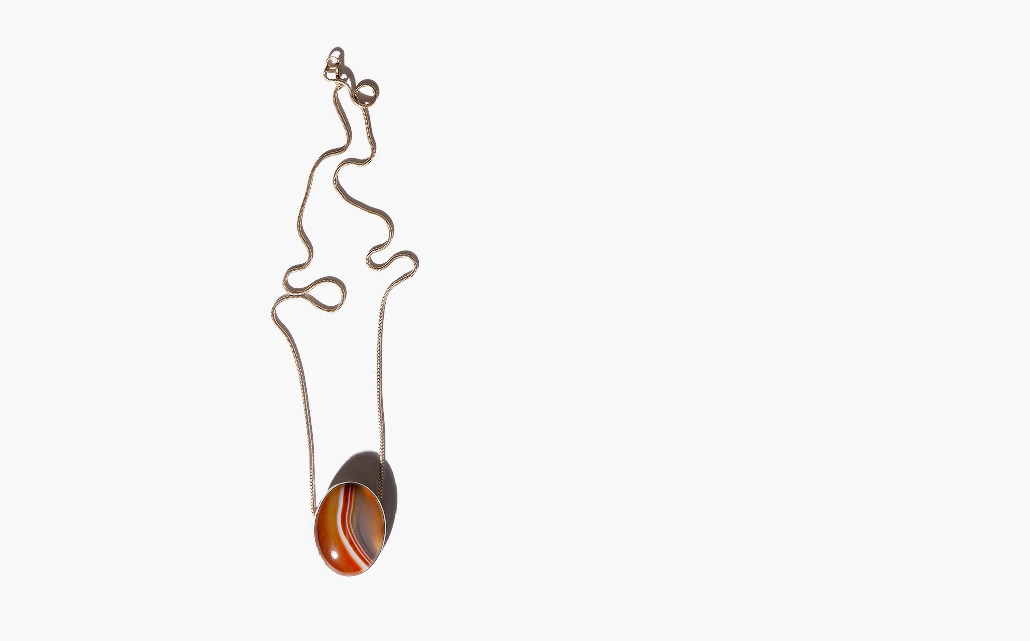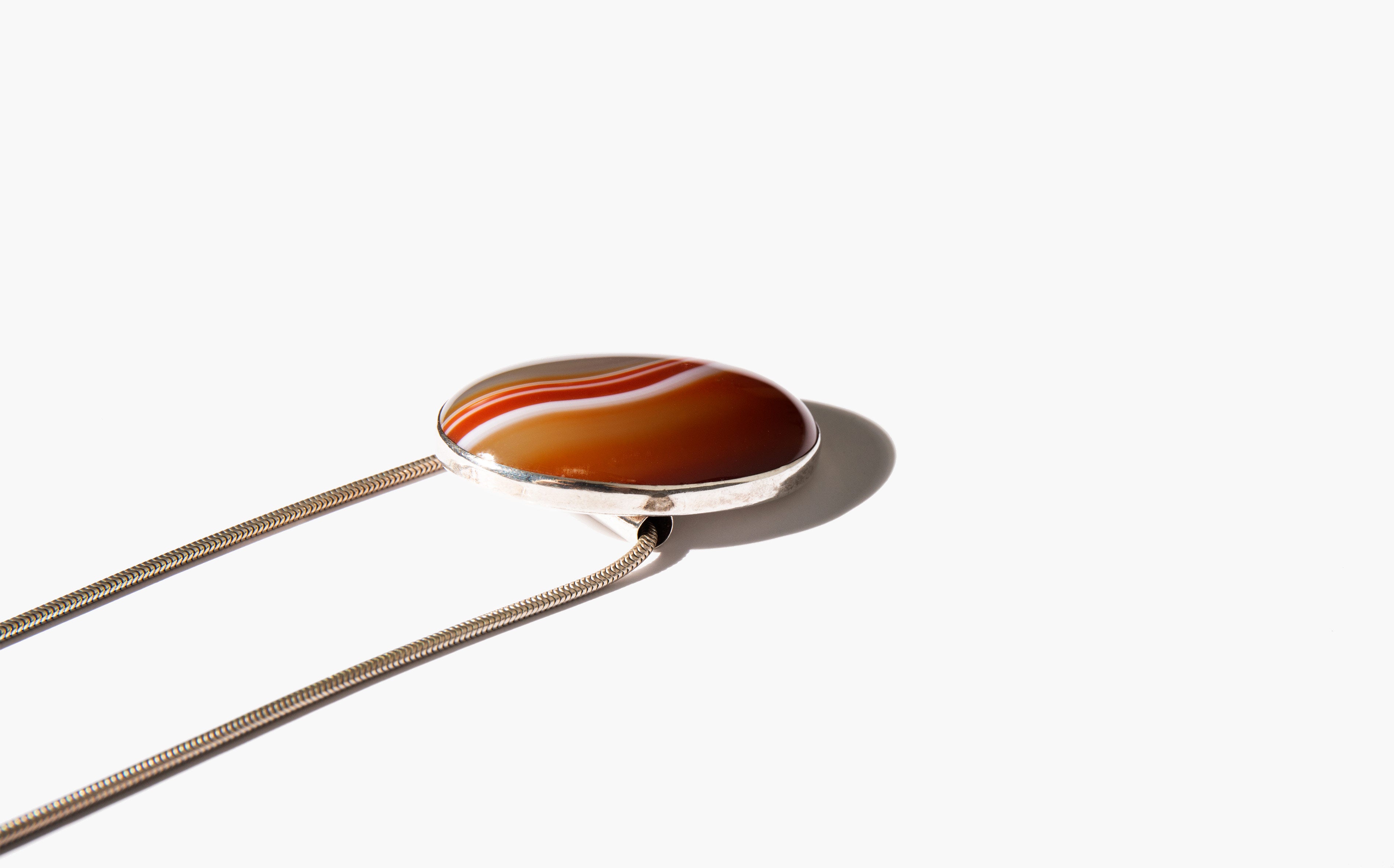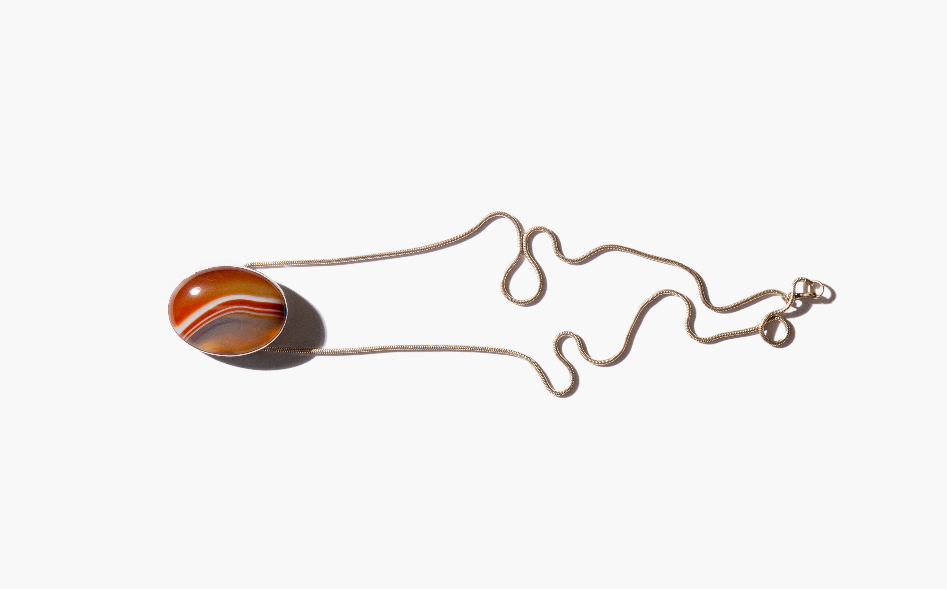 Simple sterling silver snake chain with a large earth-toned oval agate pendant set in sterling silver. Pendant is signed on the back.