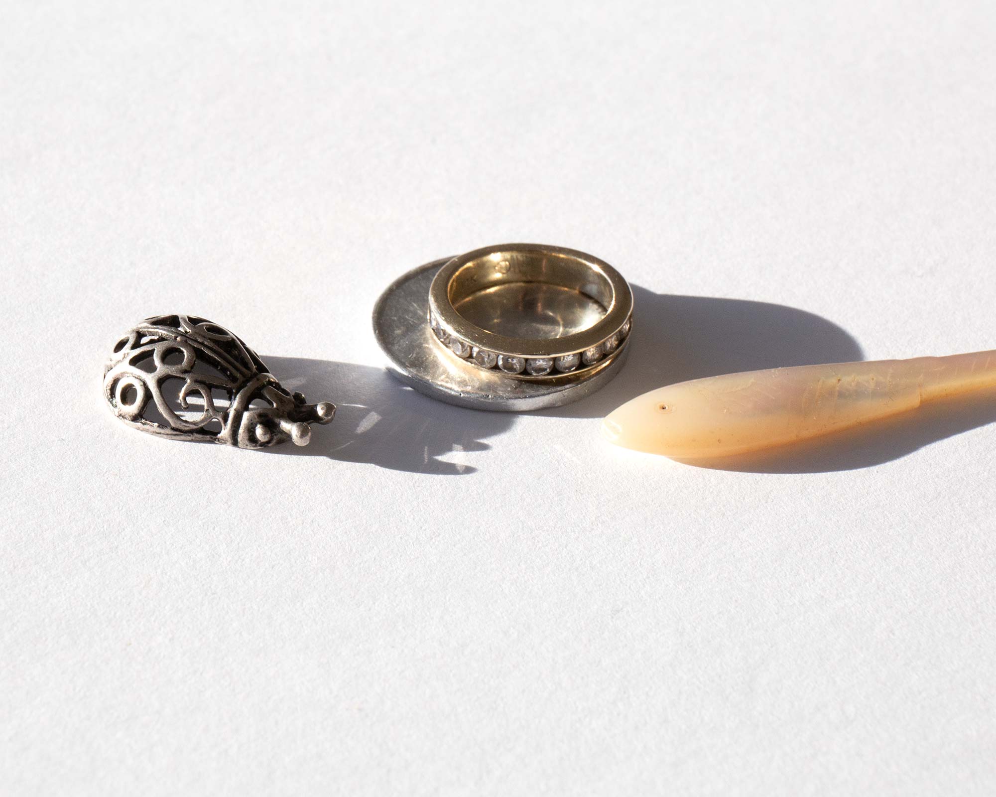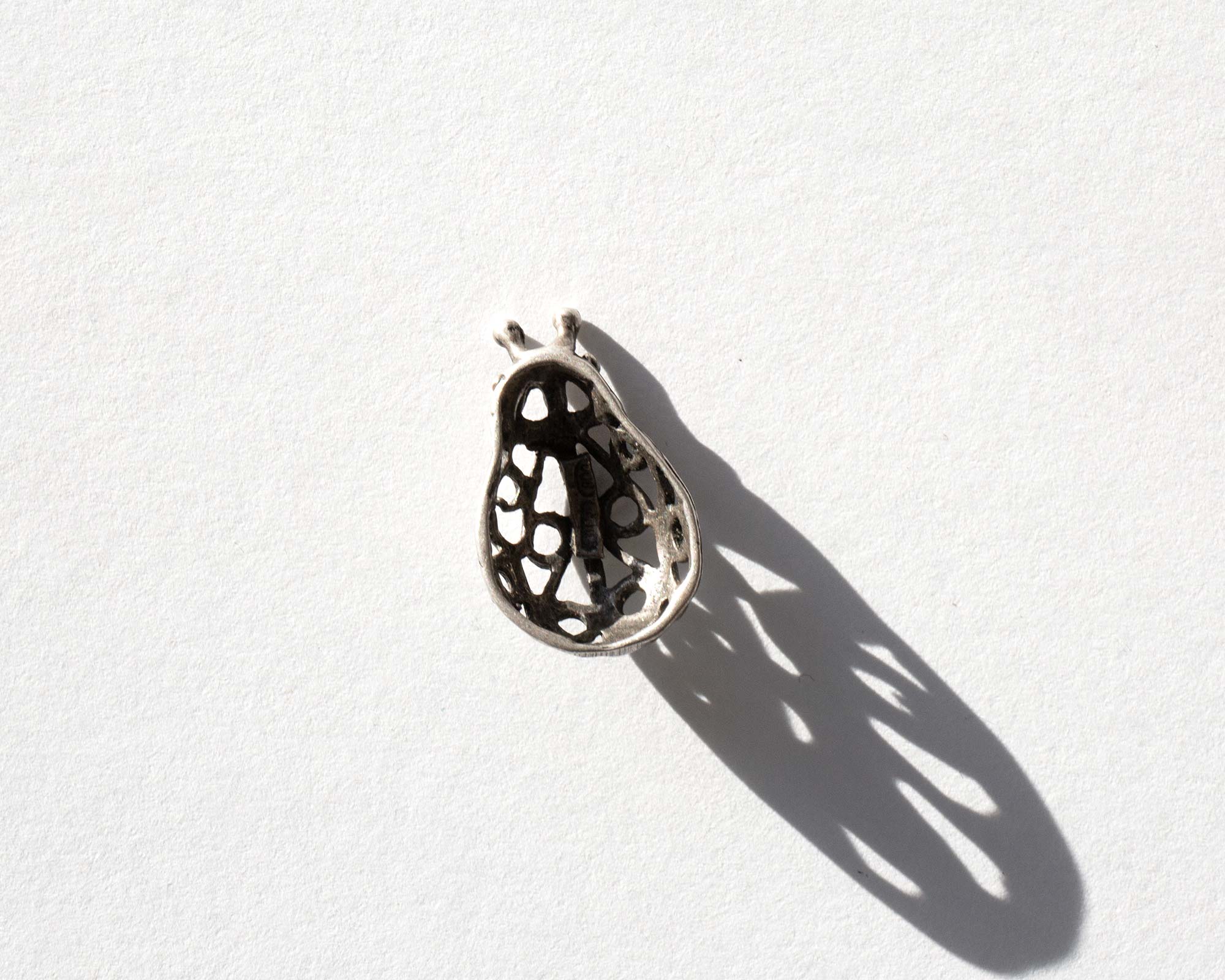 Small intricately designed ladybug wrought in 800 silver. An embodiment of positivity, the ladybug is thought to bring happiness, luck, and good fortune.