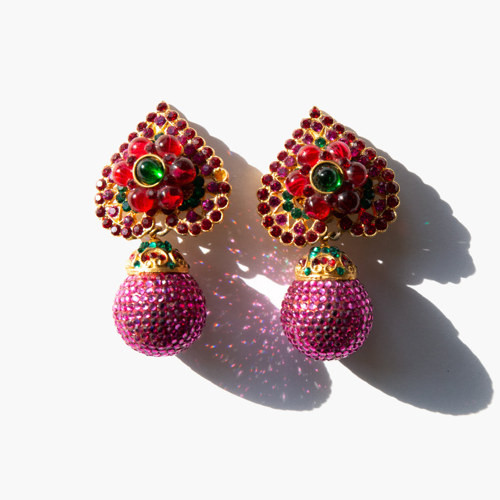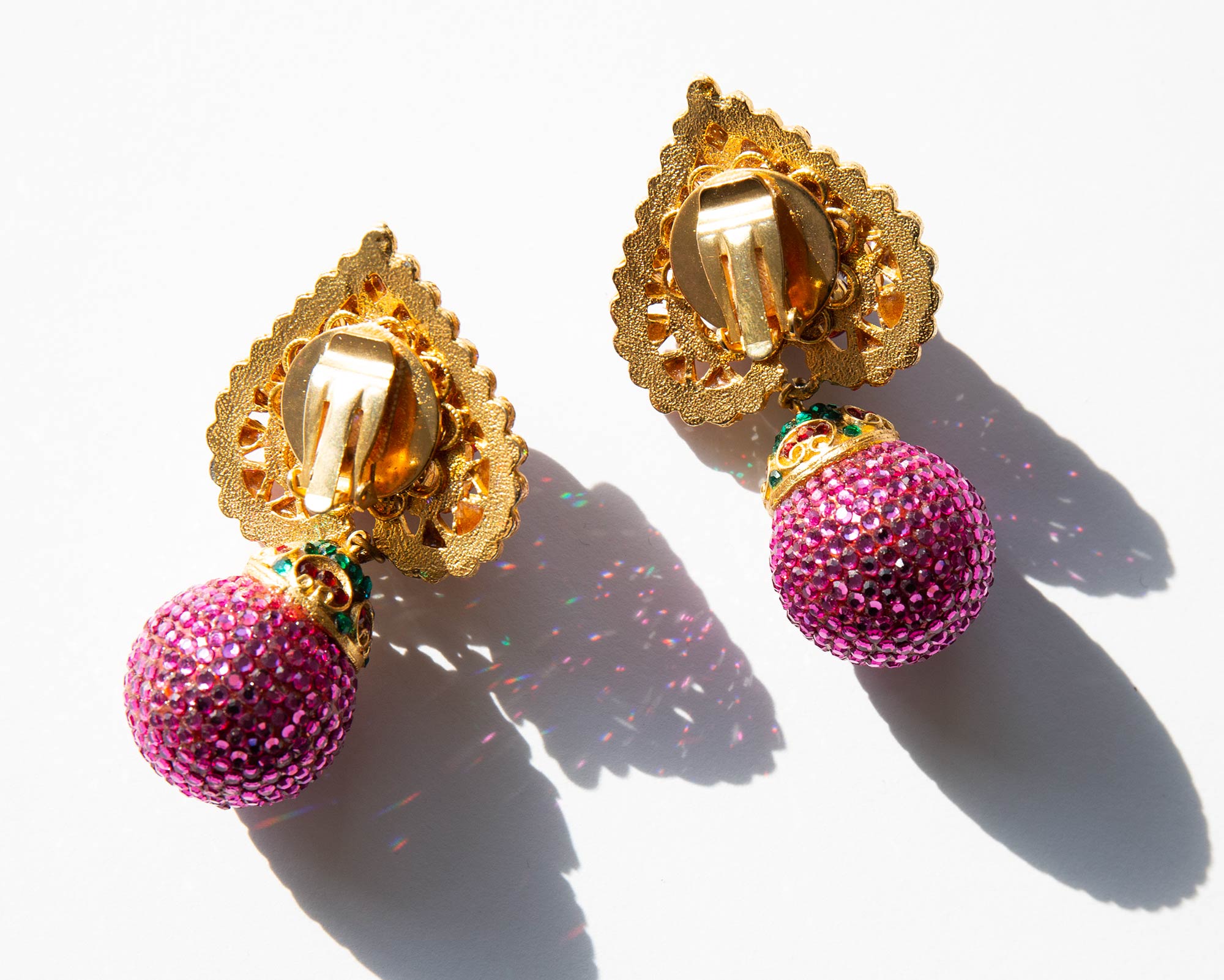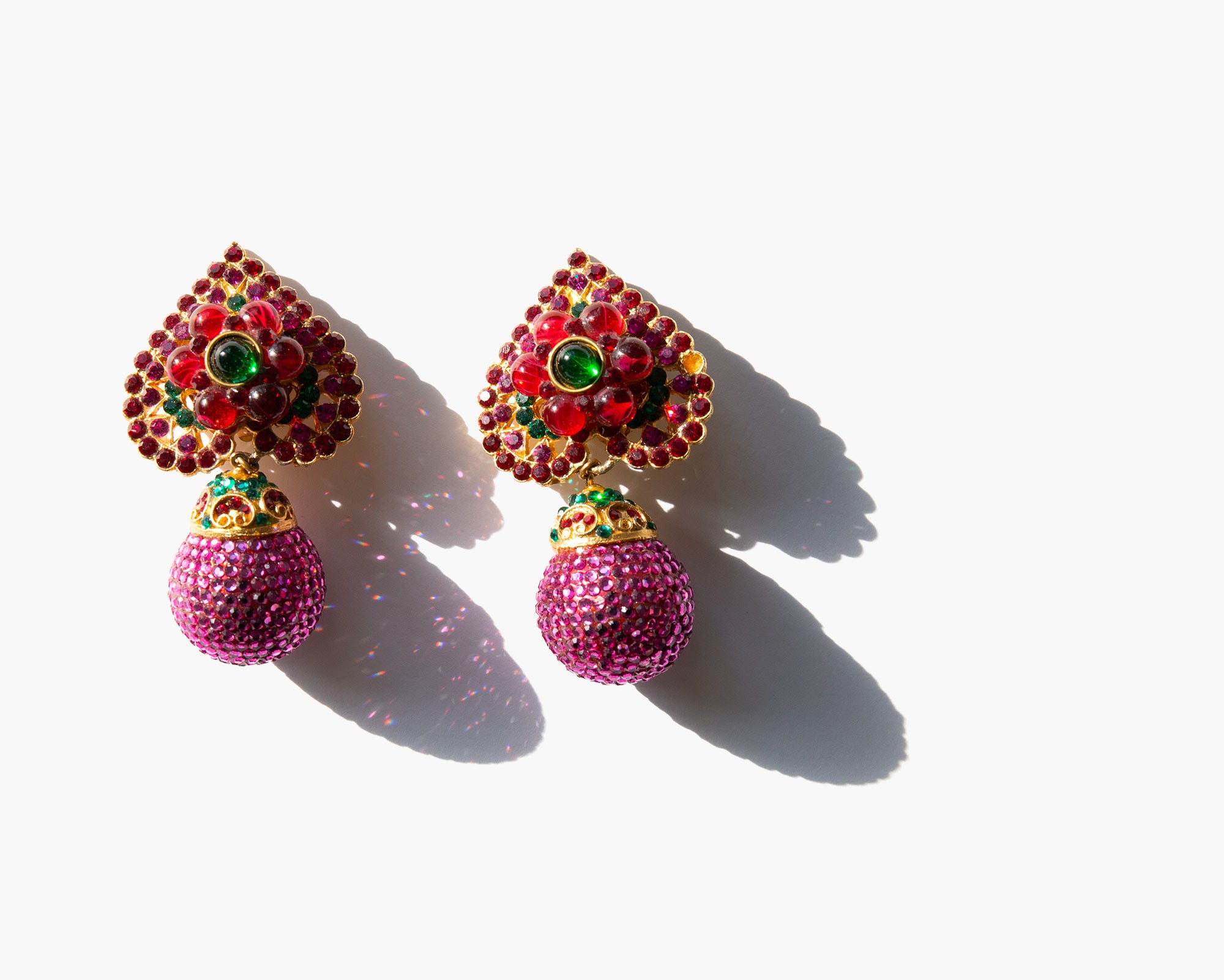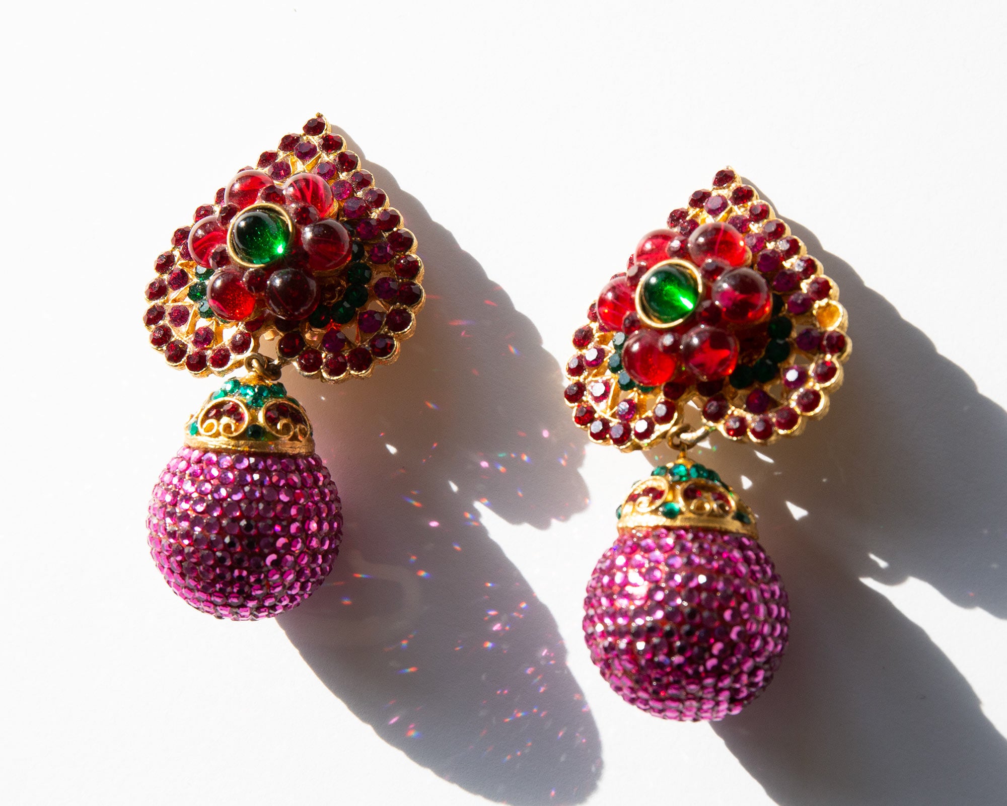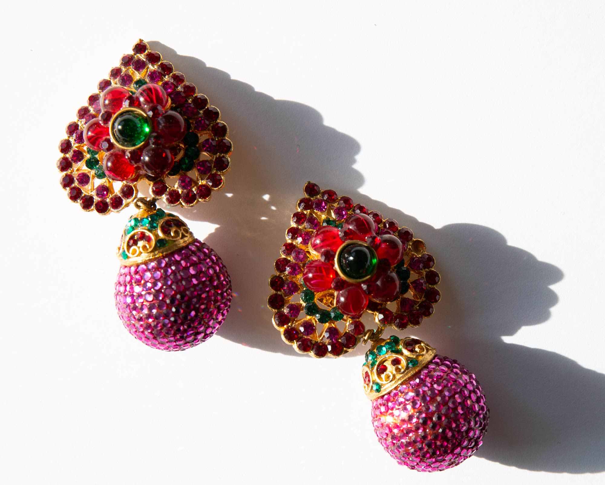 Marvelous, colorful clip-on heart earrings jeweled with rhinestones.